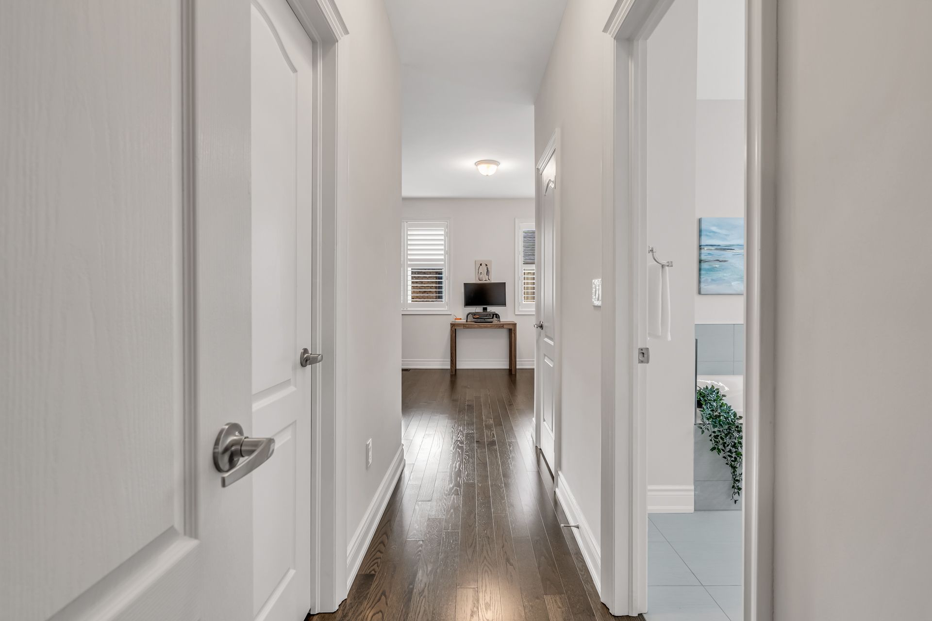 Welcome to this well maintained executive townhouse, in the prestigious glenorchy community of oakville. Built by fernbrook homes, this elegant three-bedroom, three-bathroom residence offers over 2,100 sq. Ft. Of above-grade living space and features the highly sought-after 25-foot-wide "woodcroft" floor plan-thoughtfully designed for comfort and functionality, ideal for families and professionals alike. The english manor-inspired exterior showcases timeless stucco, custom mouldings, and a charming covered front porch. Inside, the sun-filled open-concept main floor boasts hardwood flooring, tray ceilings, and a spacious living and dining area-perfect for both entertaining and everyday living. The chef-inspired kitchen is appointed with quartz counter-tops, upgraded cabinetry, stainless steel appliances, heated floors, includes breakfast eat-in area and a centre island with an extended breakfast bar, offering ample storage and workspace. Great room provides a walkout to a fully fenced backyard-ideal for summer gatherings and outdoor enjoyment. Upstairs, the generous primary suite features a large walk-in closet and a spa-like five-piece en-suite complete with walk in quartz vanities and a frame less glass shower. Two additional well-sized bedrooms, each with closet, share a modern four-piece bath, with one bedroom offering a dedicated study nook. A convenient second-floor laundry room, smooth ceilings throughout, and carpet-free flooring enhance the home's modern appeal. Ideally located across from a park and close to top-rated schools, including dr. David r. Williams public school, as well as scenic trails, shopping, oakville trafalgar memorial hospital, major highways (403/407/401), and the go station. An exceptional opportunity to own a beautifully upgraded and stylish townhouse in one of oakville's most sought-after neighbourhoods. Please refer to the feature sheet for a complete list of upgrades and details.