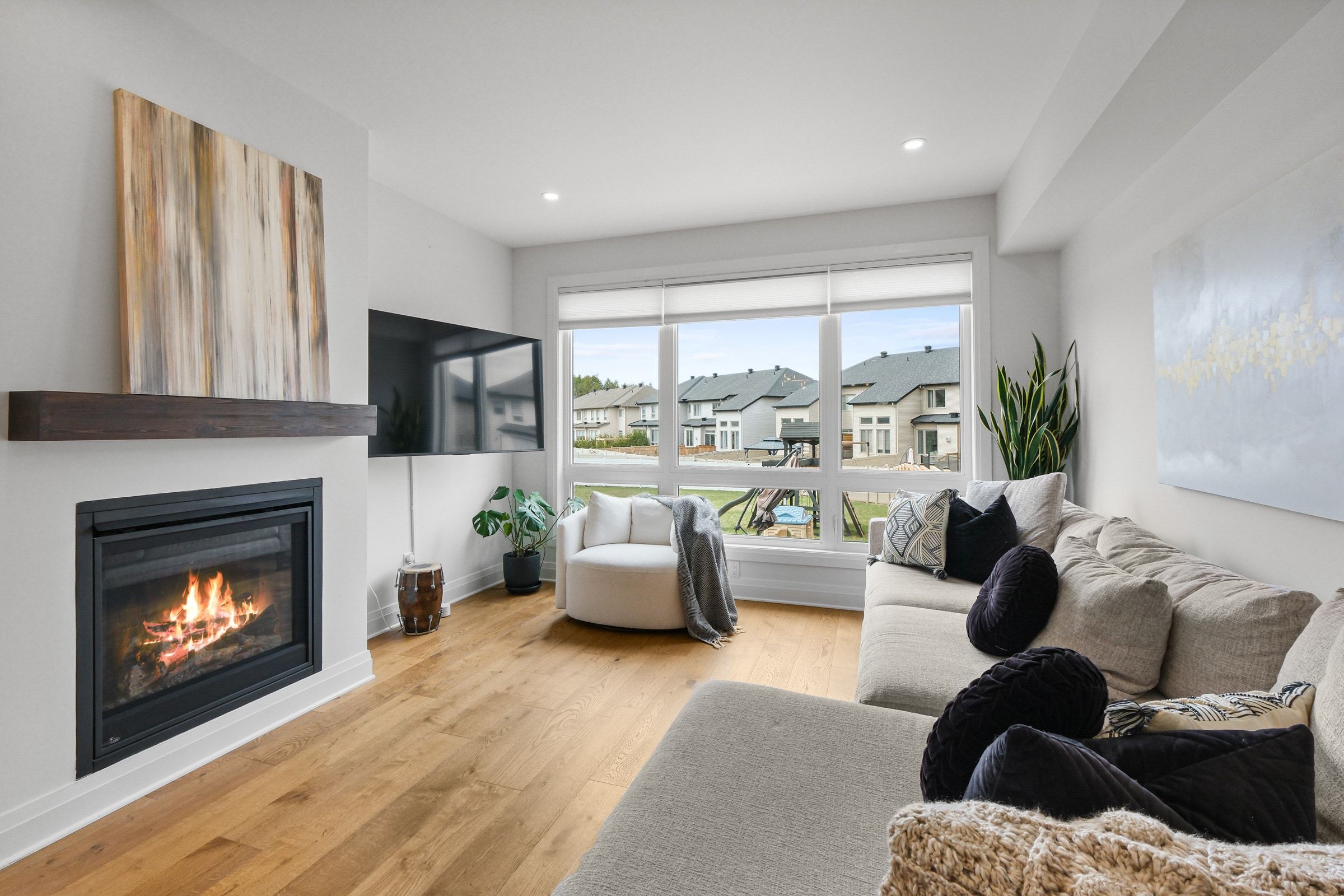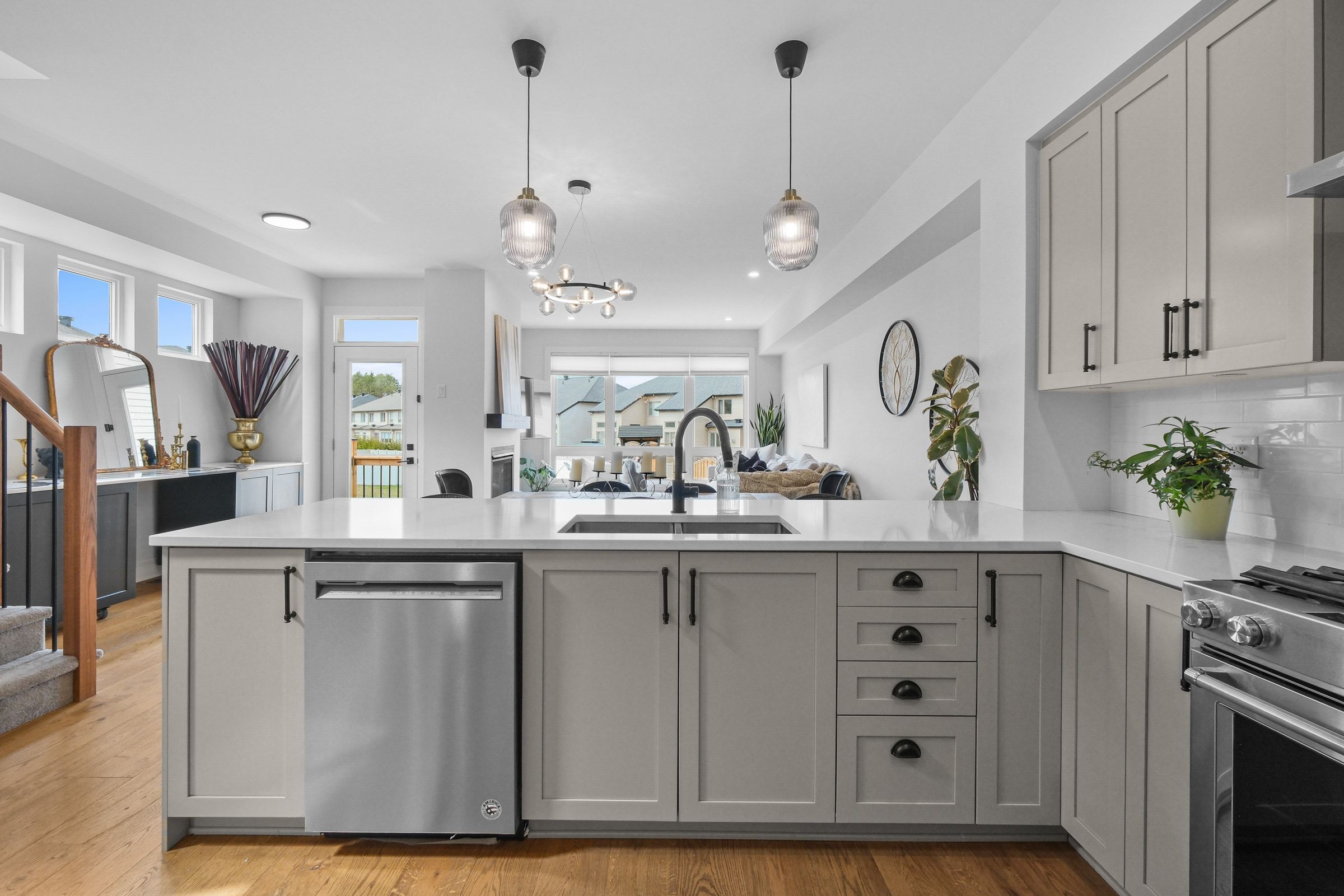 Welcome to this beautiful richcraft end unit townhome set on a large premium pie shaped lot, offering the perfect blend of space, style, and functionality. Step inside to a bright tiled foyer that seamlessly transitions into stunning large plank hardwood flooring, flowing throughout the open-concept main living area. The kitchen, family room, and dining space are thoughtfully designed for both everyday living and entertaining. Extra side windows flood the home with natural light, creating a warm and inviting atmosphere. The kitchen features quartz countertops, walk in pantry, stainless steel appliances, a five-burner gas stove-perfect for the home chef. Upgrade hardware and light fixtures throughout pull the space together. Upstairs, you'll find two bedrooms, a 4-piece bathroom, and convenient second-floor laundry room. The spacious primary retreat offers not one, but two walk-in closets, along with a luxurious 5-piece ensuite complete with a separate soaker tub and glass shower. The finished basement provides versatile additional living space-ideal for a family room, play area, home gym, or office. Step outside to your massive backyard, extending approximately 160 feet deep-a rare find! Enjoy summer days on the landscaped interlock patio, with plenty of room to relax, entertain, or create your dream outdoor oasis. The front of the home features an extended interlock walkway, offering additional parking and great curb appeal. This is a rare opportunity to own a bright, spacious home on an oversized lot. Don't miss your chance to call this beautiful property home.