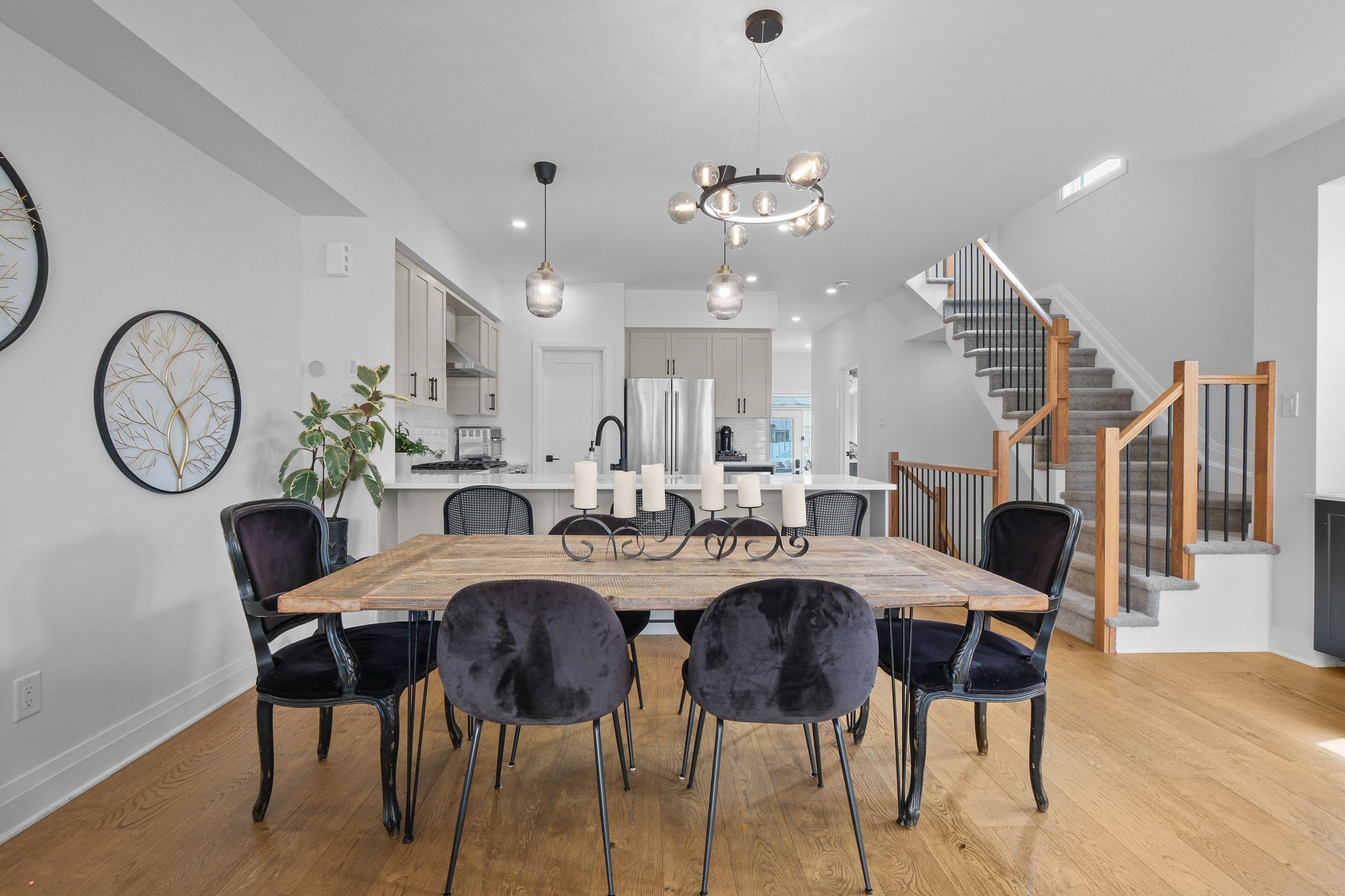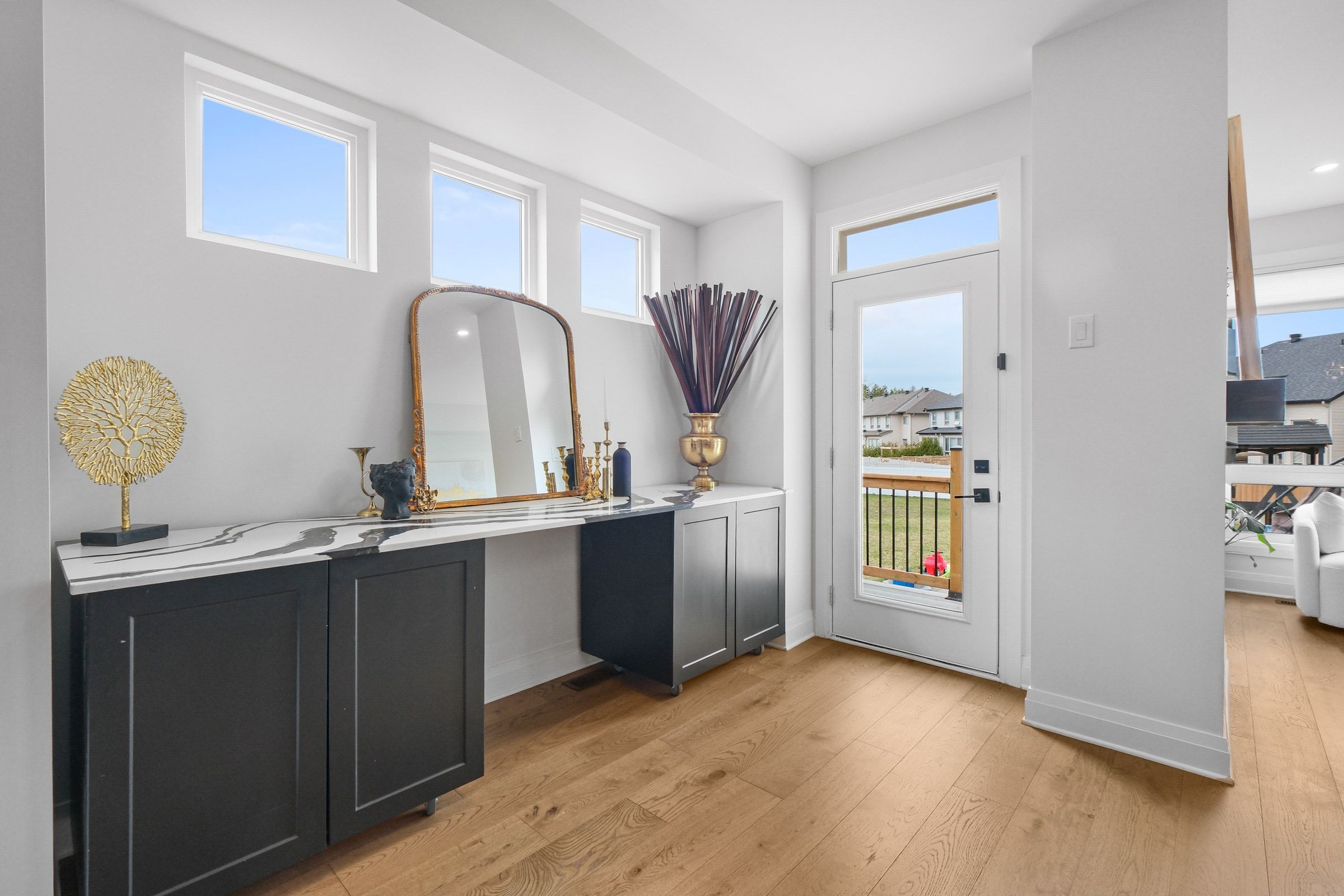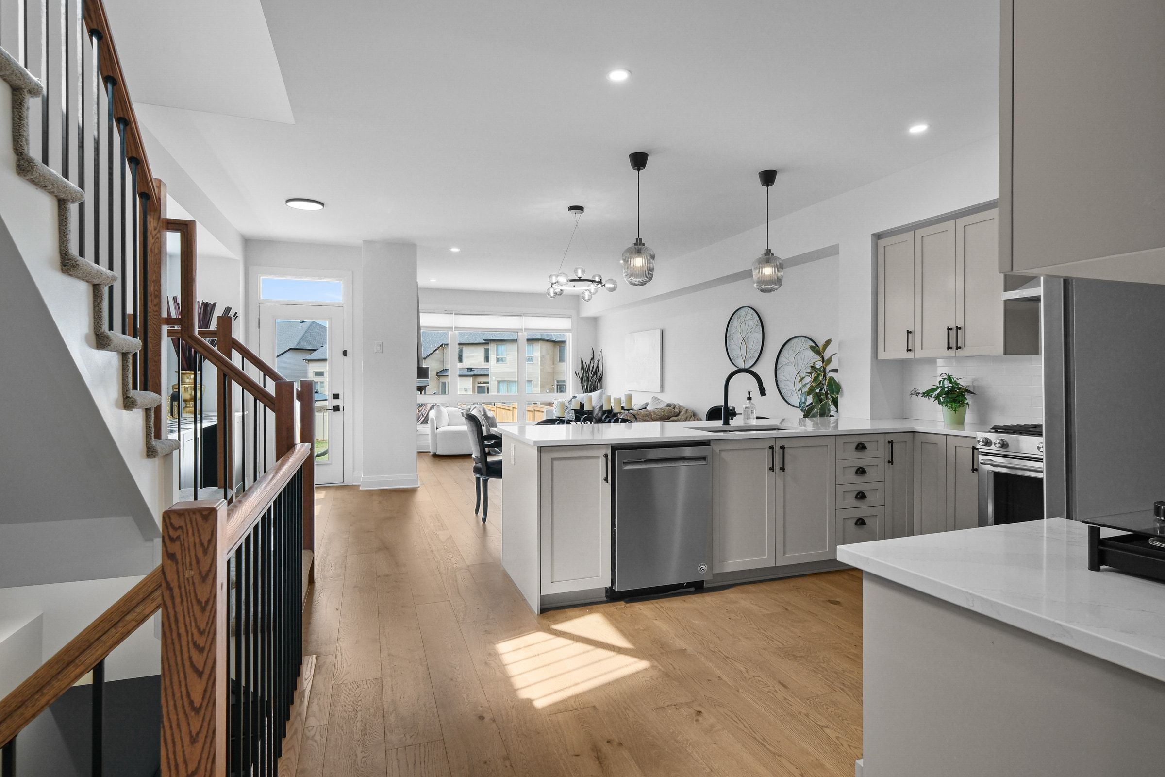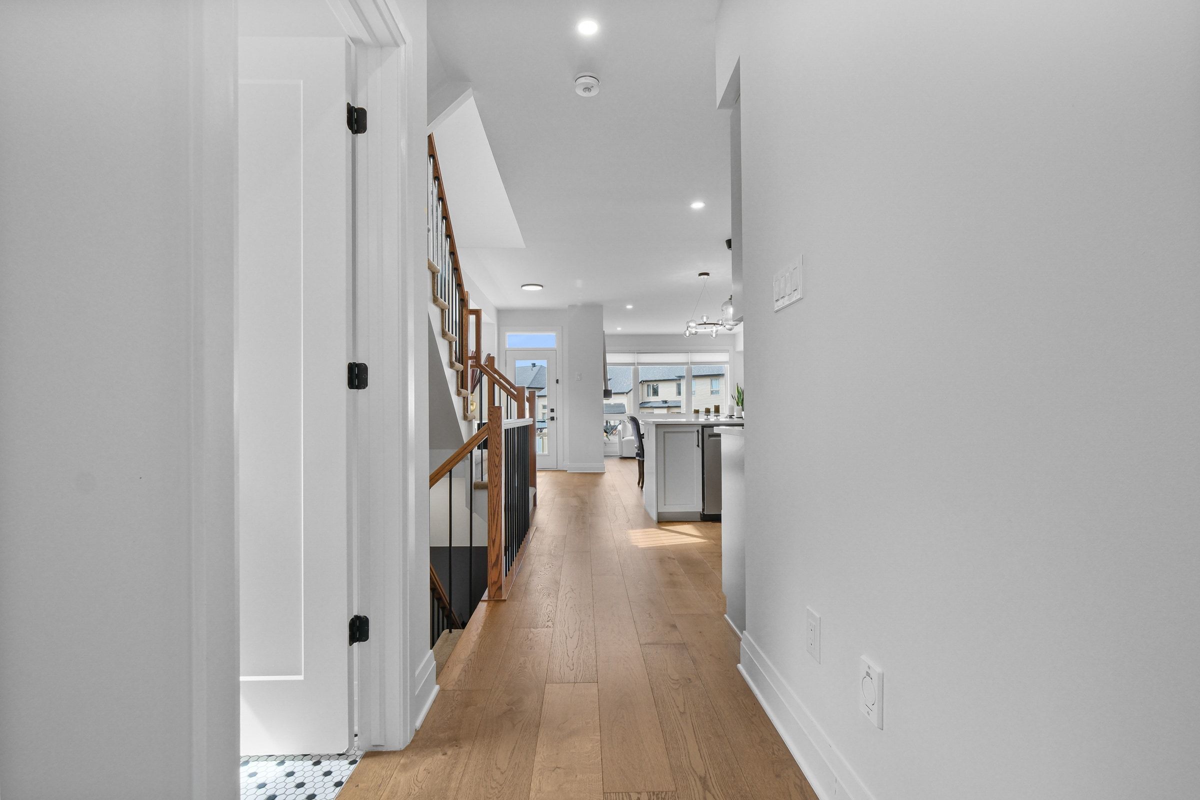 • Bright foyer and large plank hardwood flooring in an open-concept layout.