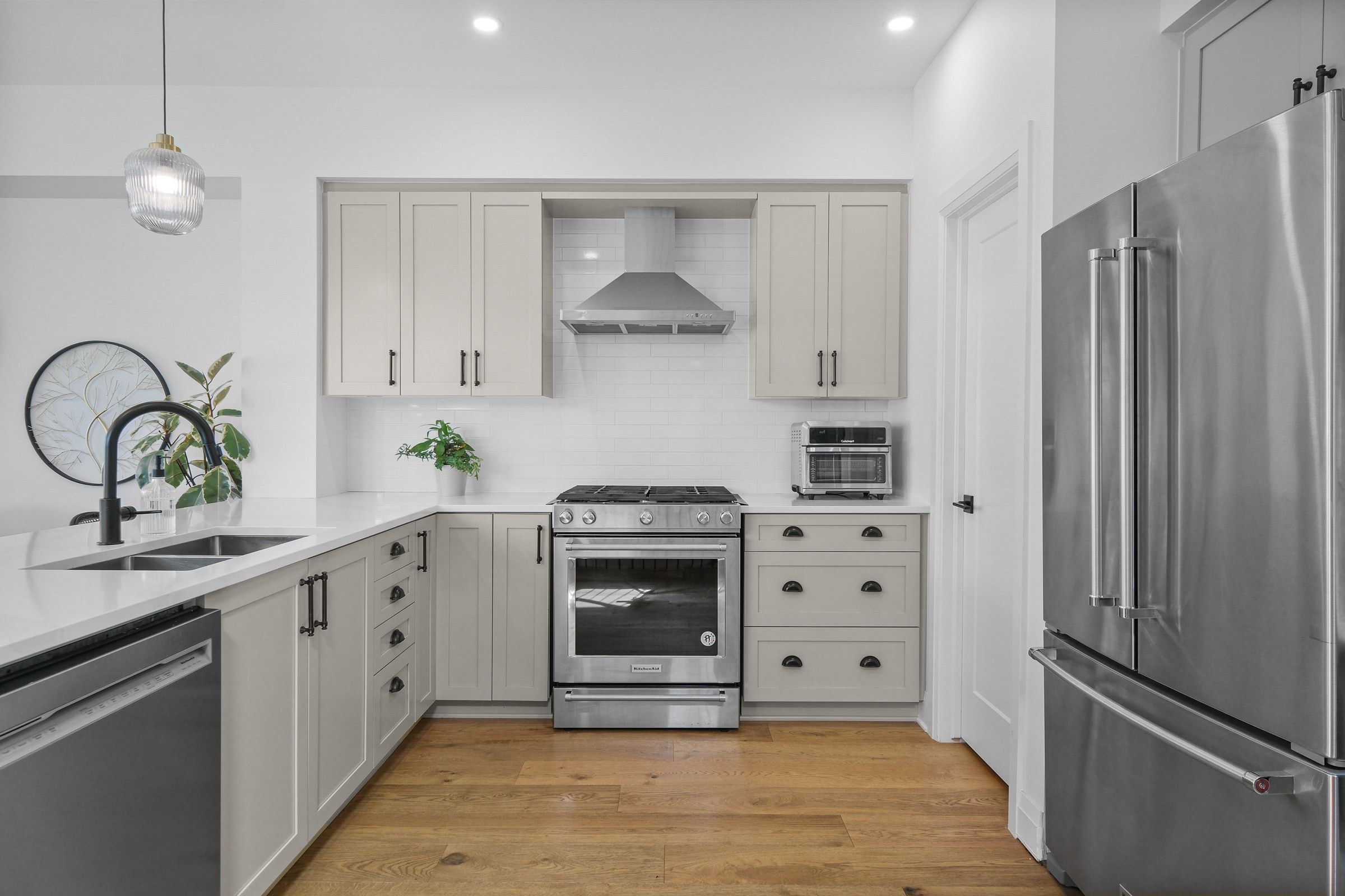 • Kitchen features quartz countertops, stainless steel appliances, and a walk-in pantry.