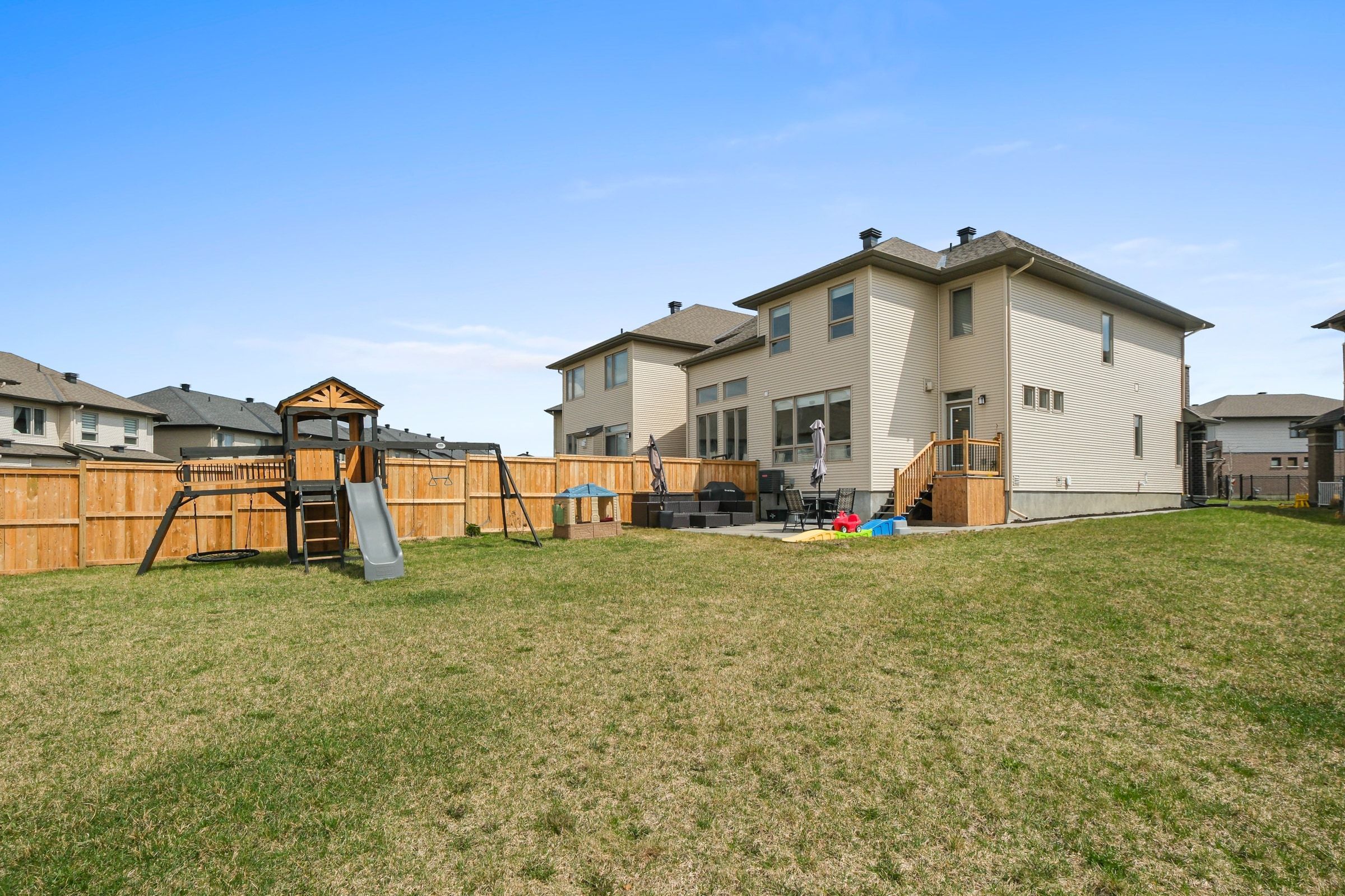 • Massive backyard with landscaped patio, perfect for relaxation and entertaining.