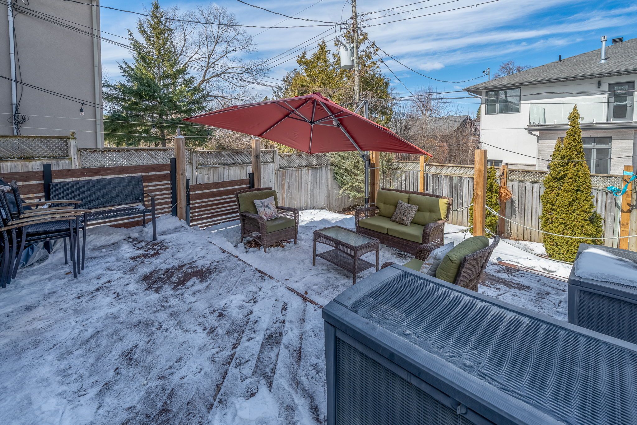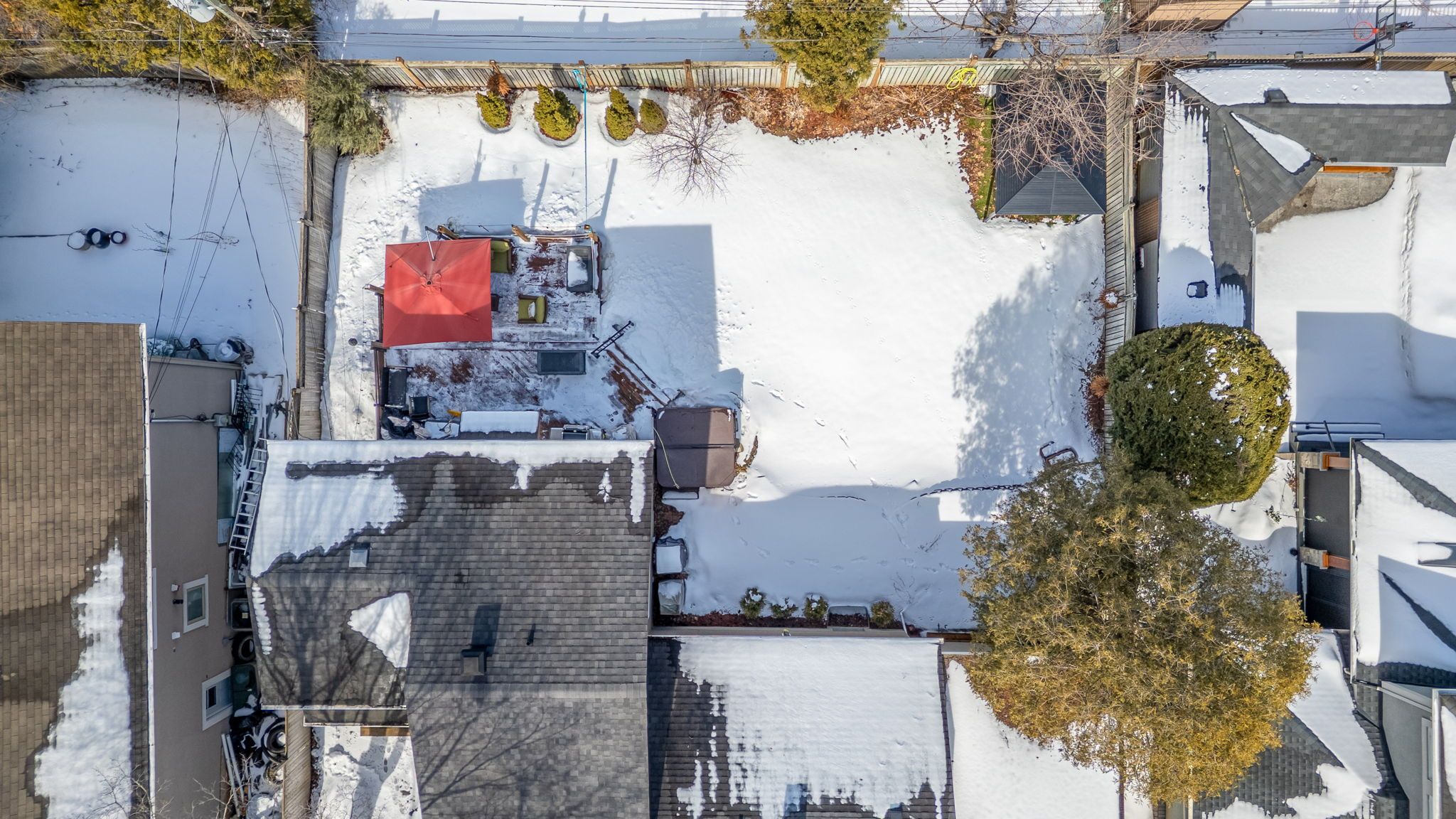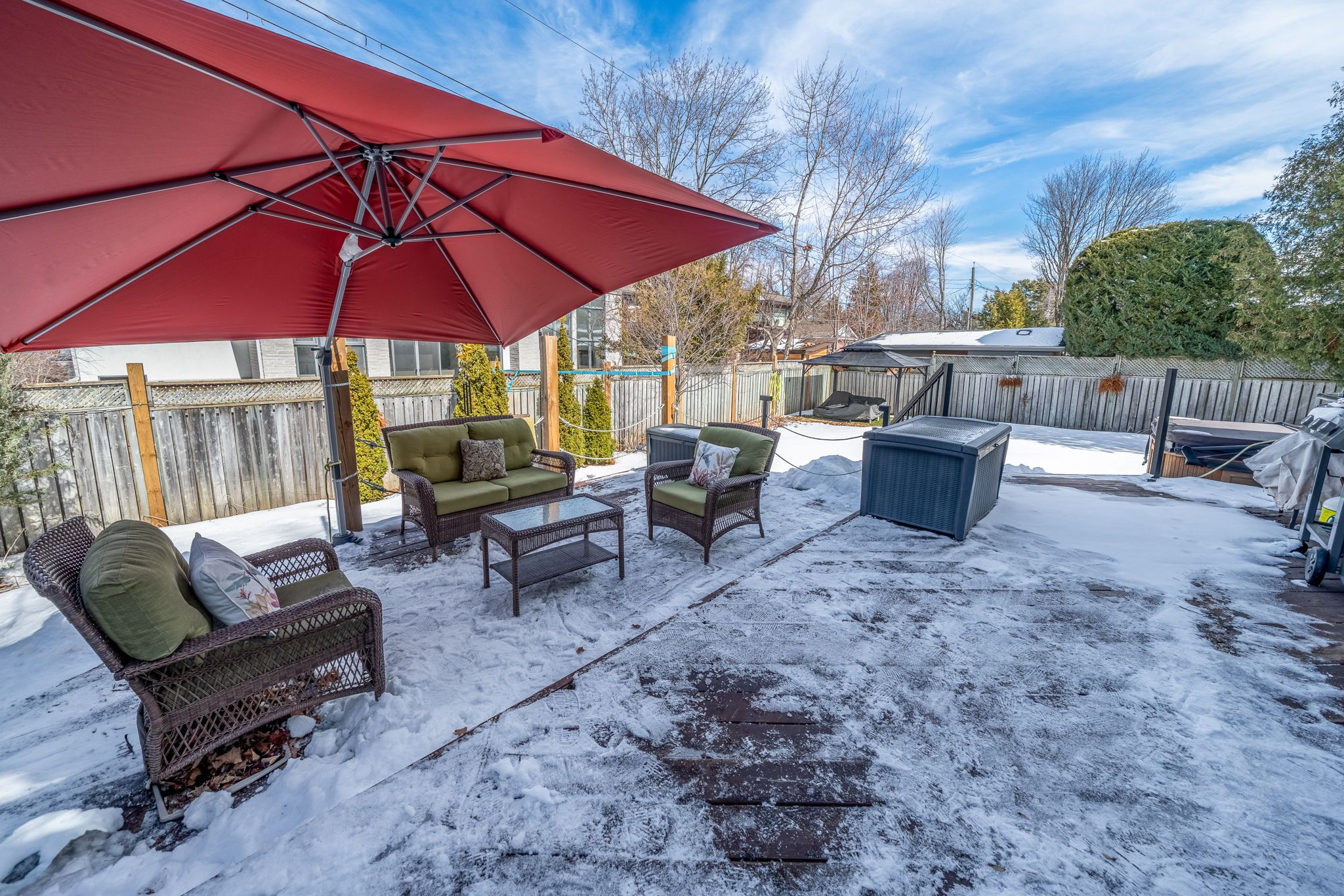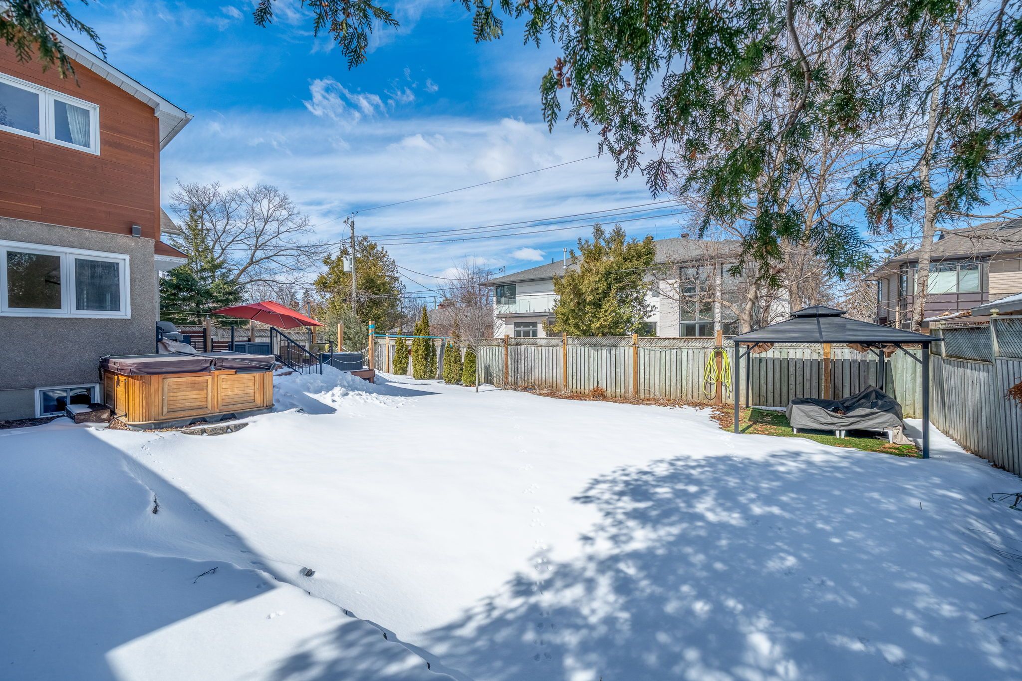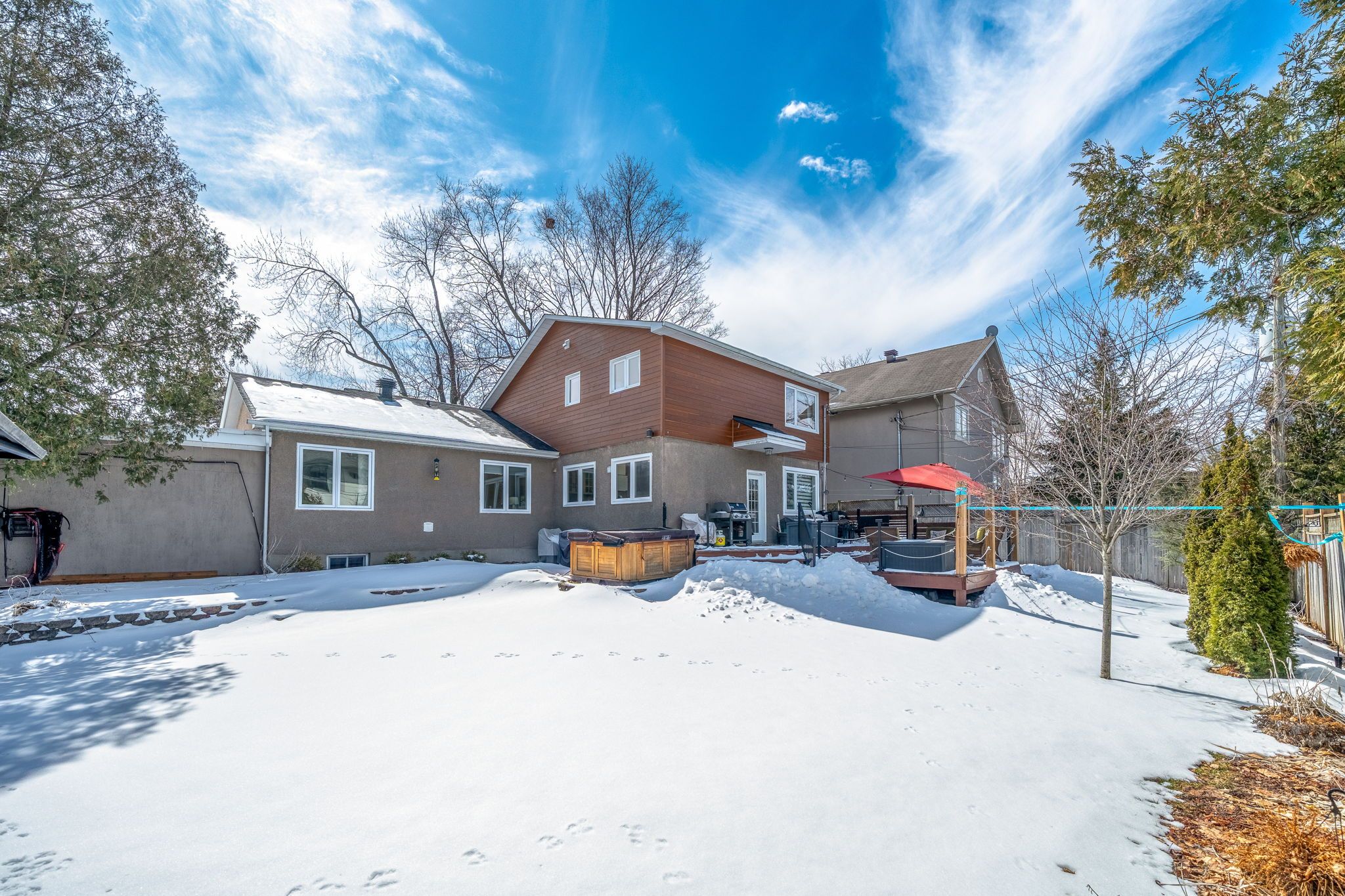 • Spacious lot with a fenced backyard, deck, and hot tub.