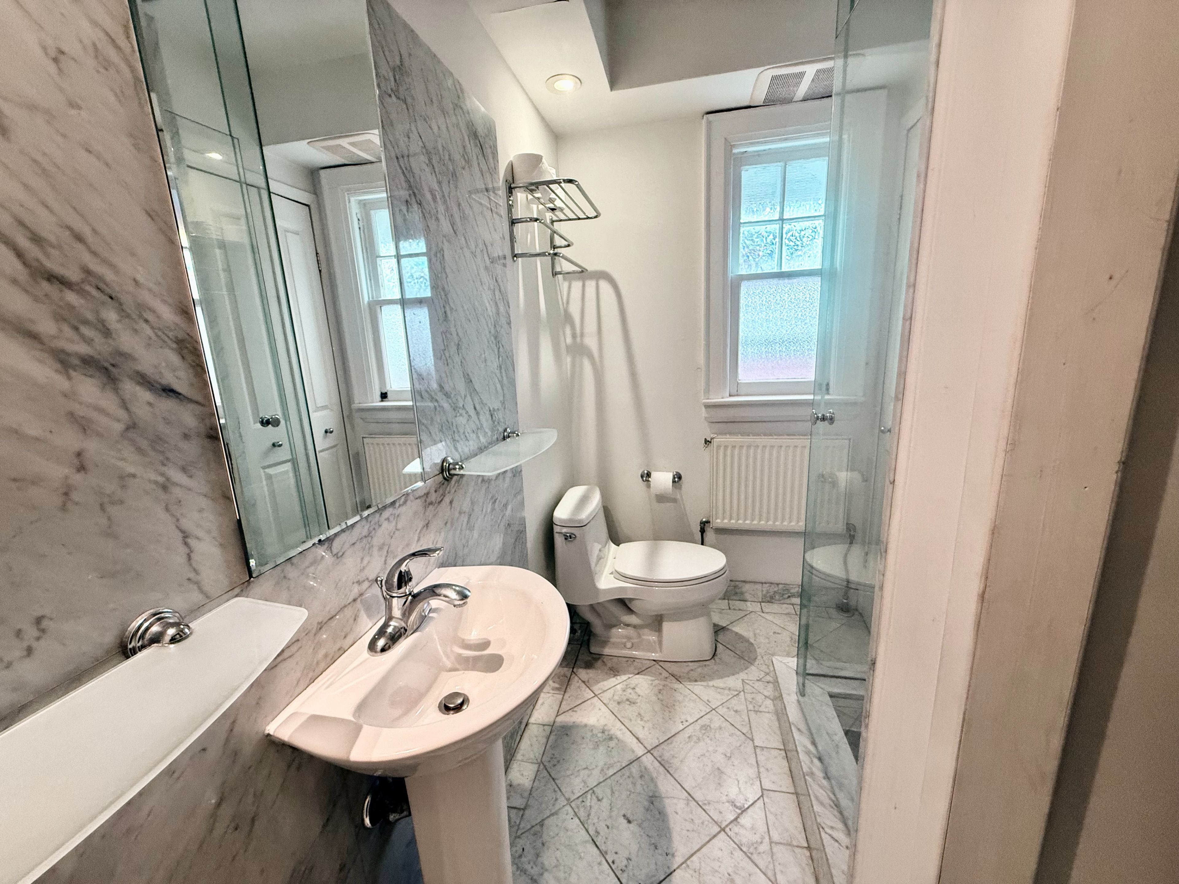 • Original character showcased by a beautiful jade marble fireplace.