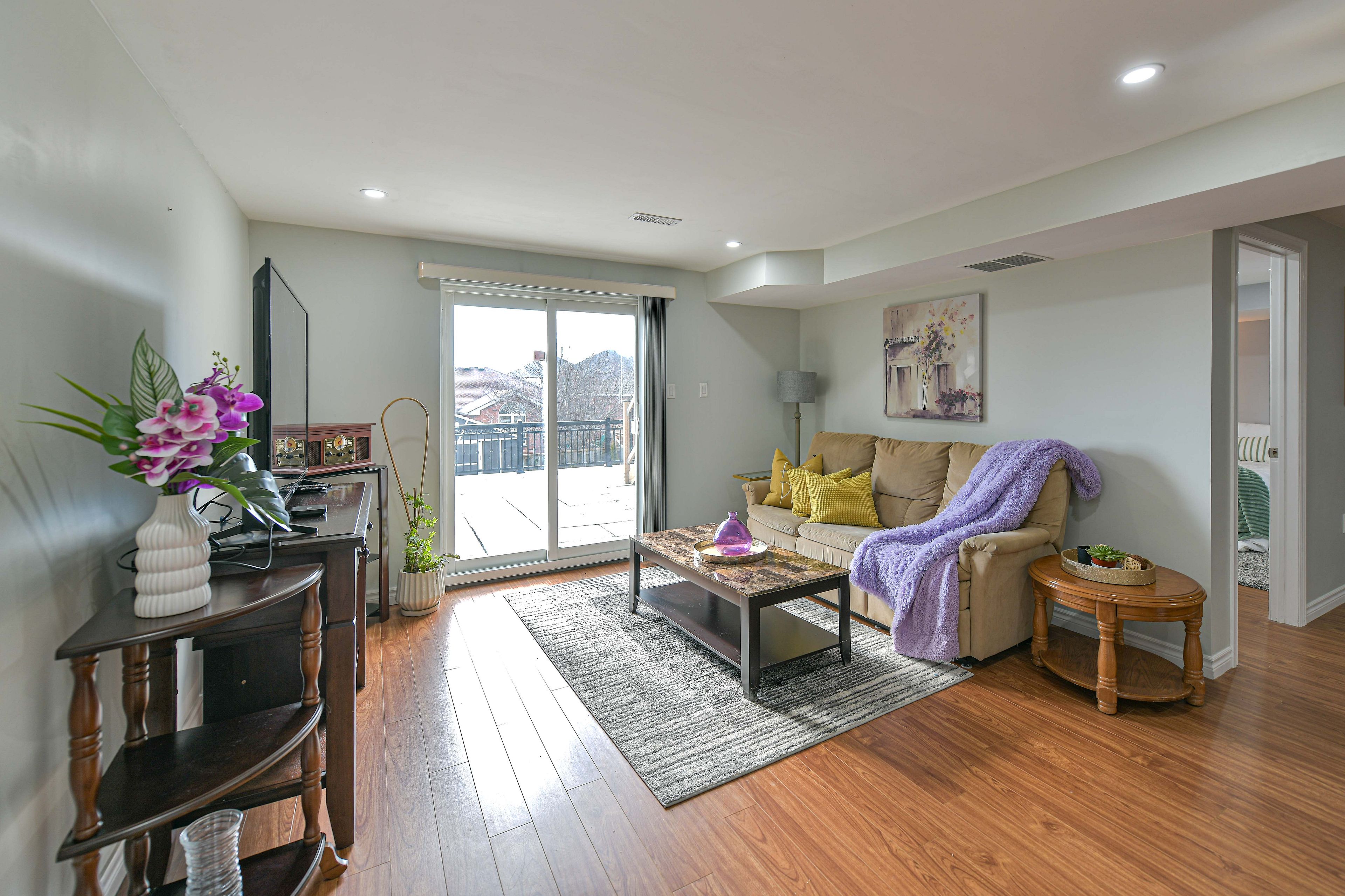 • Lower level features 3 bedrooms, kitchen, living room, and garden access.