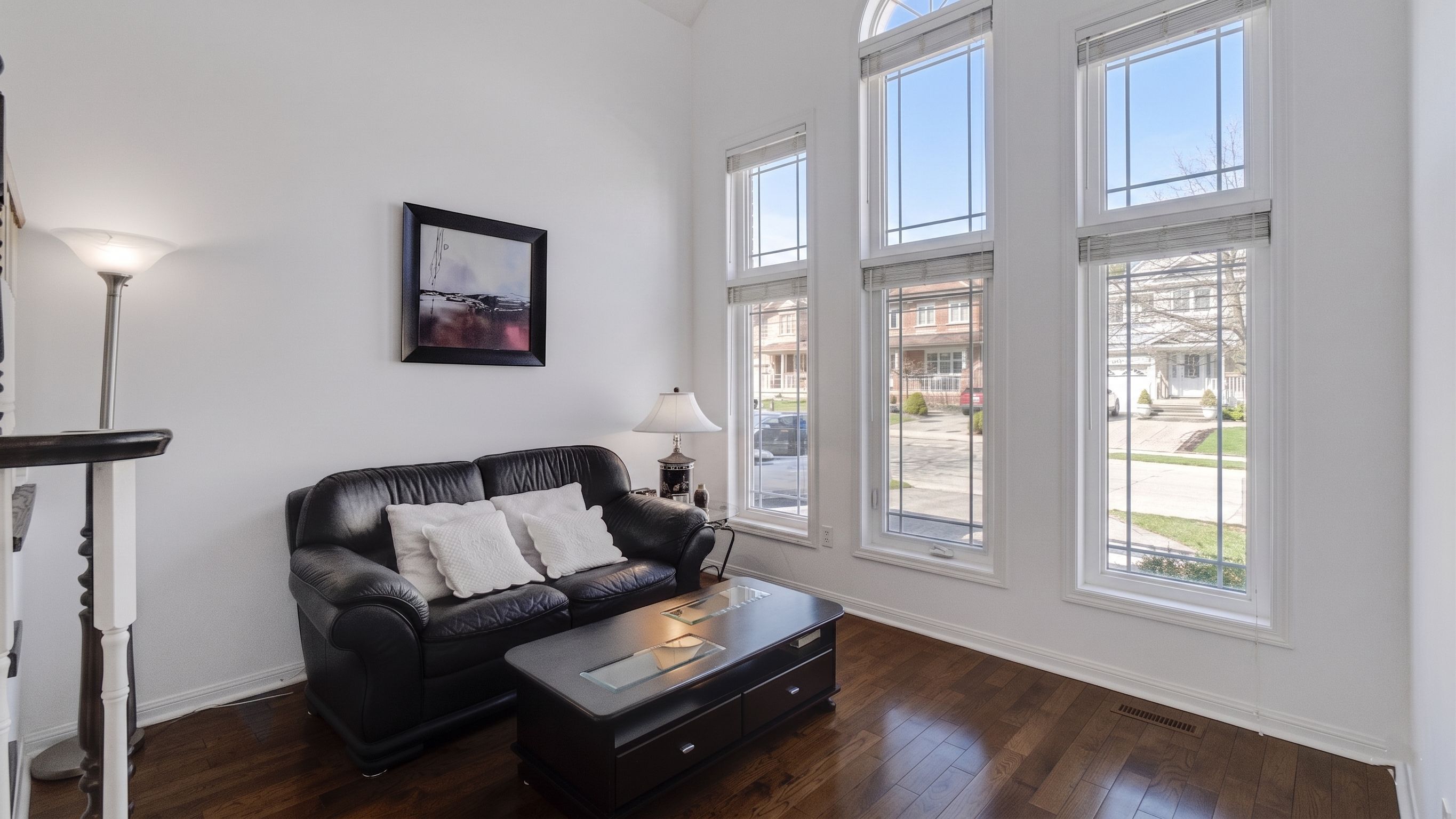 • Modern open concept design with high cathedral ceiling and sun-filled living room.