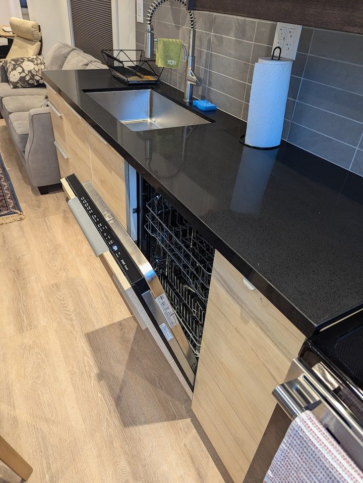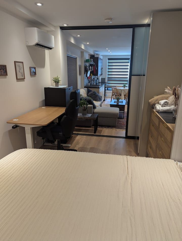• Spacious living area and fully equipped kitchen with built-in appliances.