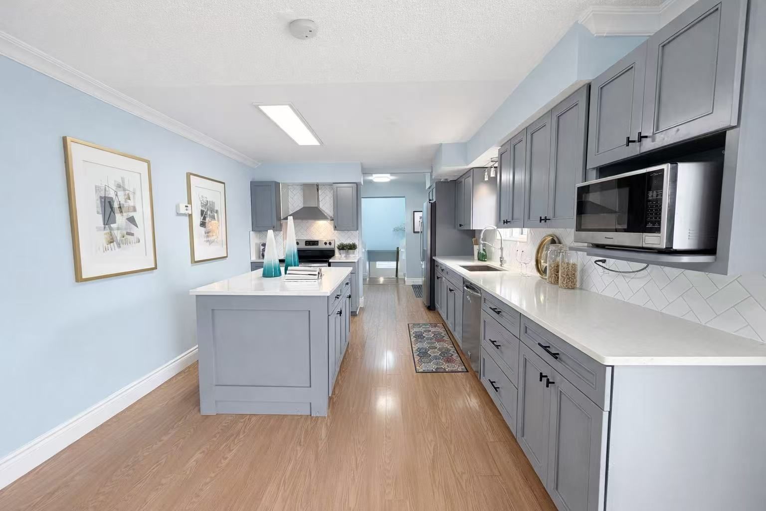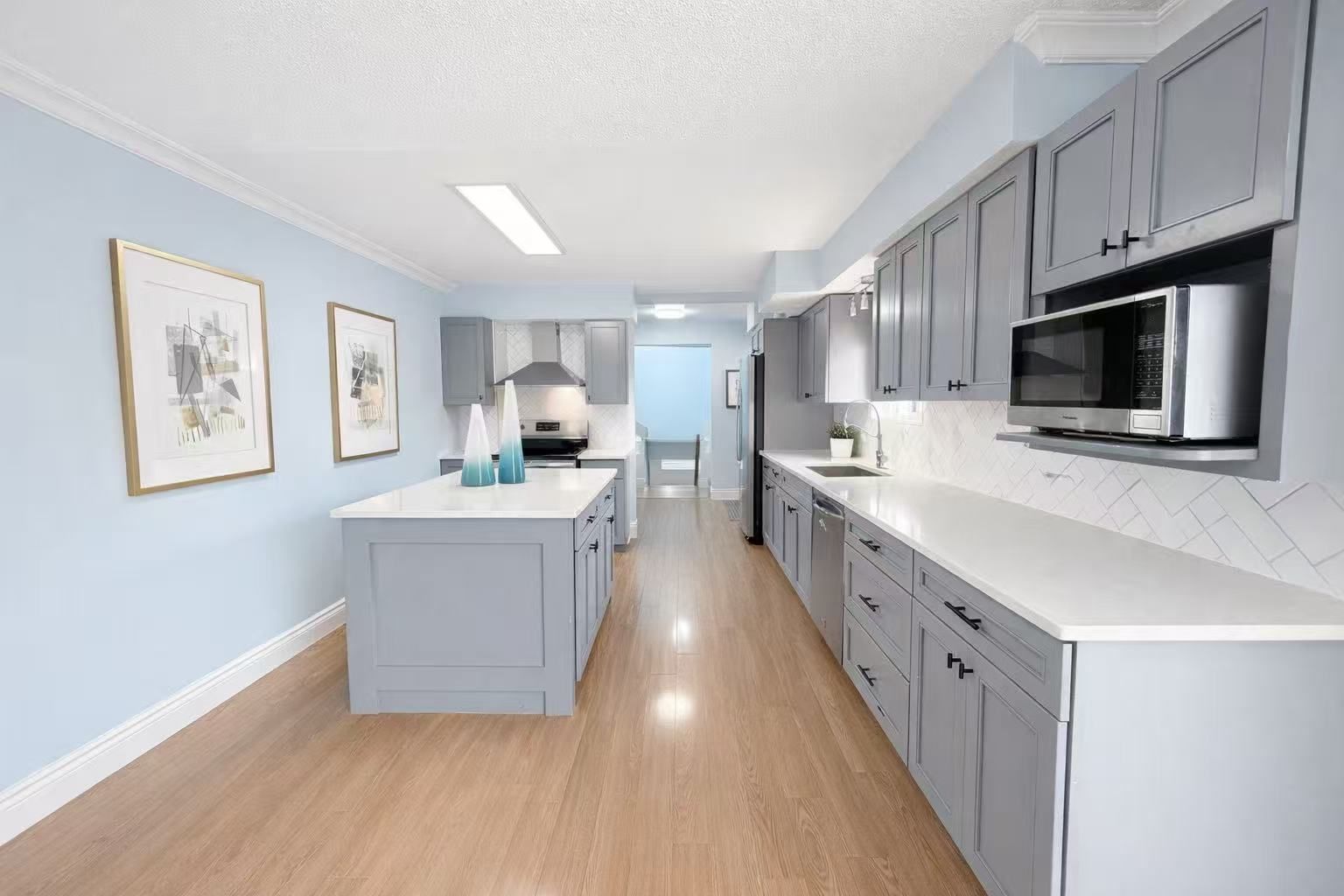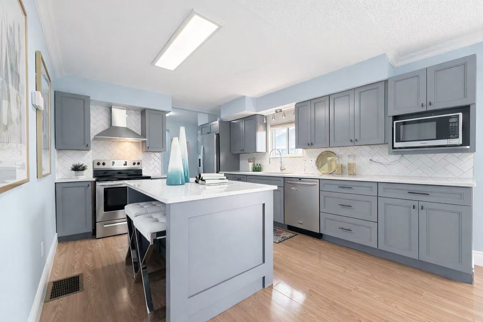 • Modern kitchen equipped with quartz countertops and stainless steel appliances.