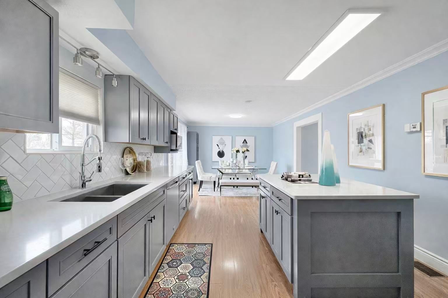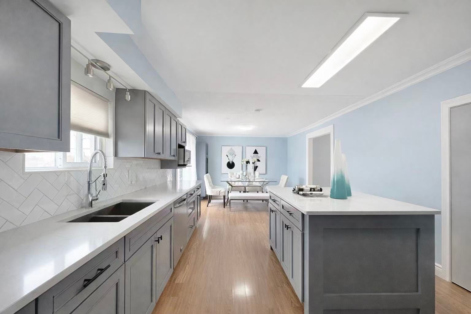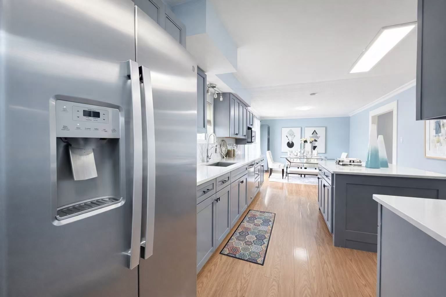 • Modern kitchen equipped with quartz countertops and stainless steel appliances.