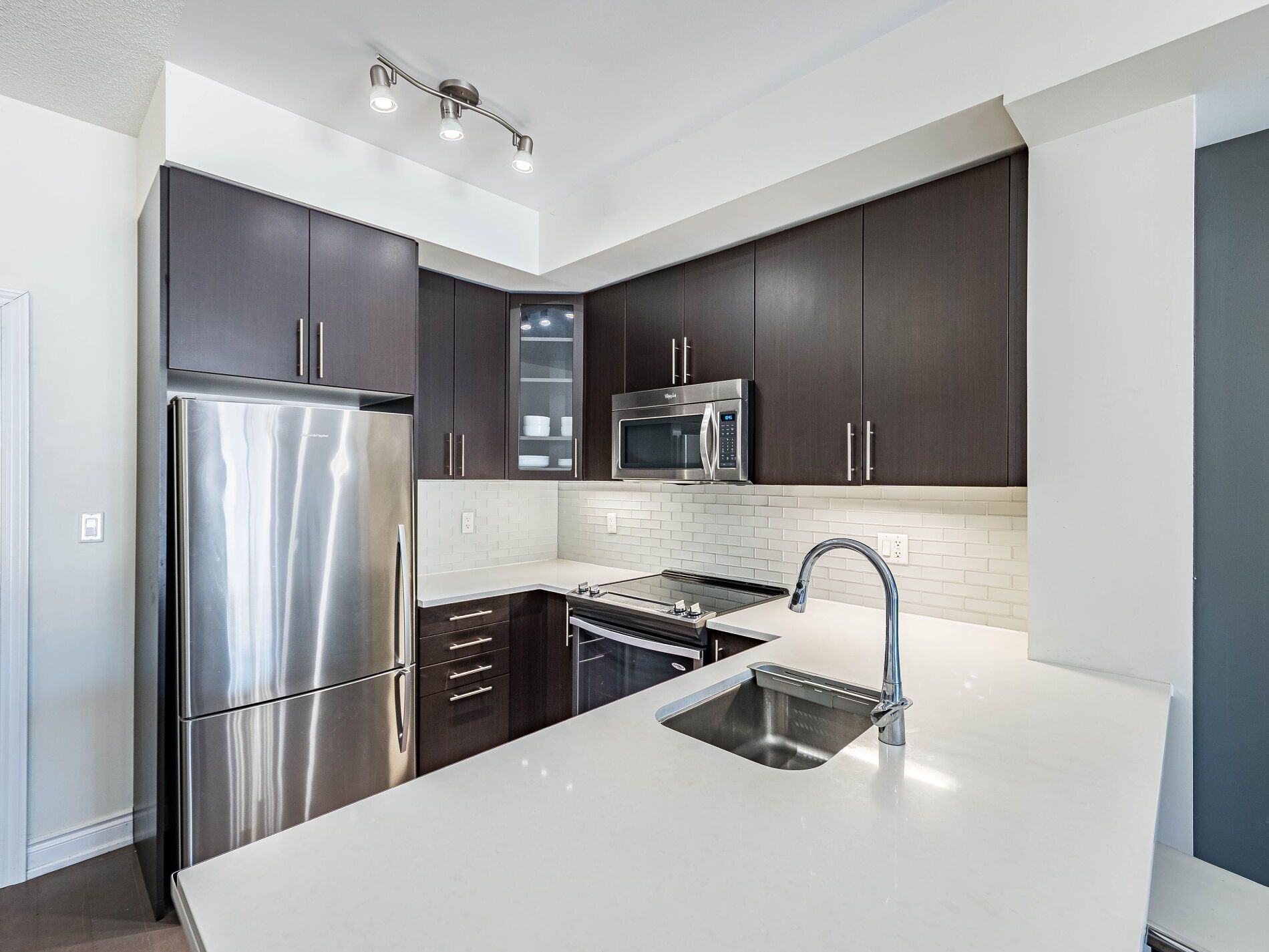 • Modern kitchen with stainless steel appliances and quartz countertops.