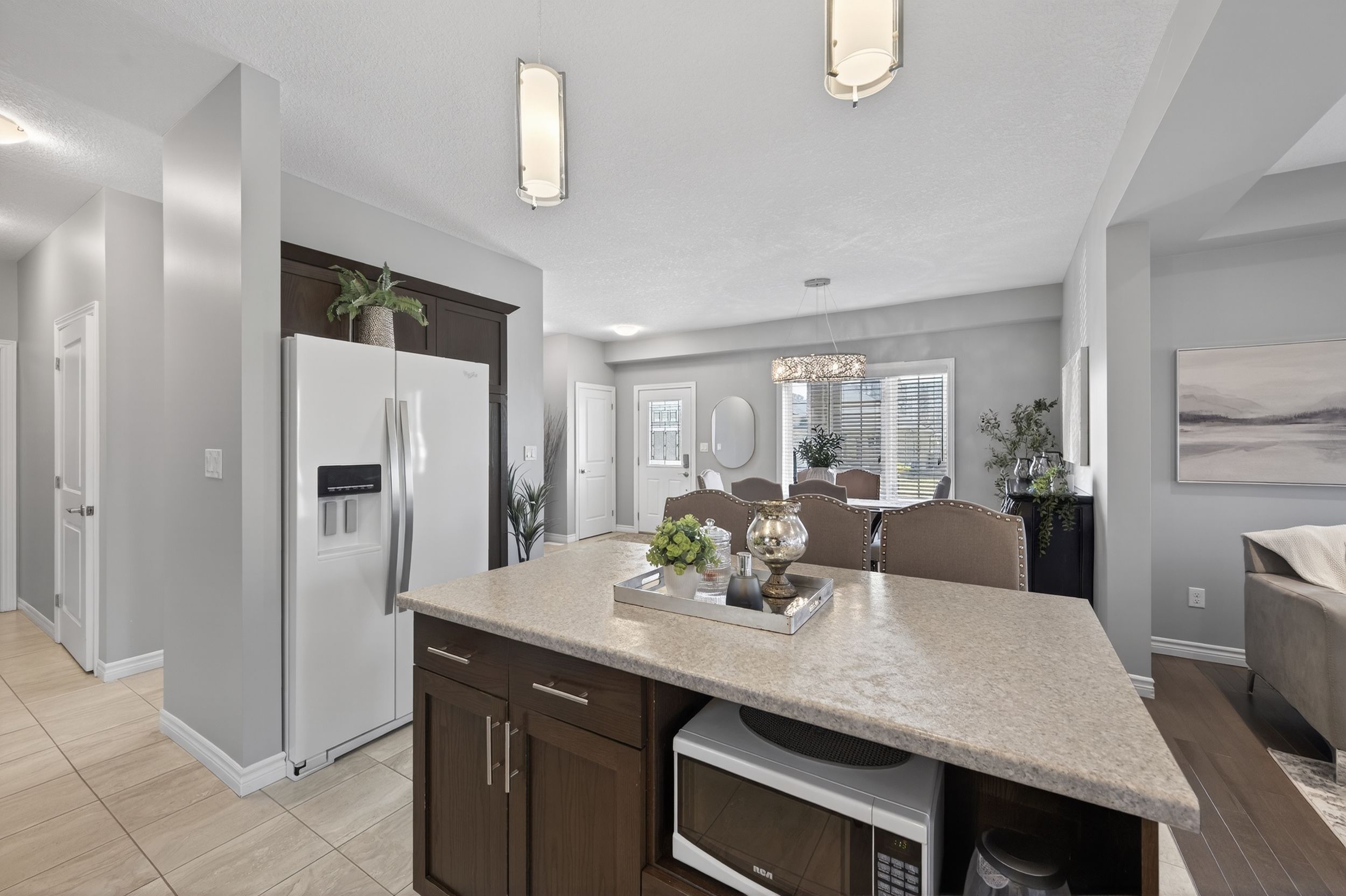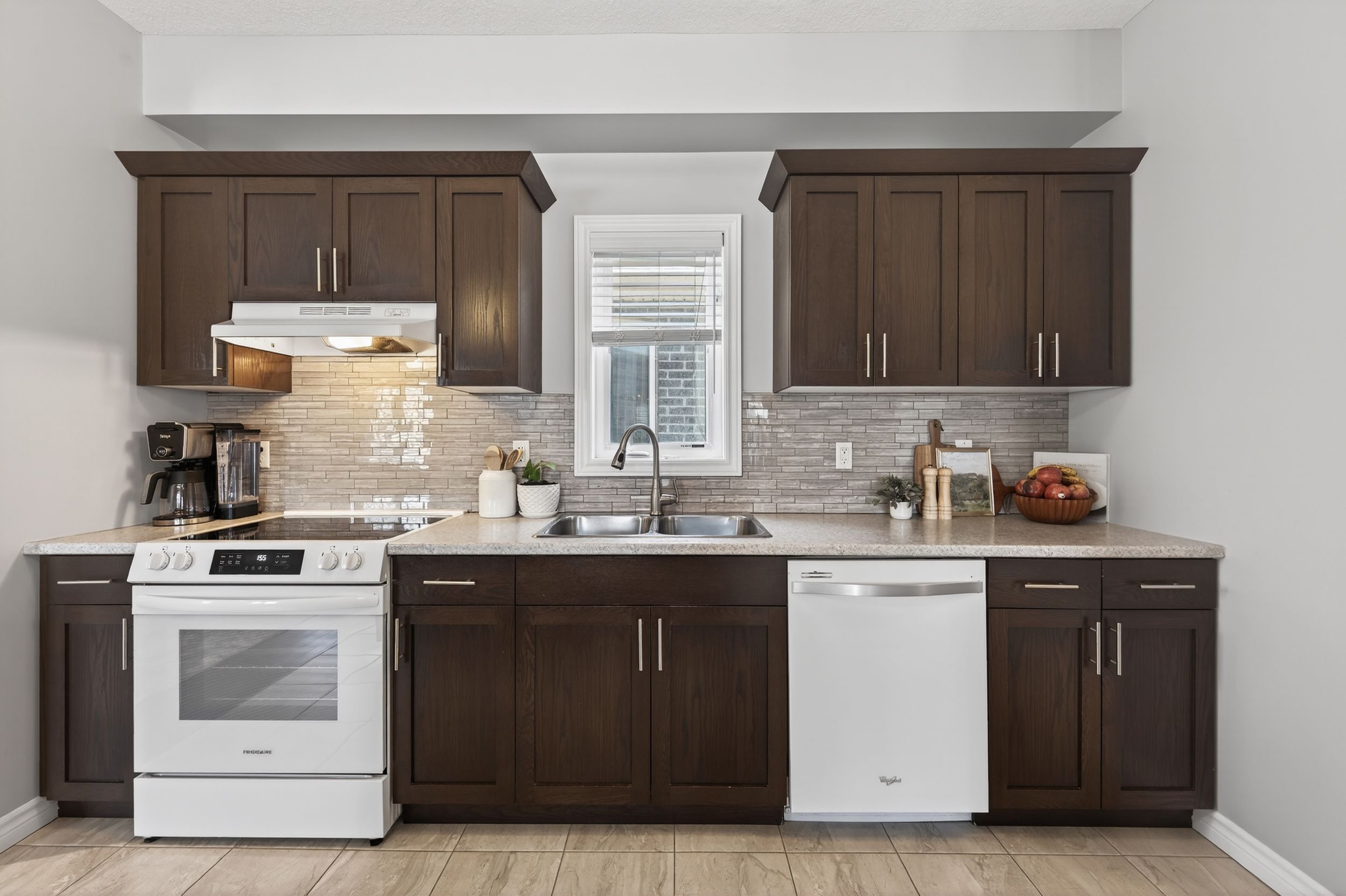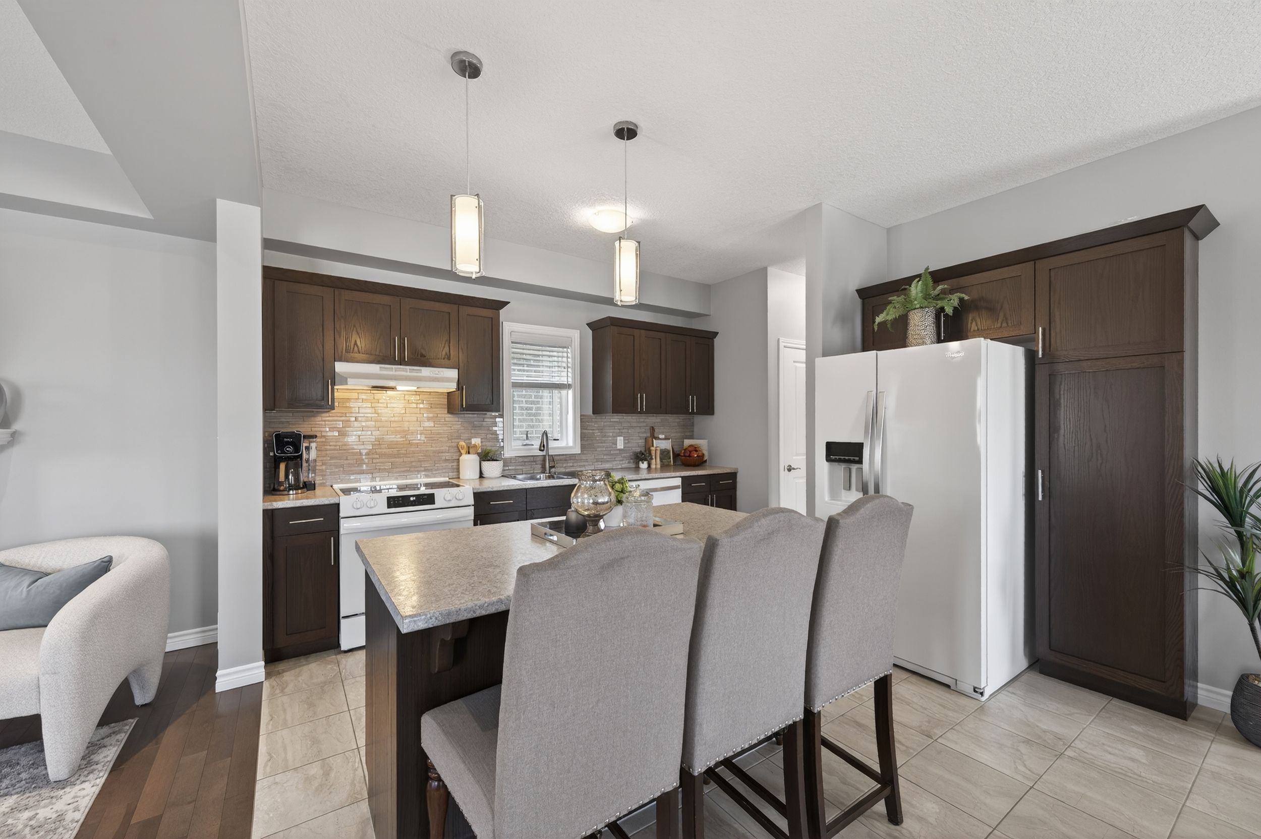 • Large kitchen with ample storage, tiled backsplash, and dine-in island.
