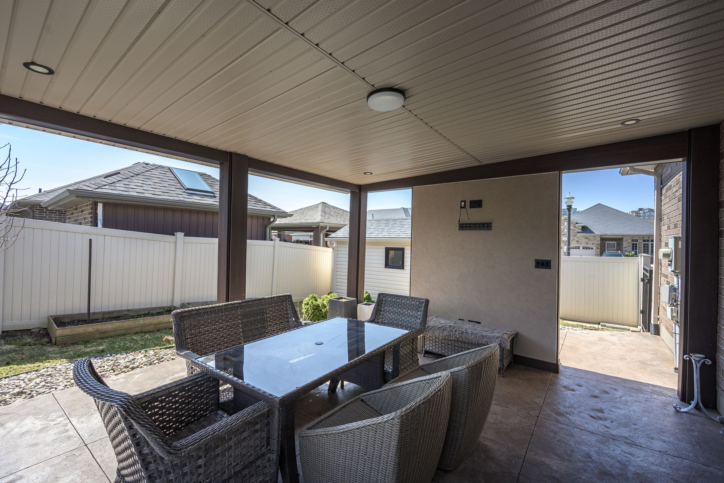 • Lovely landscaped backyard with a covered patio and automated sprinkler system.