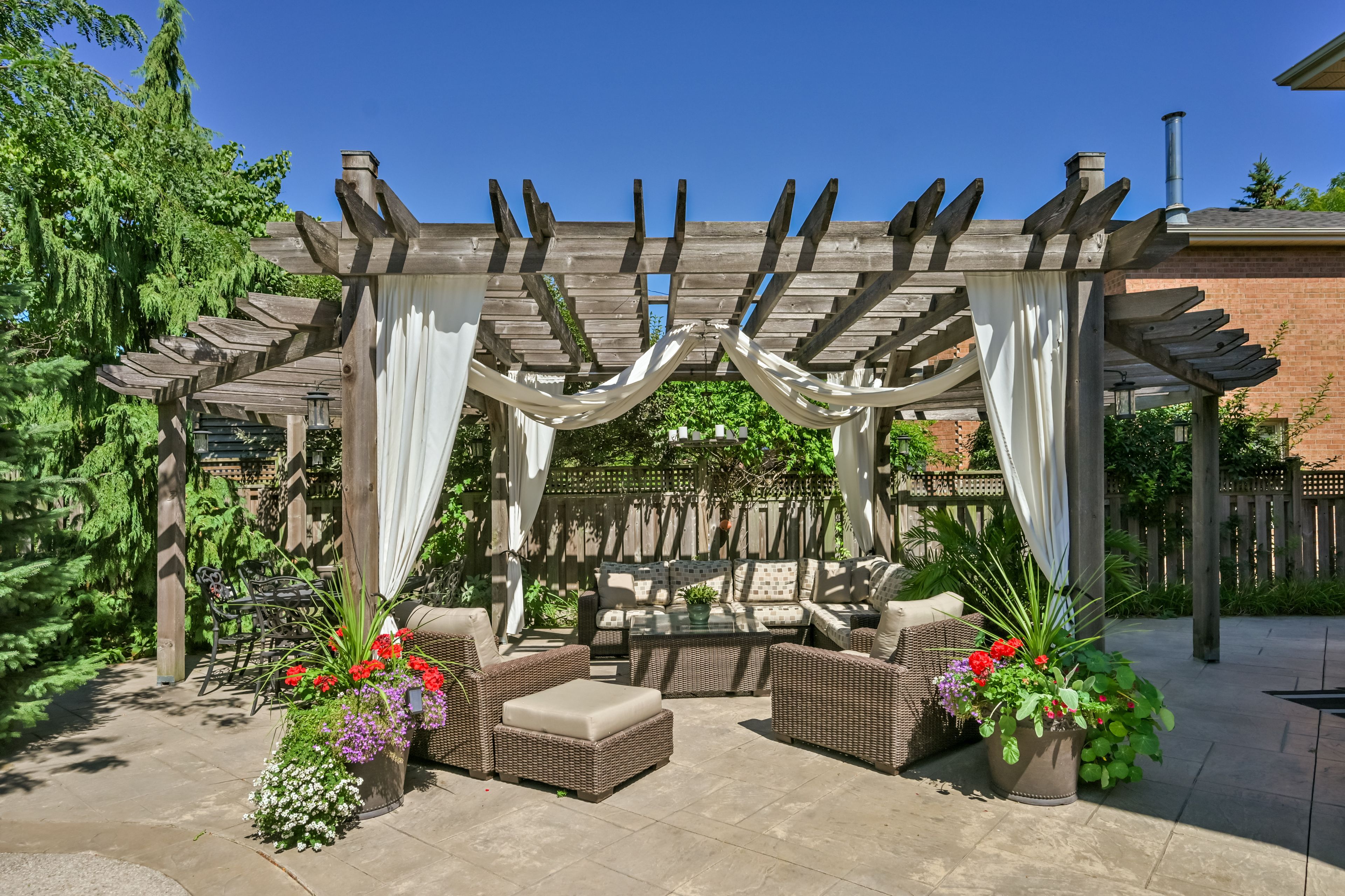 • Private backyard oasis with inground pool, hot tub, and pergola.