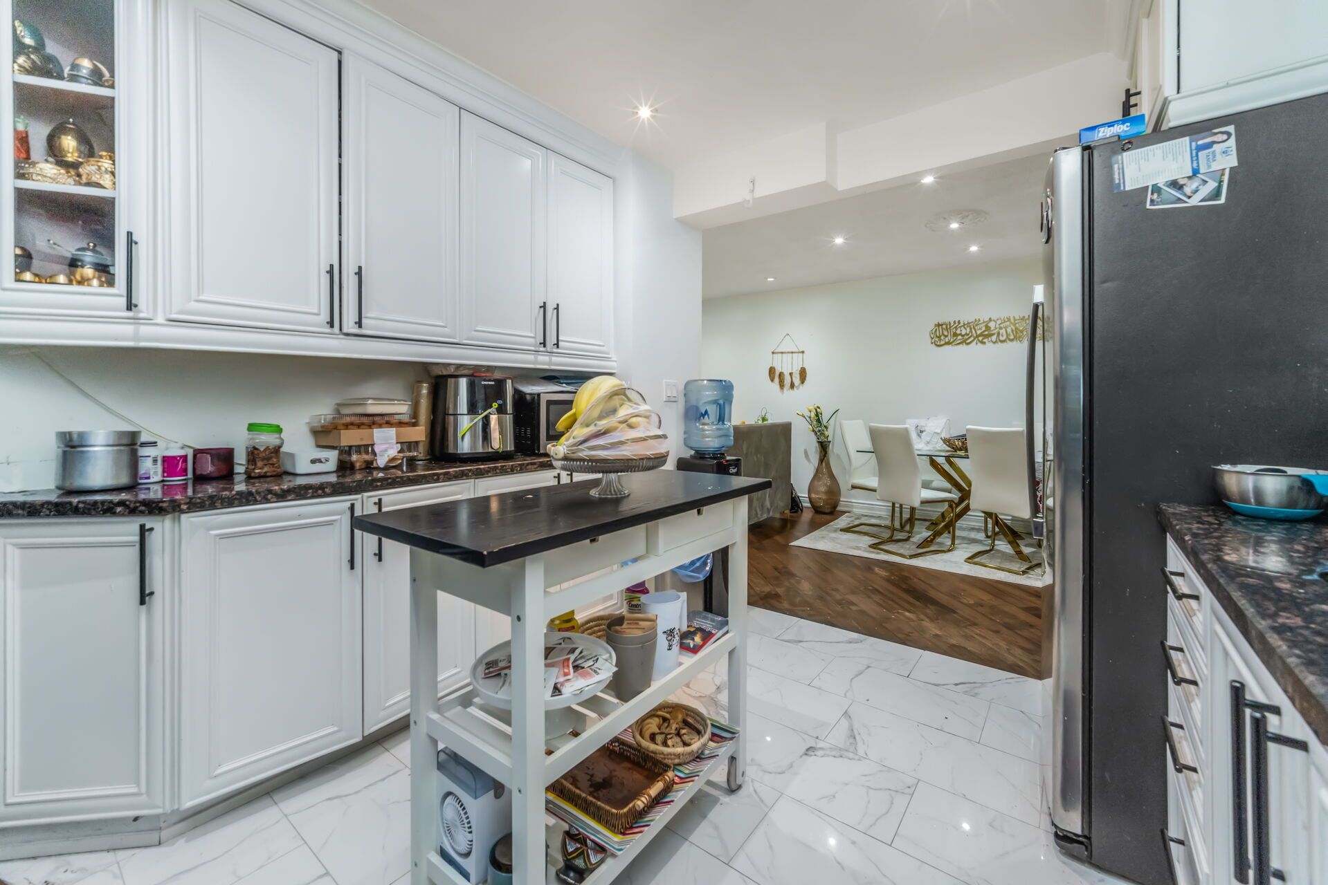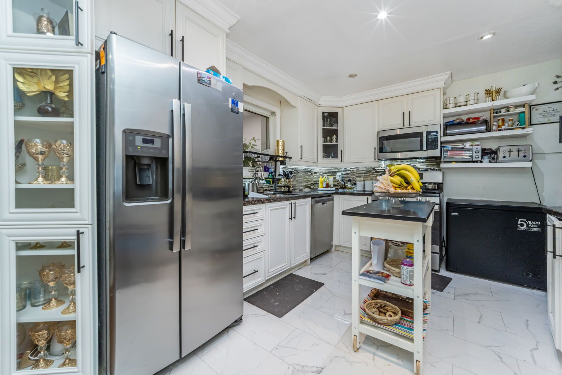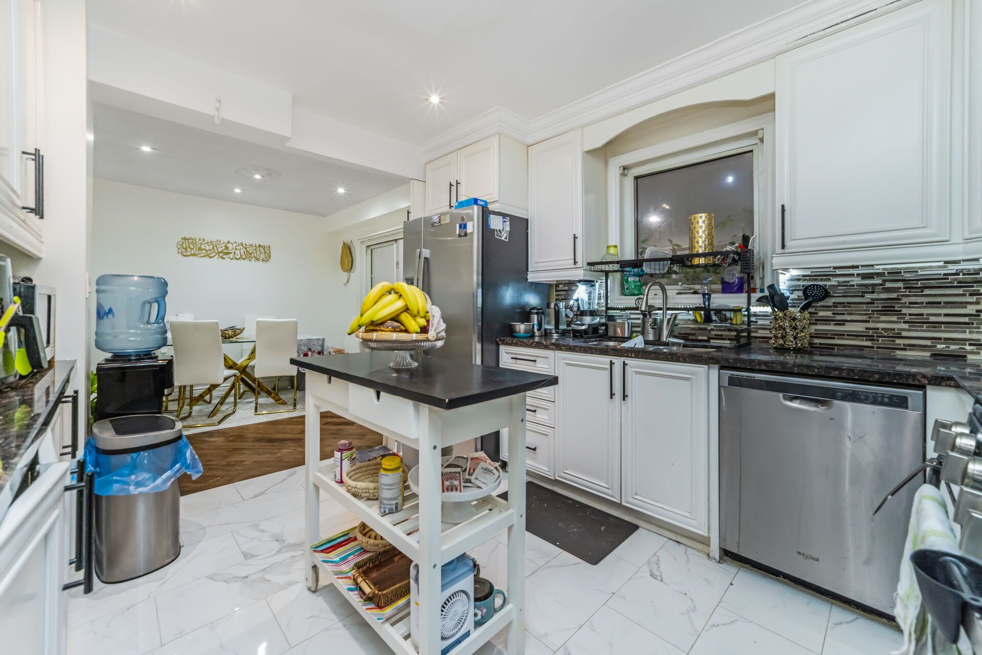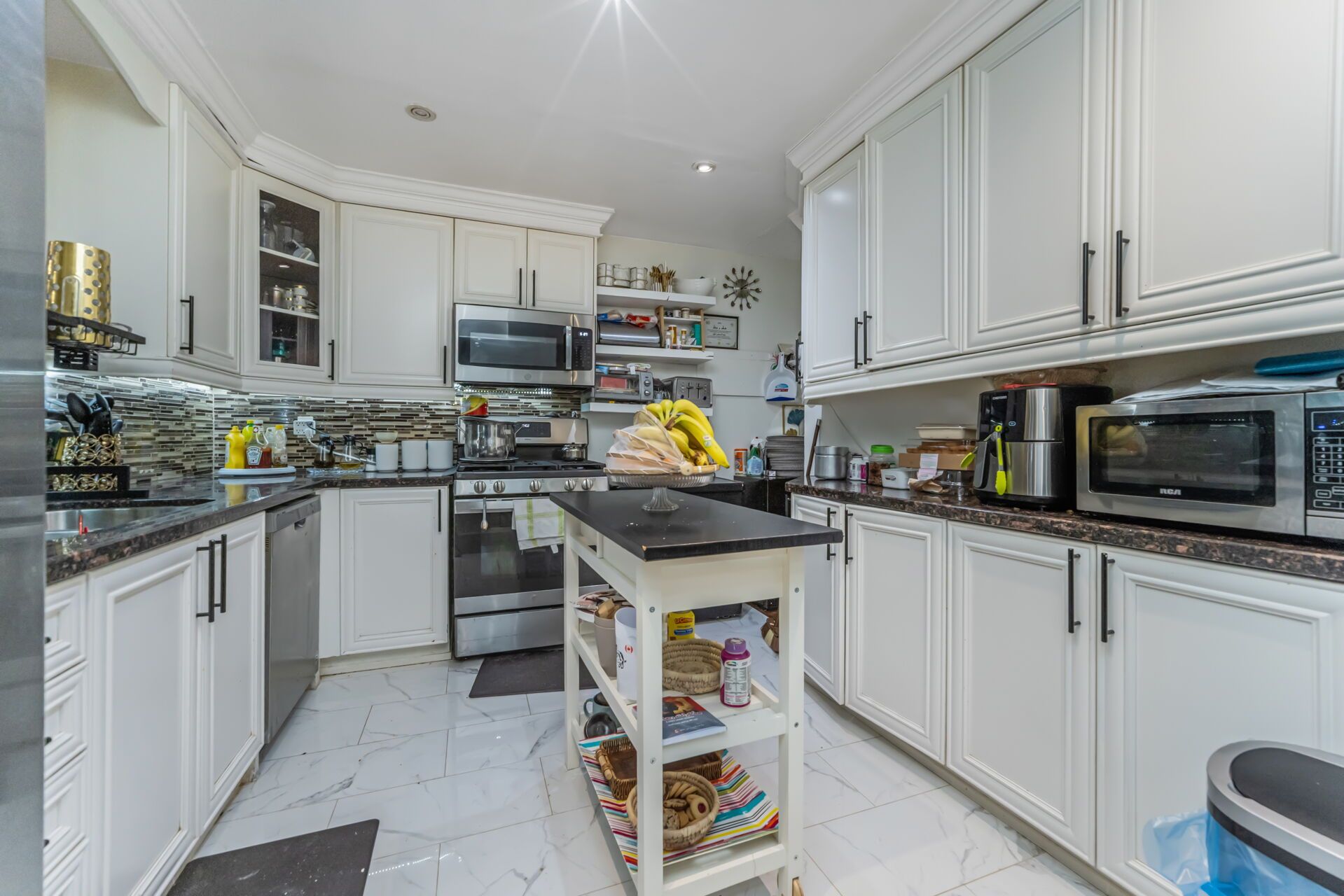 • Modern kitchen with stainless steel appliances and granite countertops.