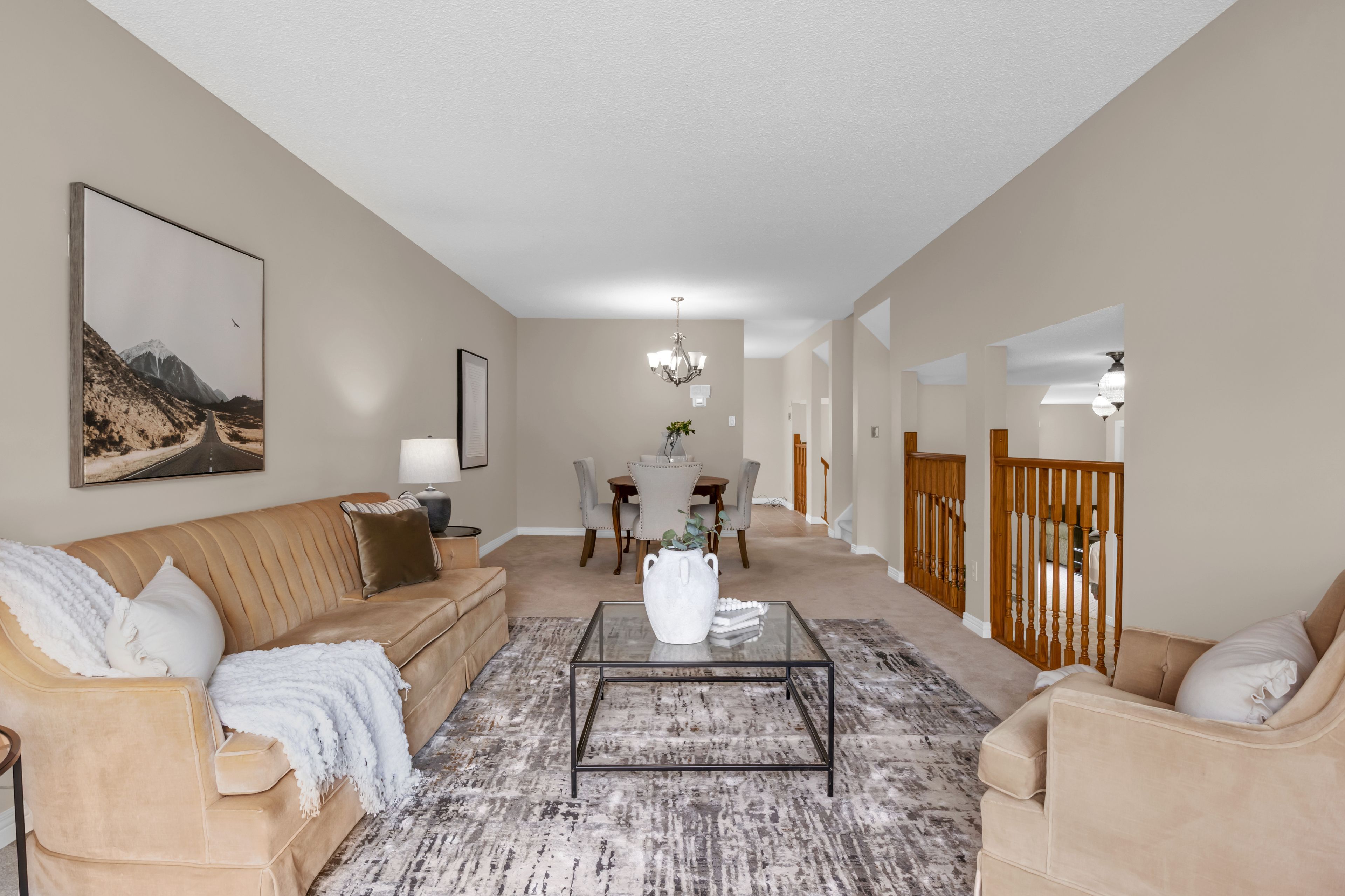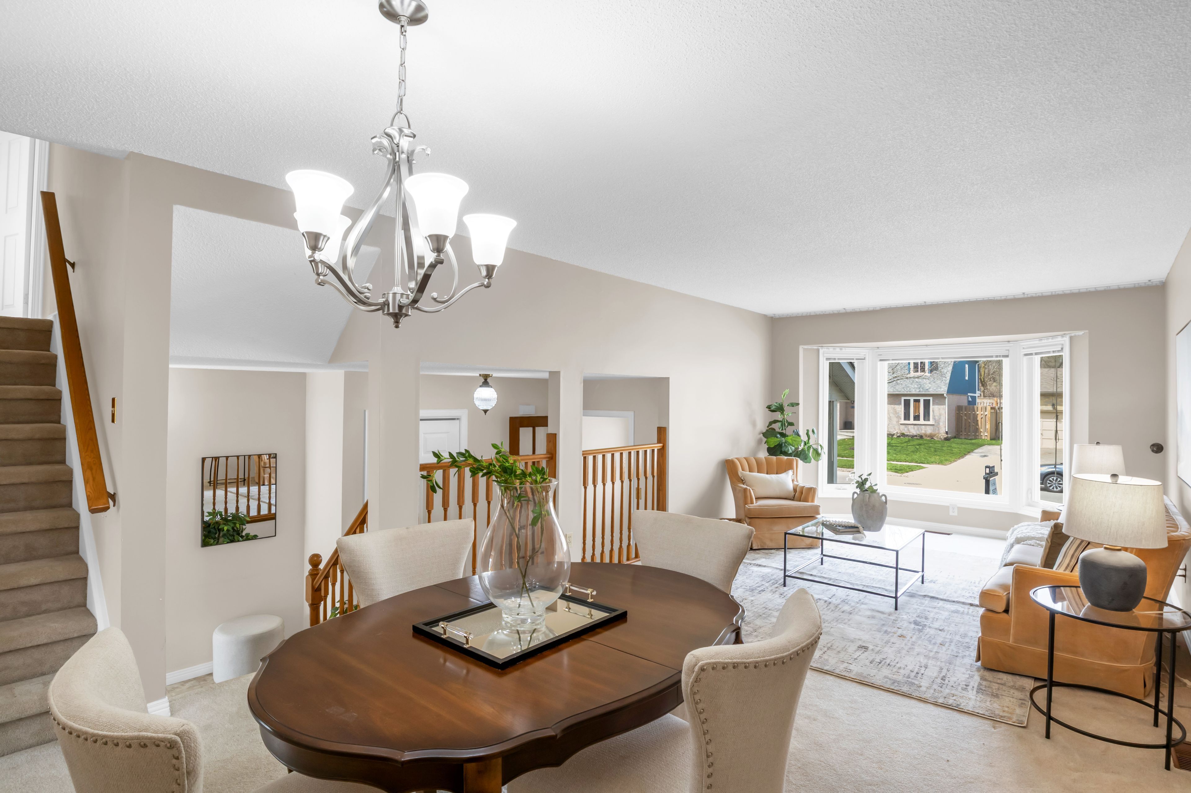 • Bright open-concept living and dining area with large windows.