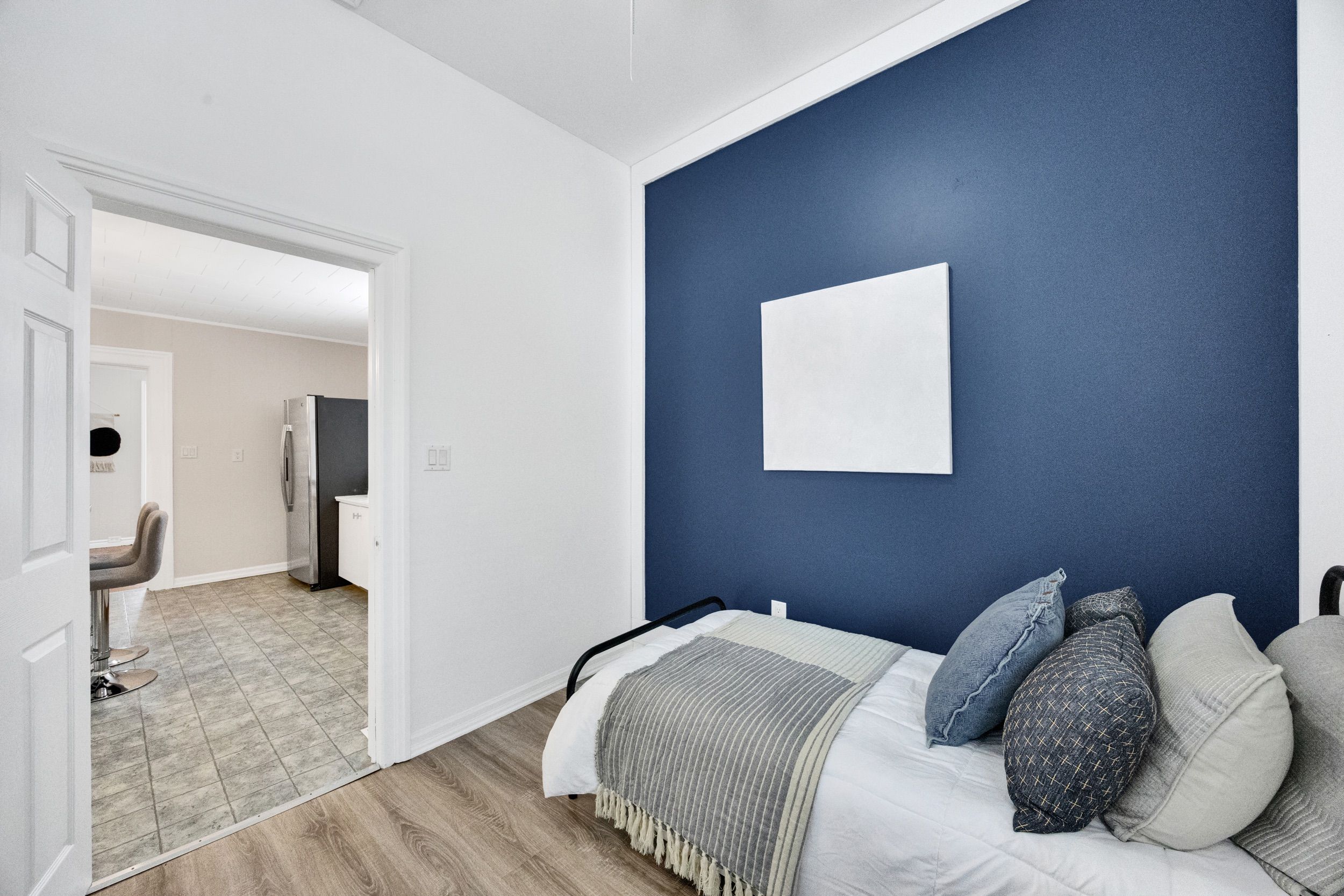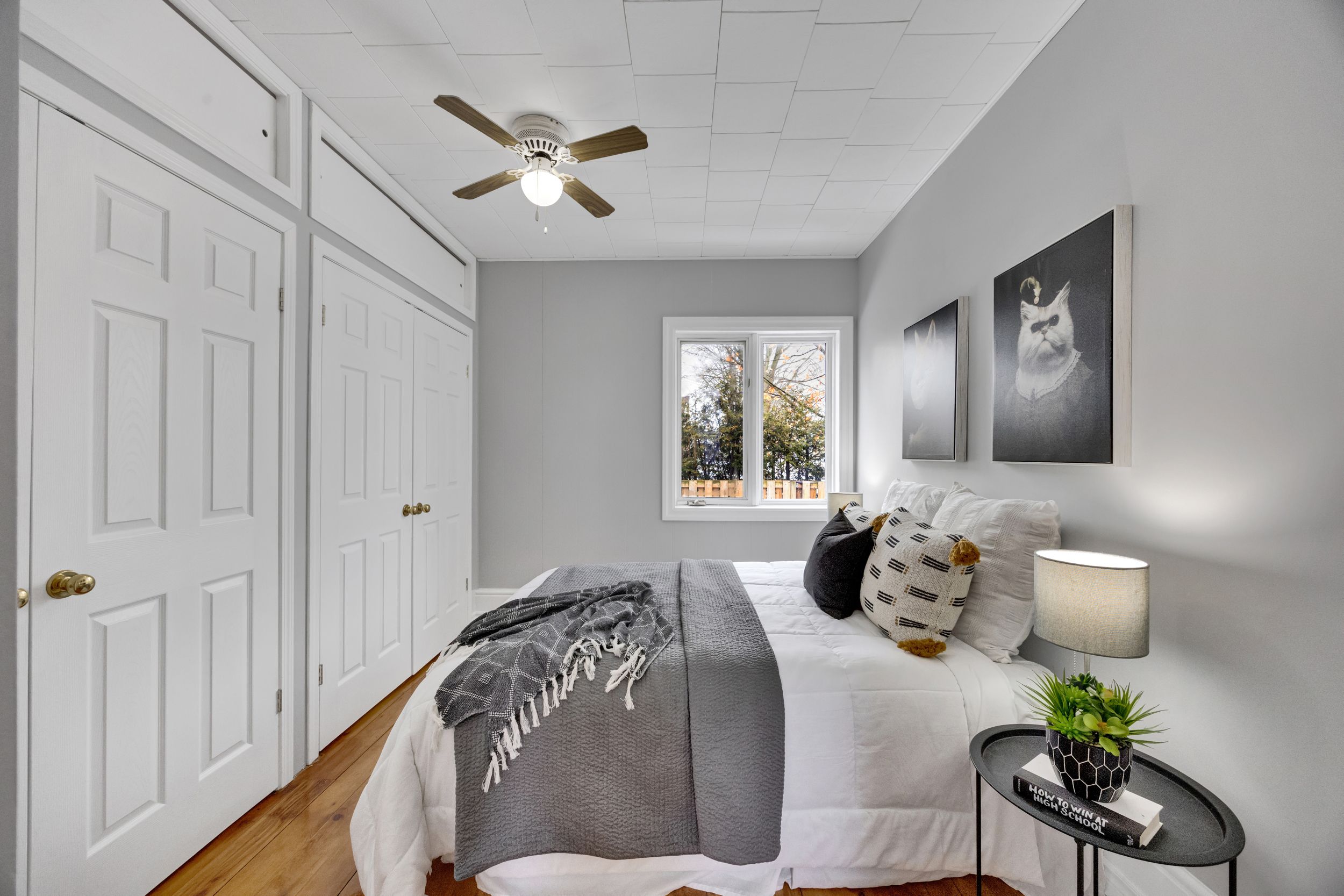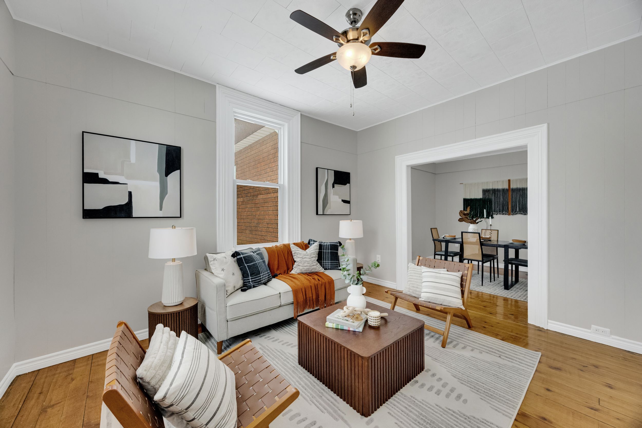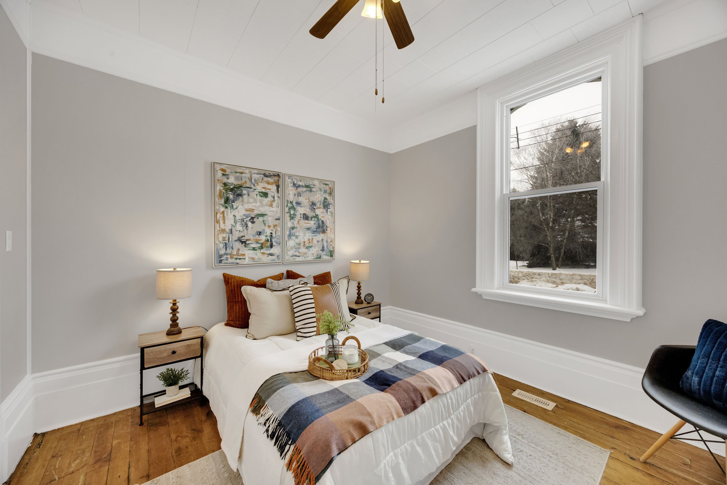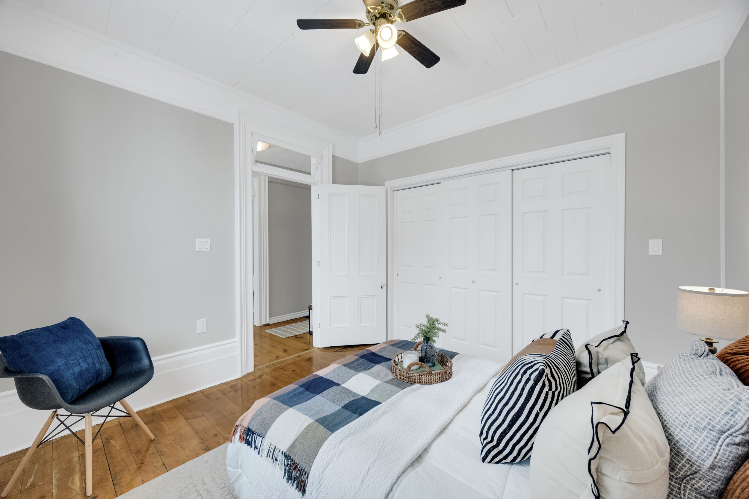 • Three spacious bedrooms with original hardwood floors and high ceilings.