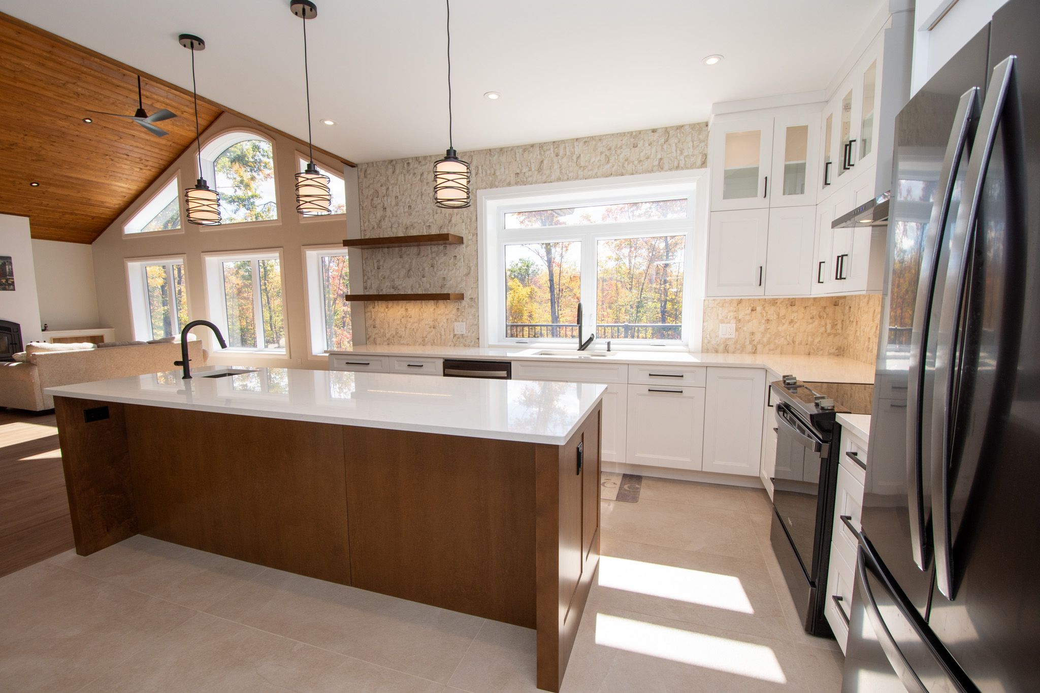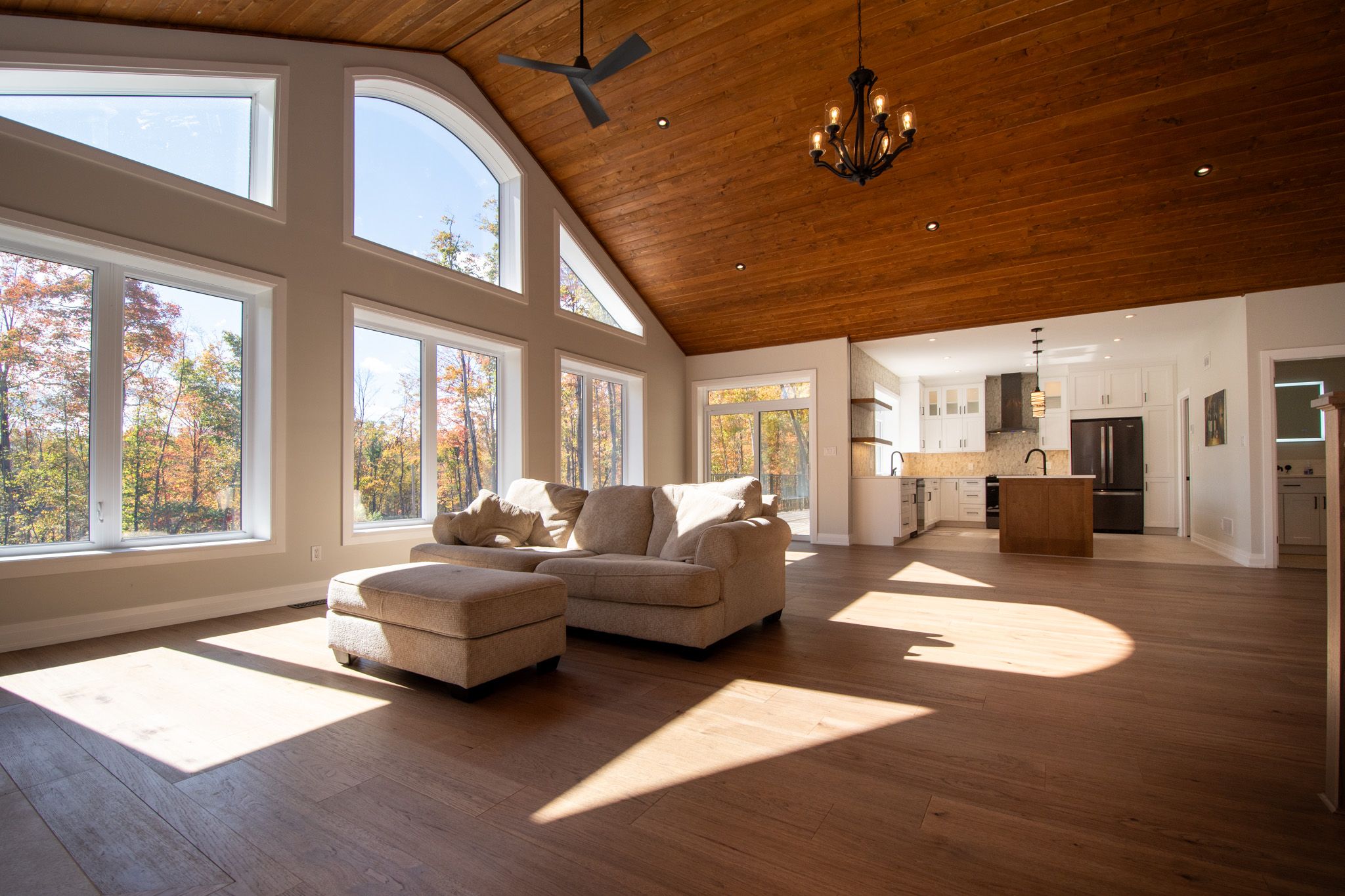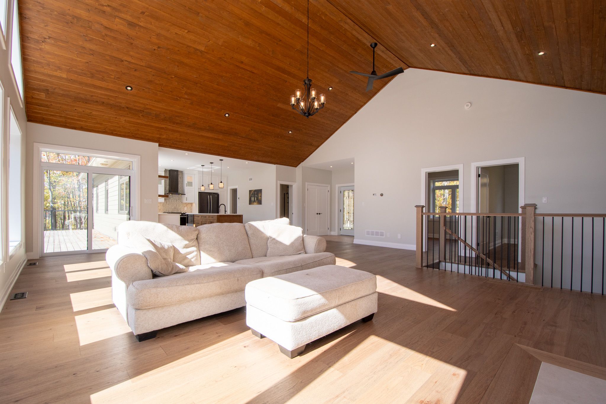 • Bright open concept living area with cathedral ceilings and wood fireplace.