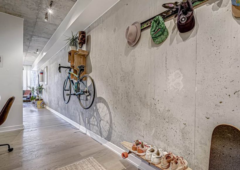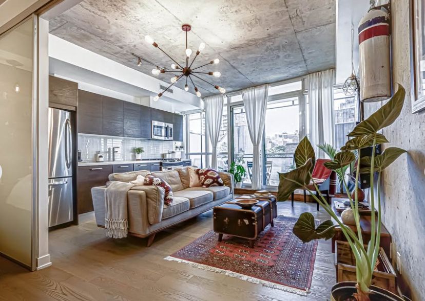 Welcome to boutique urban living in one of toronto's most vibrant east end neighbourhoods, where space, style, and location come together. This rarely offered oversized one bedroom residence stands out from other similarly priced units, offering a more generous layout without compromising on modern finishes or design. Inside, you will find a bright and airy open concept layout featuring sleek flooring, soaring concrete ceilings, and expansive floor to ceiling windows that fill the space with natural light throughout the day. The added square footage is immediately noticeable, providing greater flexibility for both comfortable living and entertaining, something not often found at this price point. The contemporary kitchen is equipped with full sized stainless steel appliances, including a gas stove, stone countertops, and ample cabinet space, perfect for both everyday living and hosting. The spacious bedroom features custom wood accent wall detailing and unique statement lighting, creating a warm and stylish retreat. It also includes a large closet offering excellent storage space and generous windows that continue the bright, open feel of the unit. The modern bathroom features clean finishes and thoughtful design, while additional conveniences include in suite laundry and functional storage throughout. Located in a highly desirable boutique building, residents enjoy easy access to transit, with the king streetcar at your doorstep and the future ontario line station just steps away, making commuting across the city effortless.