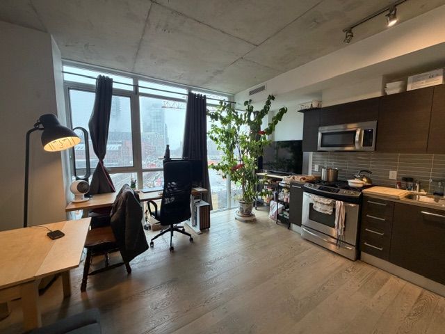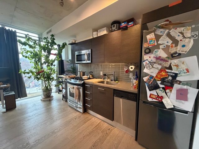 "the king east!" a boutique condo-loft in the trendy king east designer's district. This bright south-facing 1-bedroom suite offers approximately 543 sq. Ft. With pleasant street views. Features include hardwood flooring throughout, a 9' exposed concrete ceiling, and a sleek euro-style scavolini kitchen with quartz countertops, under-mounted sink, and stainless steel appliances including a gas stove, fridge, dishwasher, and microwave. Stacked washer and dryer included. Enjoy free access to the party room and bbq area on the second-floor terrace. 24-hour streetcar at the doorstep. Walking distance to the distillery district, george brown college, st. Lawrence market, and the financial district. Walk score 99. One storage locker included - an ideal urban home for stylish downtown living.
