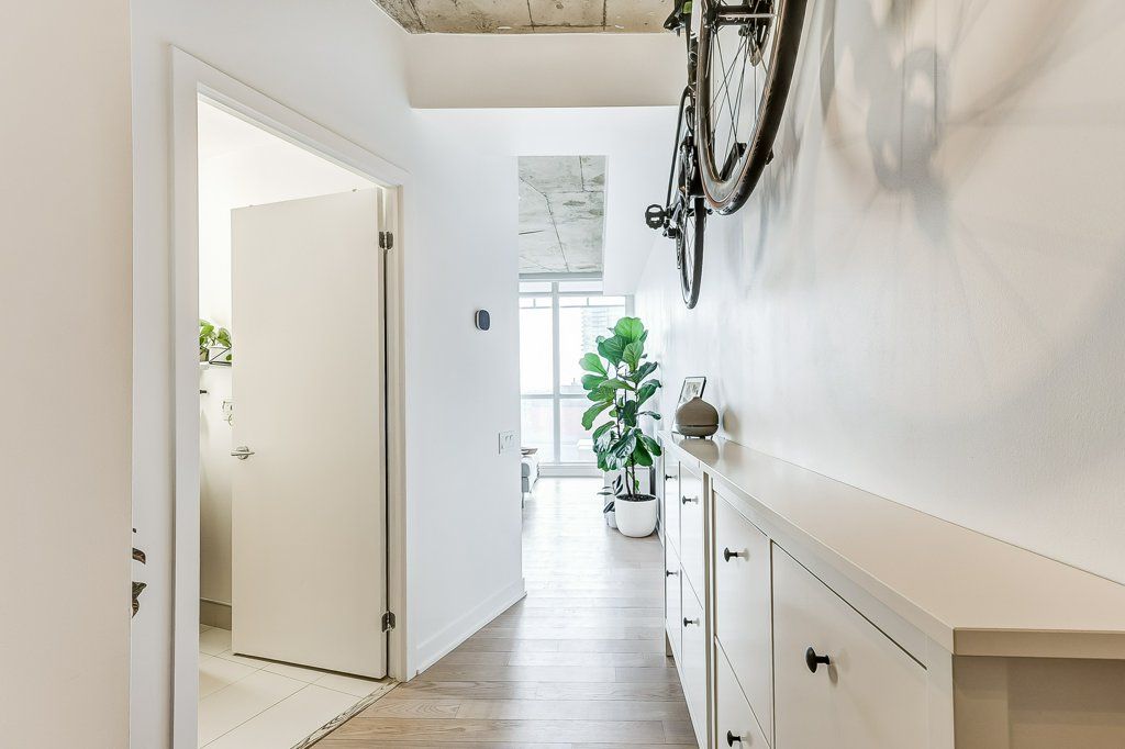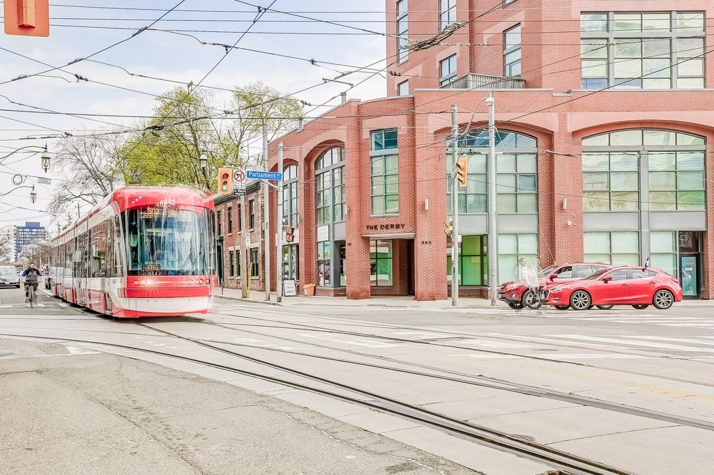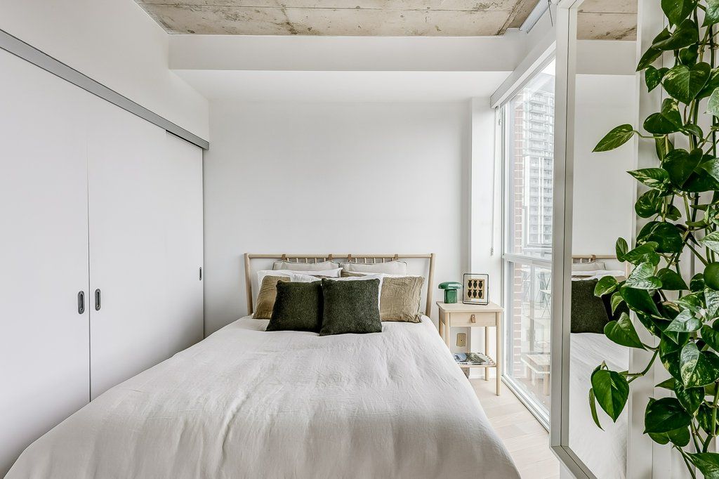 Experience stylish city living in this bright and beautifully designed southeast corner loft, located in a sought-after boutique building. Flooded with natural light through floor-to-ceiling windows, the suite offers open city views and a glimpse of the water, creating an airy and inviting atmosphere throughout. The space features exposed concrete ceilings, hardwood floors, and a sleek modern kitchen equipped with stone countertops, stainless steel appliances, a gas cooktop, built-in dishwasher, and glass backsplash. The smart, open layout provides flexibility for everyday living, entertaining, and working from home. The bedroom includes generous wall-to-wall closet space, and the unit is complete with in-suite laundry for added convenience. Upgrades include automated window blinds and a smart ecobee thermostat. The pet-friendly building offers bike storage, and a rental parking space is available if needed. Ideally situated steps from top restaurants, shops, st. Lawrence market, the distillery district, and the waterfront. Transit is at your doorstep with the king streetcar outside and a future ontario line station across the street. Union station is just a 20-minute walk away. A fantastic opportunity to lease a sun-filled loft in one of the city's most vibrant and connected neighbourhoods