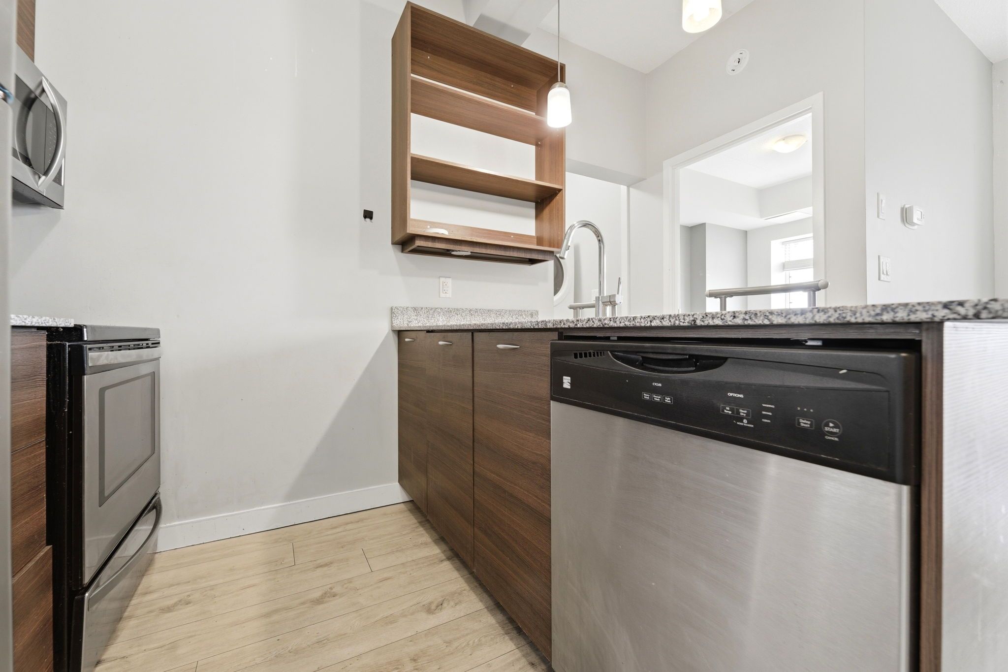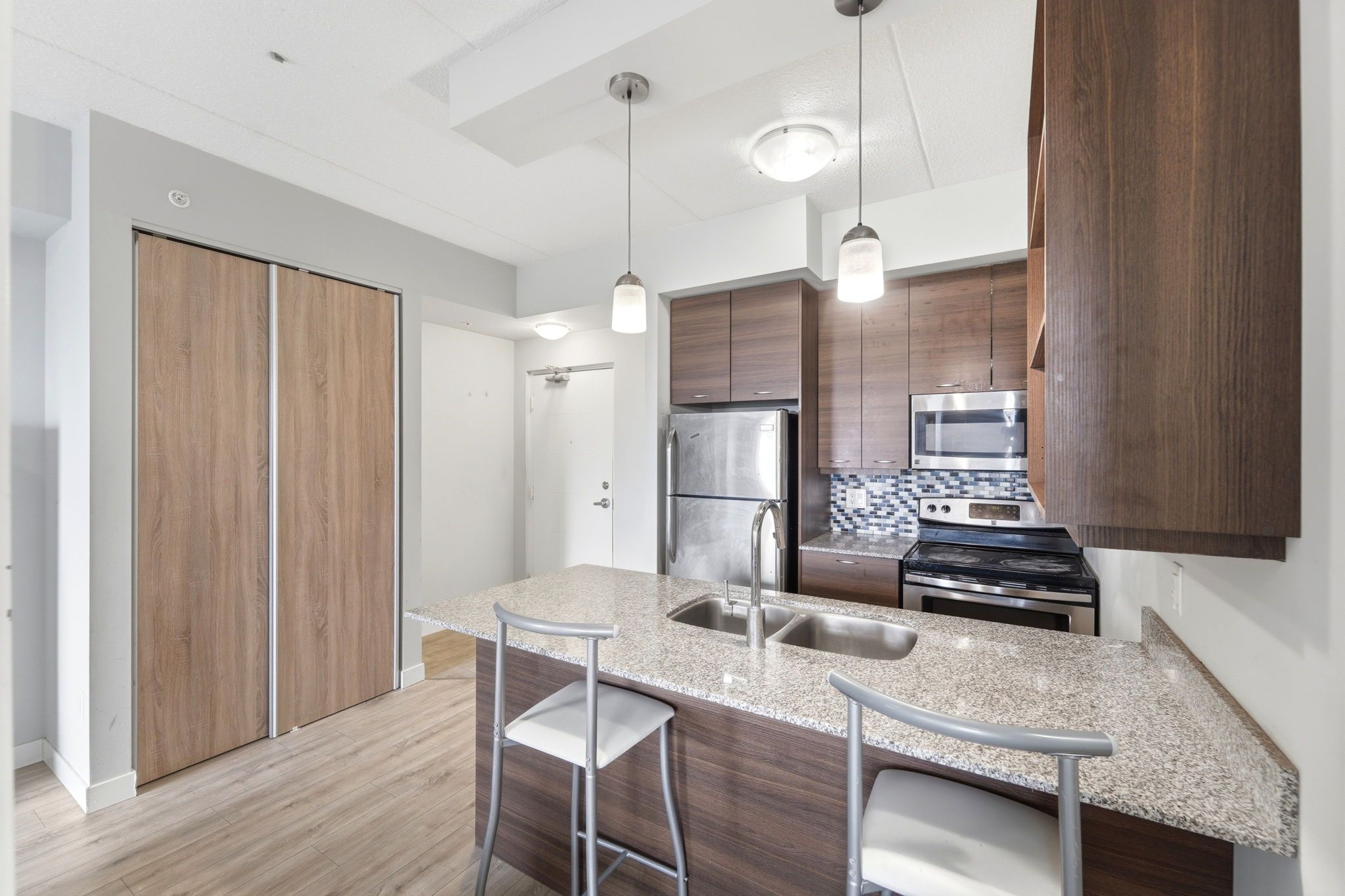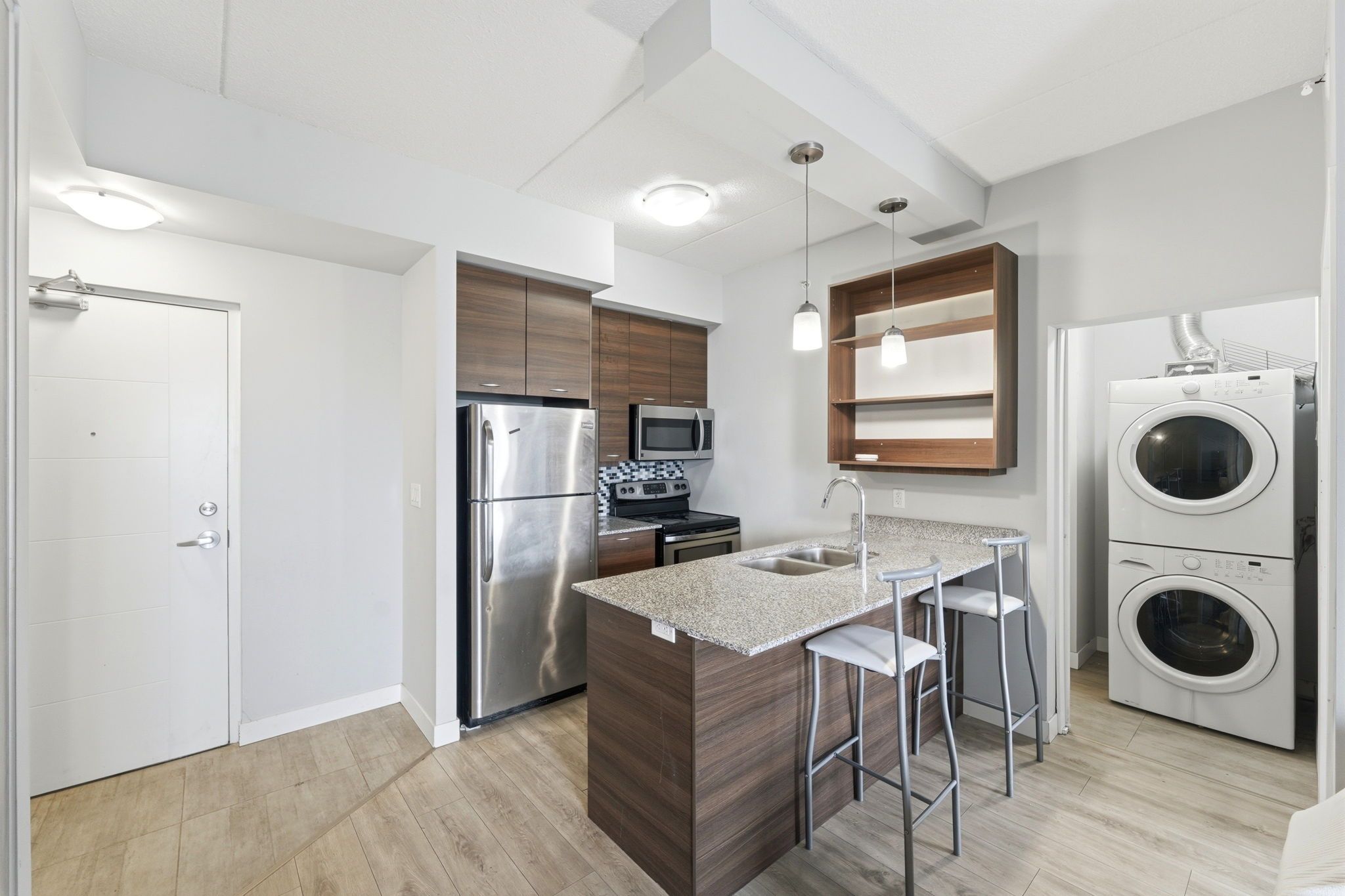• Spacious one-bedroom suite with open-concept layout and modern kitchen.