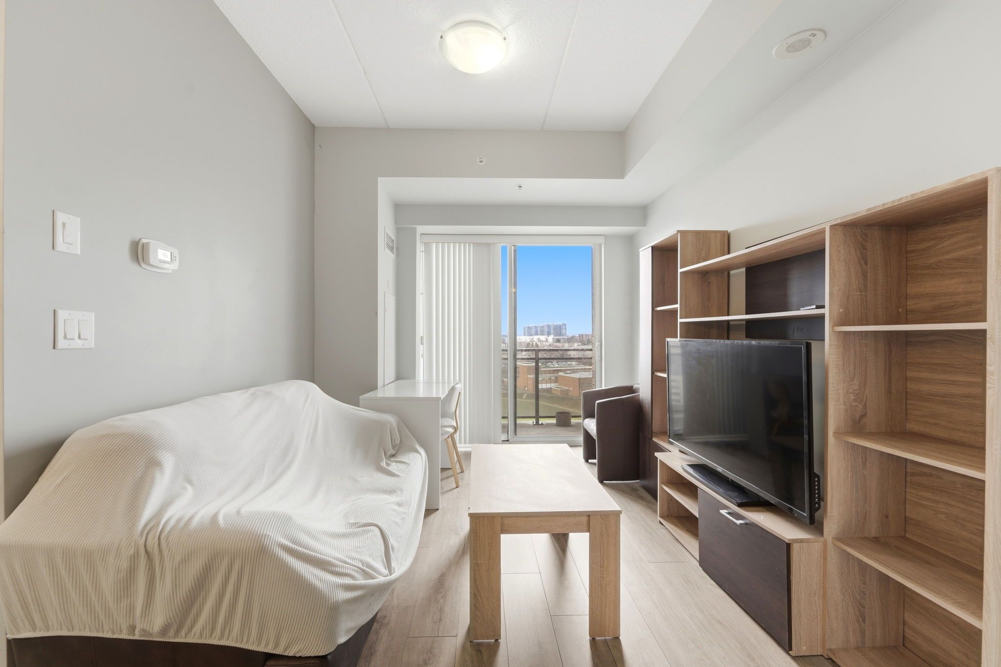 • Large windows provide natural light and beautiful city views from the balcony.