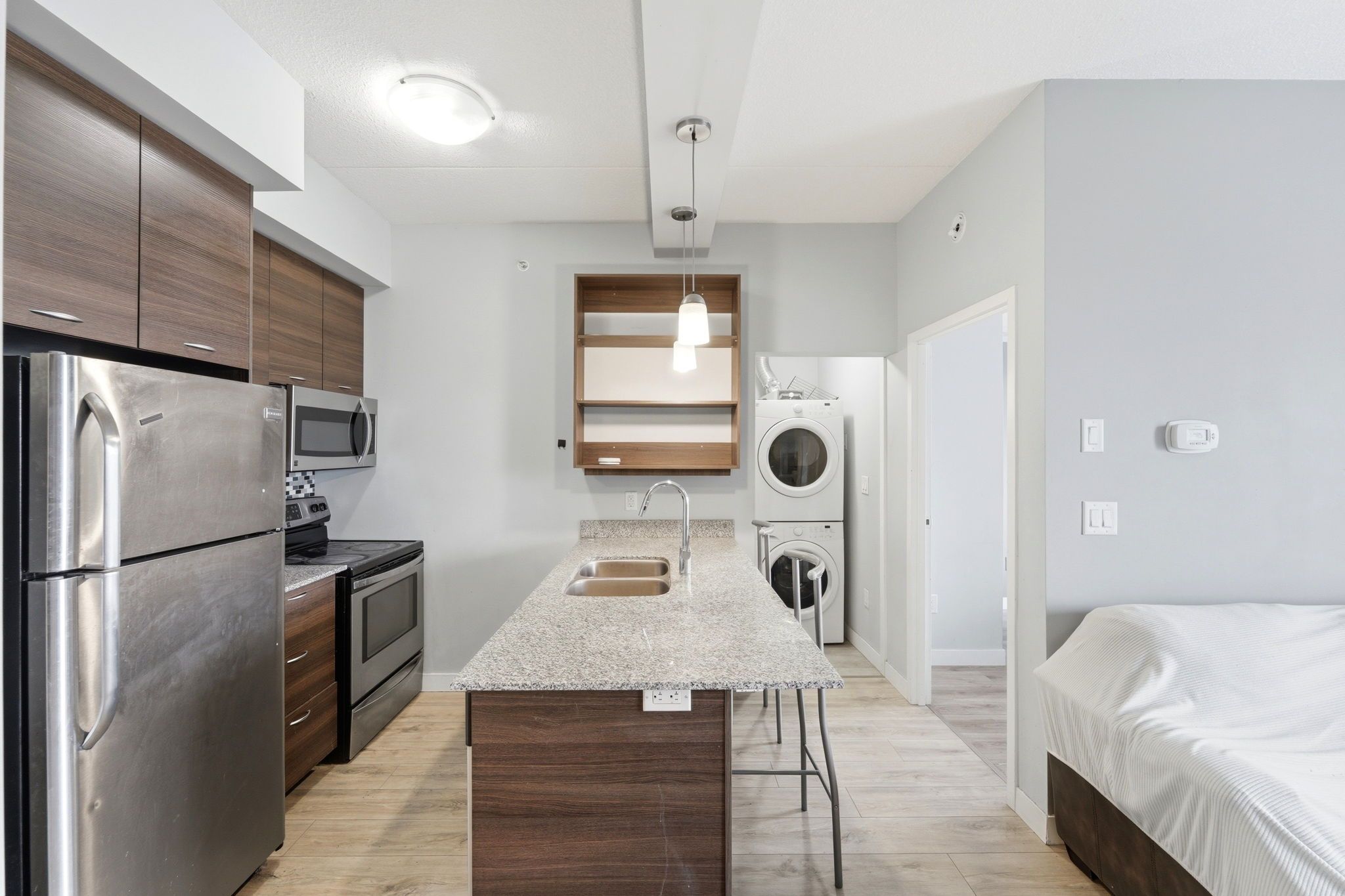 Calling all parents of university students, and young professionals! Welcome to sage condos in waterloo's vibrant university core. This spacious one-bedroom, one-bathroom suite offers just under 600 sq ft of thoughtfully designed living space. The open-concept layout features a modern kitchen complete with stainless steel appliances and ample cabinetry, seamlessly flowing into a bright and inviting living area. Large windows fill the space with natural light, while the private balcony showcases expansive city views. The bedroom is generously sized and offers comfortable, functional living. Additional highlights include in-suite laundry for added convenience . Ideally located just steps from the university of waterloo and wilfrid laurier university, this is a prime opportunity in one of the city's most reliable rental markets. Enjoy walkable access to shops, restaurants, transit, including the lrt and go bus station, and all essential amenities. Sage condos offers desirable building amenities such as a rooftop terrace, fitness center, party room, and high-speed internet.