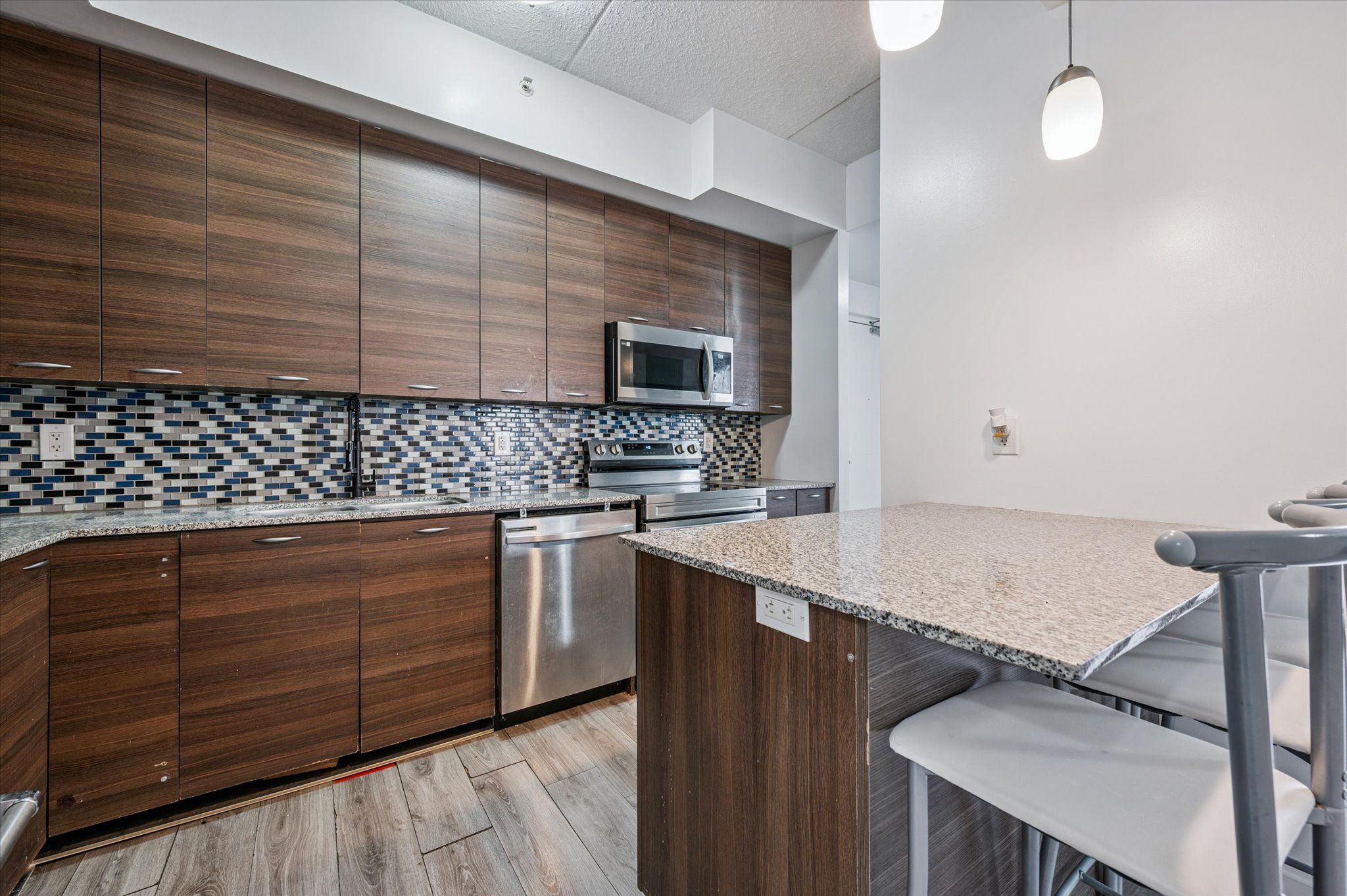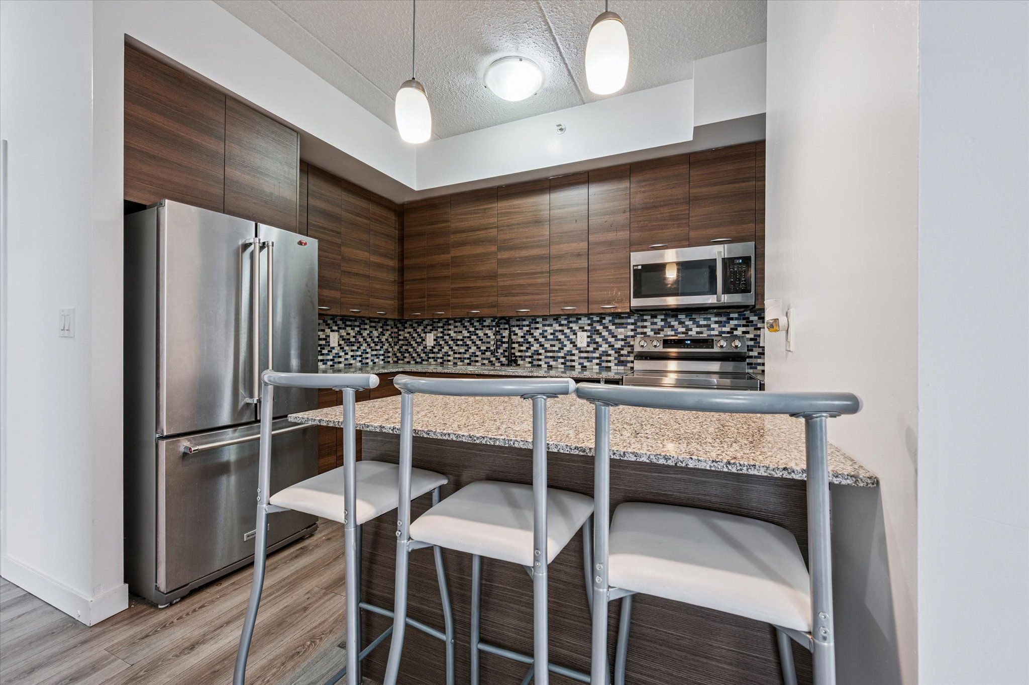 • Modern kitchen with stainless steel appliances and a breakfast bar.