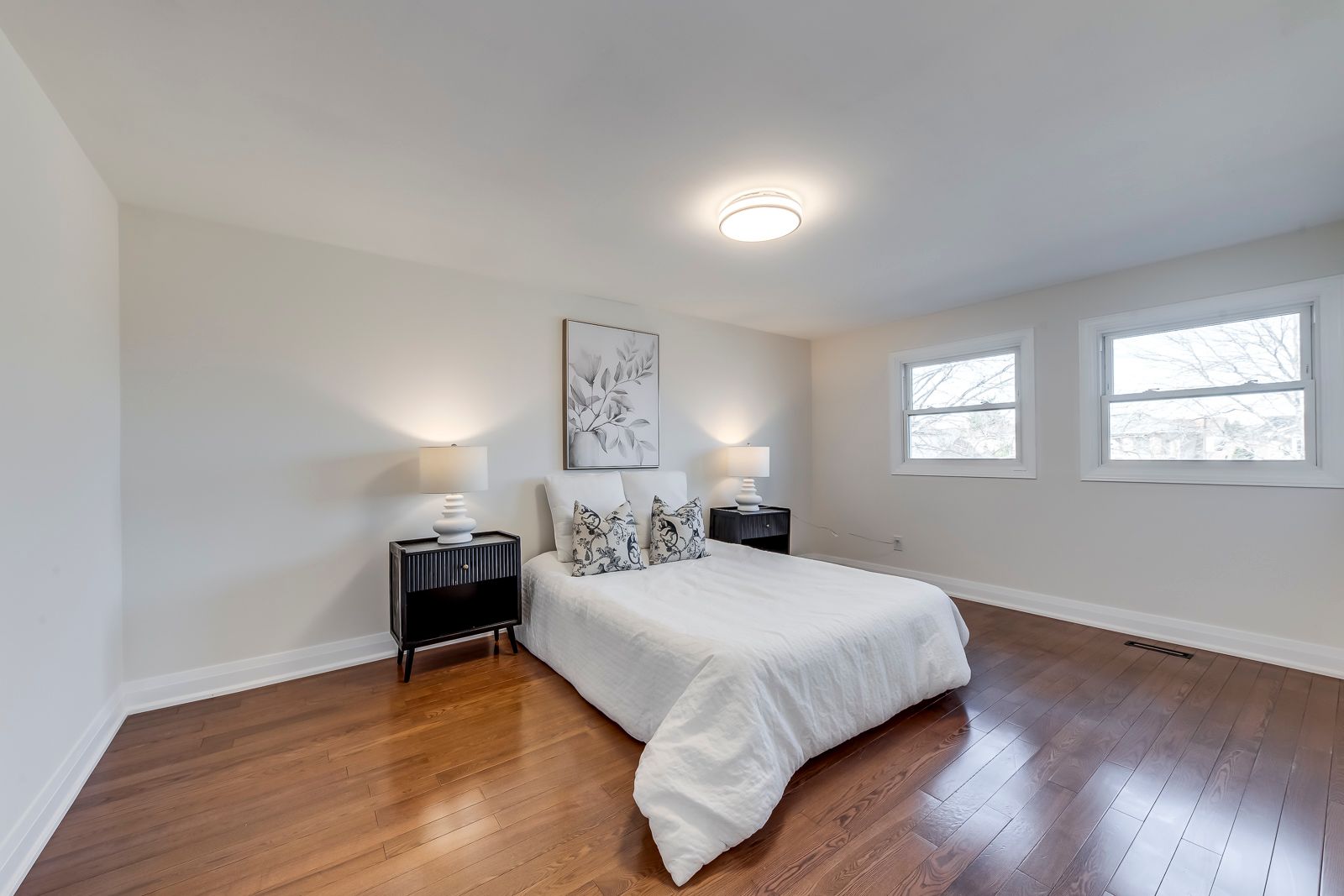 Welcome to this stunningly renovated 2-storey detached home in burlington's highly sought-after headon forest community. Boasting over 2,900 sq ft of total finished living space, this residence features a modern, open-concept design highlighted by brand-new wide-plank flooring, recessed pot lighting, and contemporary finishes throughout. The heart of the home is a bright, designer kitchen equipped with sleek cabinetry, stone countertops, stainless steel appliances, and a breakfast area that walks out to the rear deck. The functional main level includes a spacious living room, a formal dining area, and a cozy family room with a classic tiled fireplace. Upstairs, the massive primary suite serves as a true retreat, featuring multiple windows for natural light and a spa-like 5-piece ensuite with a glass-enclosed rainfall shower, floating vanity, and marble-style tiling. Three additional generous bedrooms share a beautifully updated 4-piece bathroom. The fully finished basement adds significant value, offering a large recreation room, a 5th bedroom, and a modern 4-piece bath-perfect for an in-law suite, guest wing, or home office. Additional features include a main-floor laundry room, an attached 2-car garage with inside entry, and a double driveway. Situated on a 45-foot lot near top-rated schools, lush parks, and convenient shopping with easy highway access, this turnkey home offers the perfect blend of style and family-focused functionality.