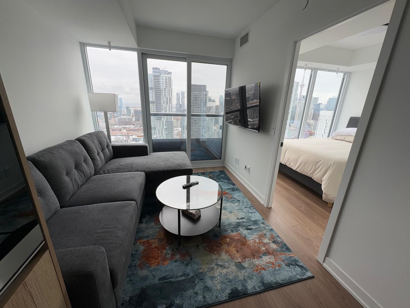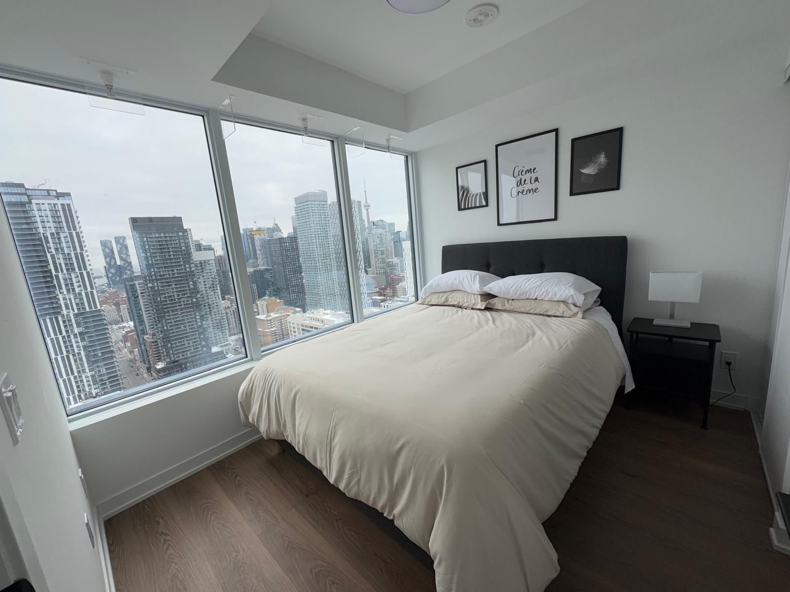 Fully furnished luxury condominium with unobstructed south-facing lake, skyline, and cn tower views. Bright and spacious 2-bedroom, 2-bathroom suite plus sofa bed sleeps up to 6 in a prime downtown location, steps to tmu, eaton centre, city hall, and public transit. Features a sun-filled open-concept layout with a modern kitchen offering built-in appliances, under-cabinet lighting, and contemporary finishes. Primary bedroom includes floor-to-ceiling windows with spectacular city views. Second bedroom is ideal for guests or home office. Two full bathrooms provide added comfort and privacy. Turnkey and move-in ready. Short-term and long-term leases available (30+ days). Extras: fully furnished inclu. Queen bed, double bed, sofa bed, linens, towels, in-suite laundry, tv, lamps, kitchenware, coffee maker, and accessories.