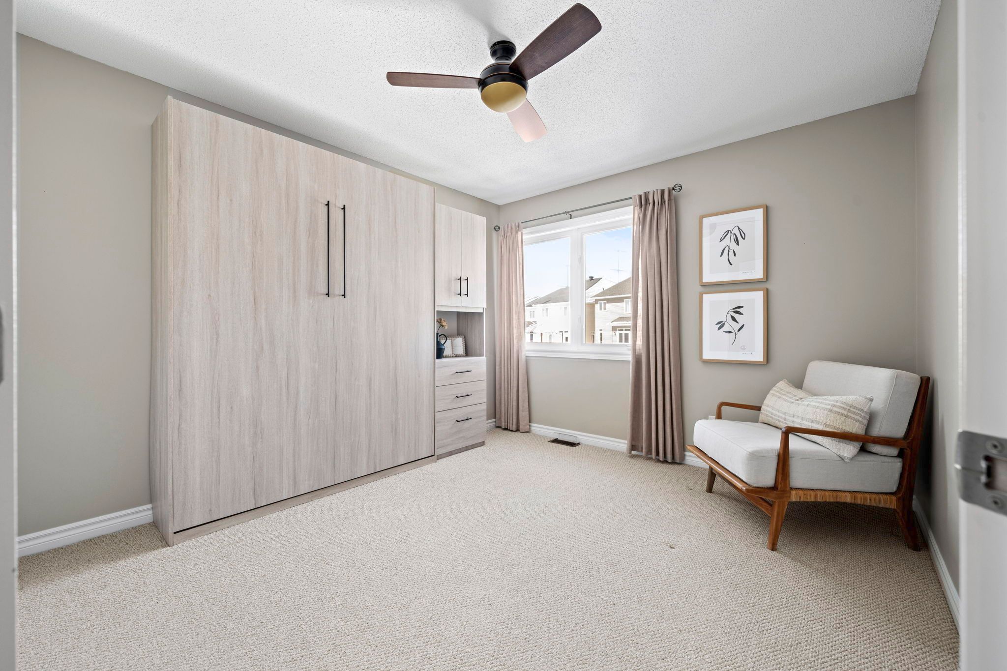 Welcome to 319 kingbrook drive, a unique urbandale townhome that trades the standard layout for sophisticated architectural volume in the heart of bridlewood. This residence is defined by its living room with a dramatic 16ft vaulted ceiling that opens to the second level. The extra vertical space provides a sense of airiness and a more open atmosphere than traditional models. The main level showcases gleaming hardwood floors and a functional, open-concept kitchen equipped with granite countertops, stainless steel appliances, a breakfast bar, and pantry. Anchored by a cozy natural gas fireplace, the living area serves as a comfortable centrepiece. The second level is designed for maximum versatility, offering a primary retreat complete with a walk-in closet and an updated luxurious ensuite bathroom. The second bedroom includes a clever built-in murphy bed, allowing the room to easily transition between a guest suite and a hobby space. A standout feature is the second floor loft; currently an inspiring office or reading nook, this open-to-below flex space offers the potential to be enclosed to create a formal third bedroom. For added convenience, the second floor also includes a full family bathroom and laundry. The living space extends to the fully finished basement, providing a large recreation room, ample storage, and a rough-in for a future bathroom. Outside, the fully fenced backyard is a true highlight, boasting a private patio and gazebo alongside a covered bbq area equipped with a natural gas hook-up. Nestled on a quiet, family-oriented street, you are within walking distance to top-rated schools, parks, and nature trails