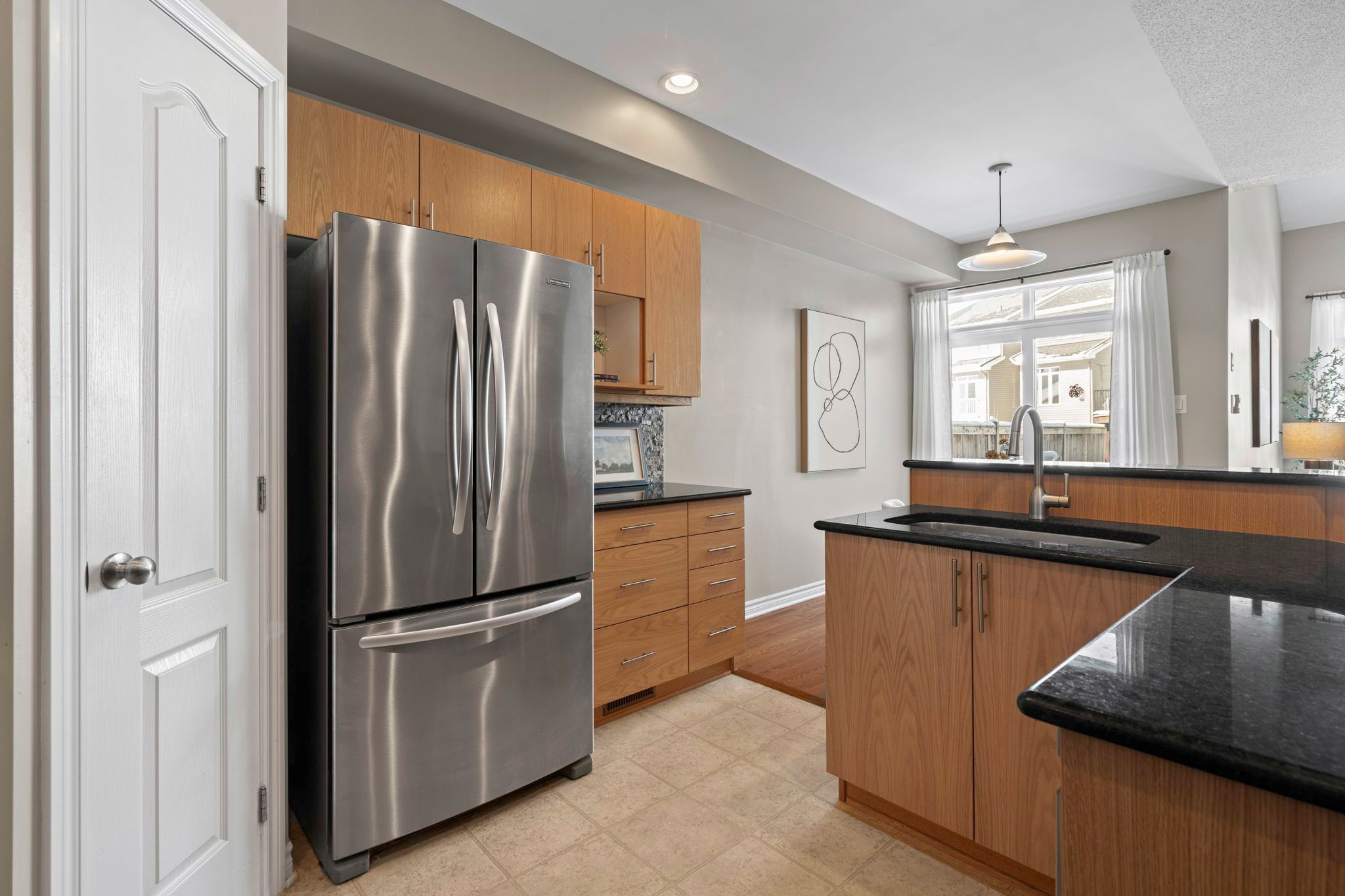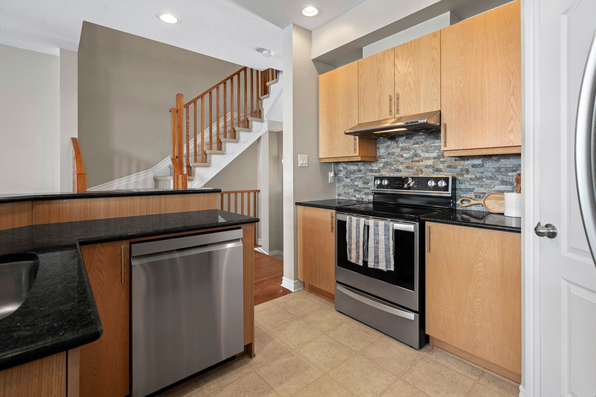 • Open-concept kitchen features granite countertops and stainless steel appliances.