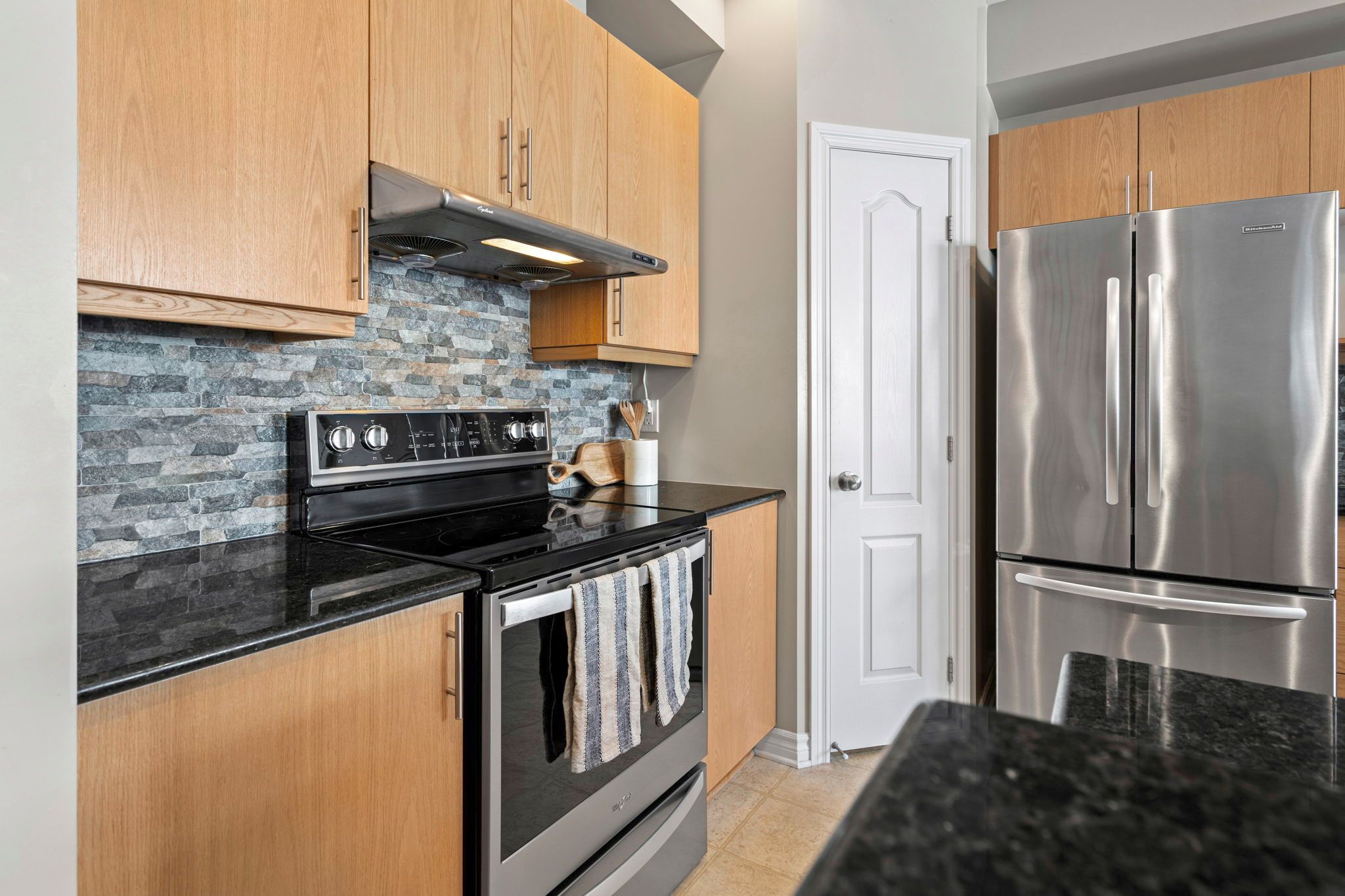 • Hardwood floors and granite countertops add style to the living and kitchen areas.