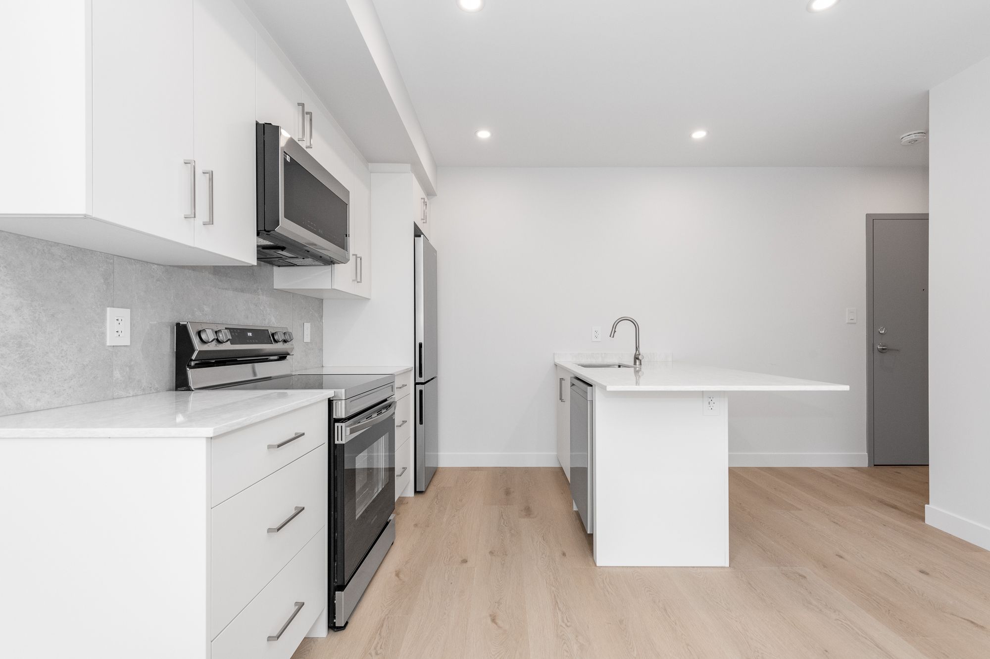 • Modern kitchen with quartz counters, spacious island, and stainless steel appliances.