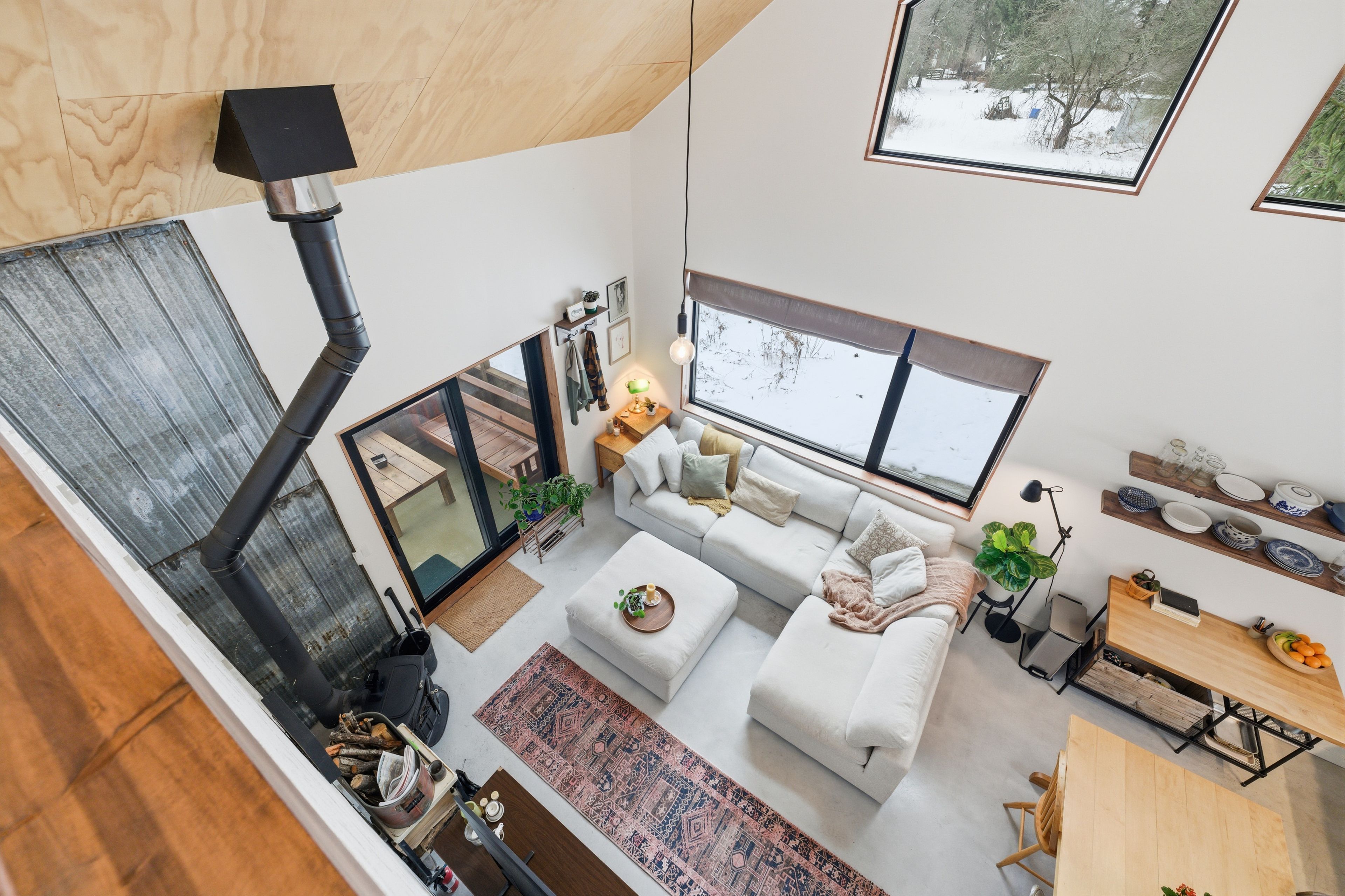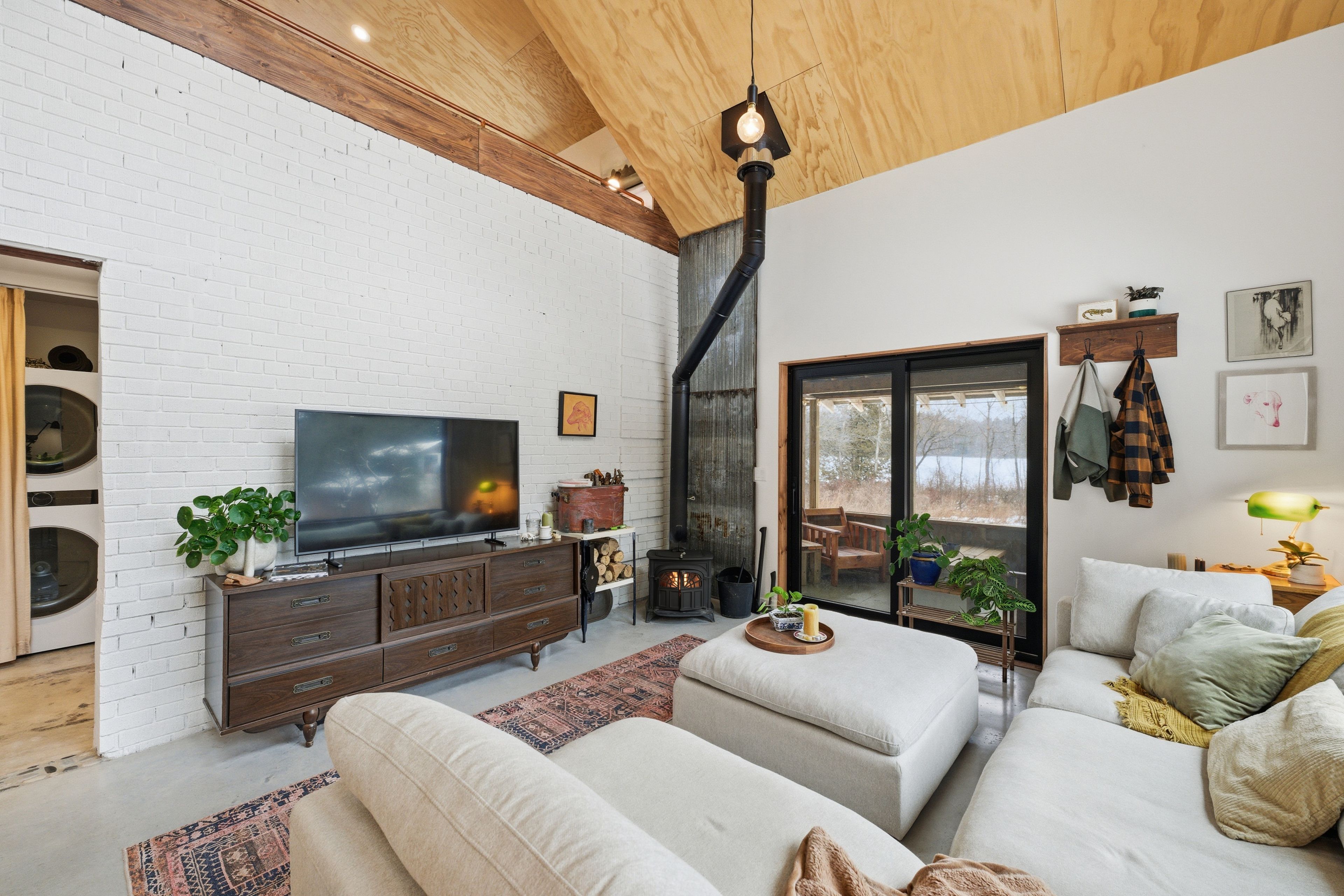 • Bright great room features vaulted ceilings and a cozy wood stove.