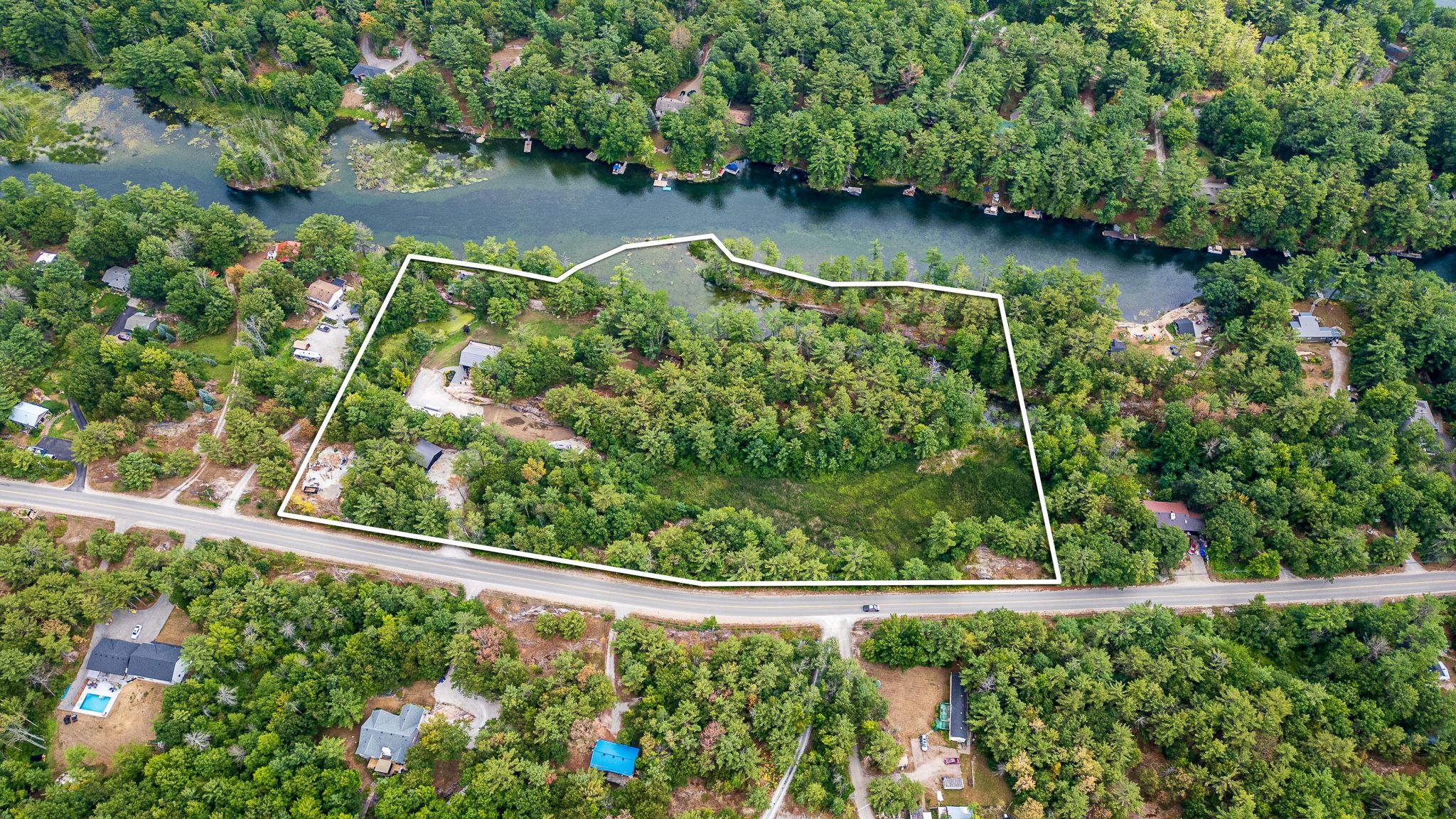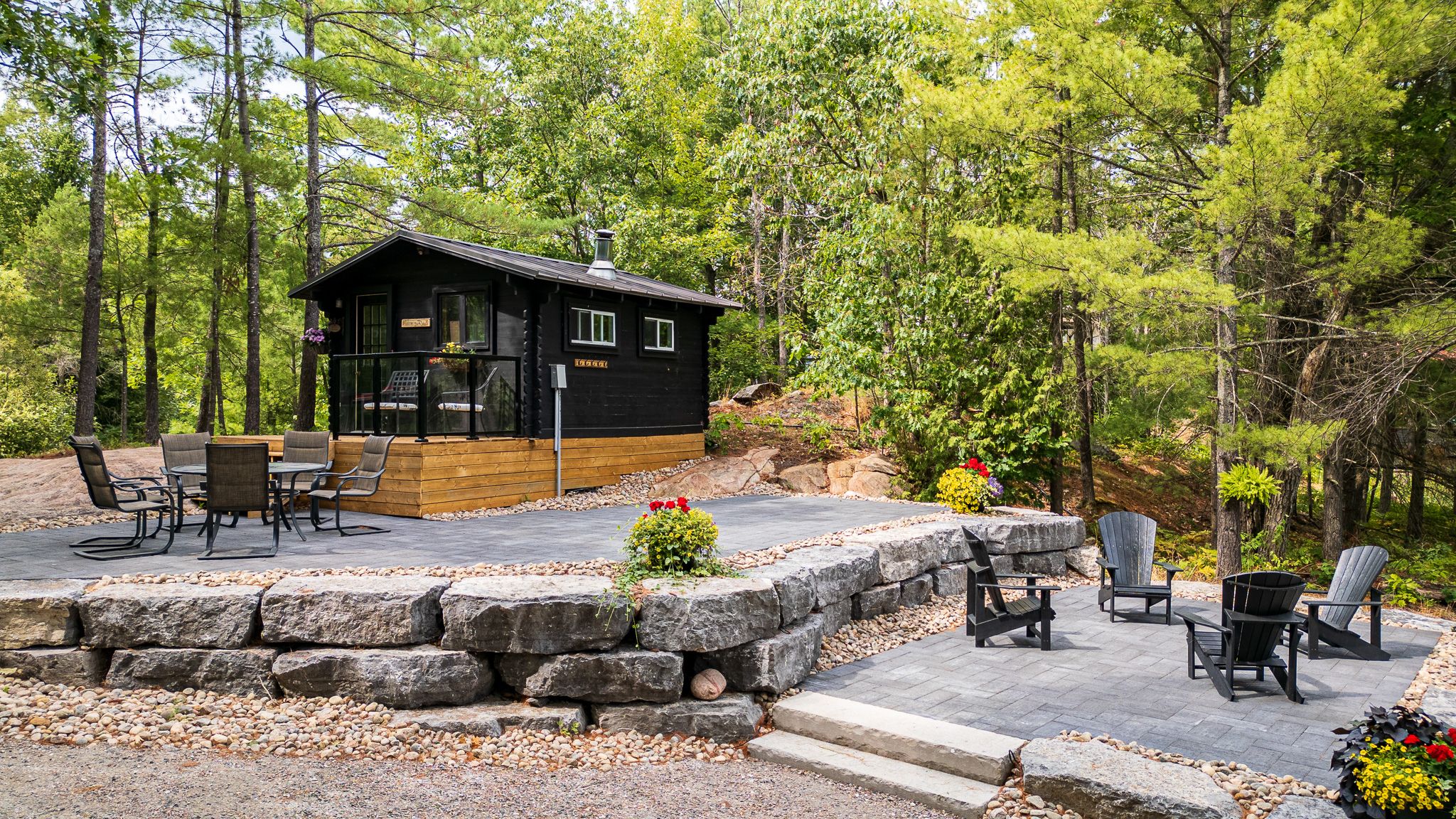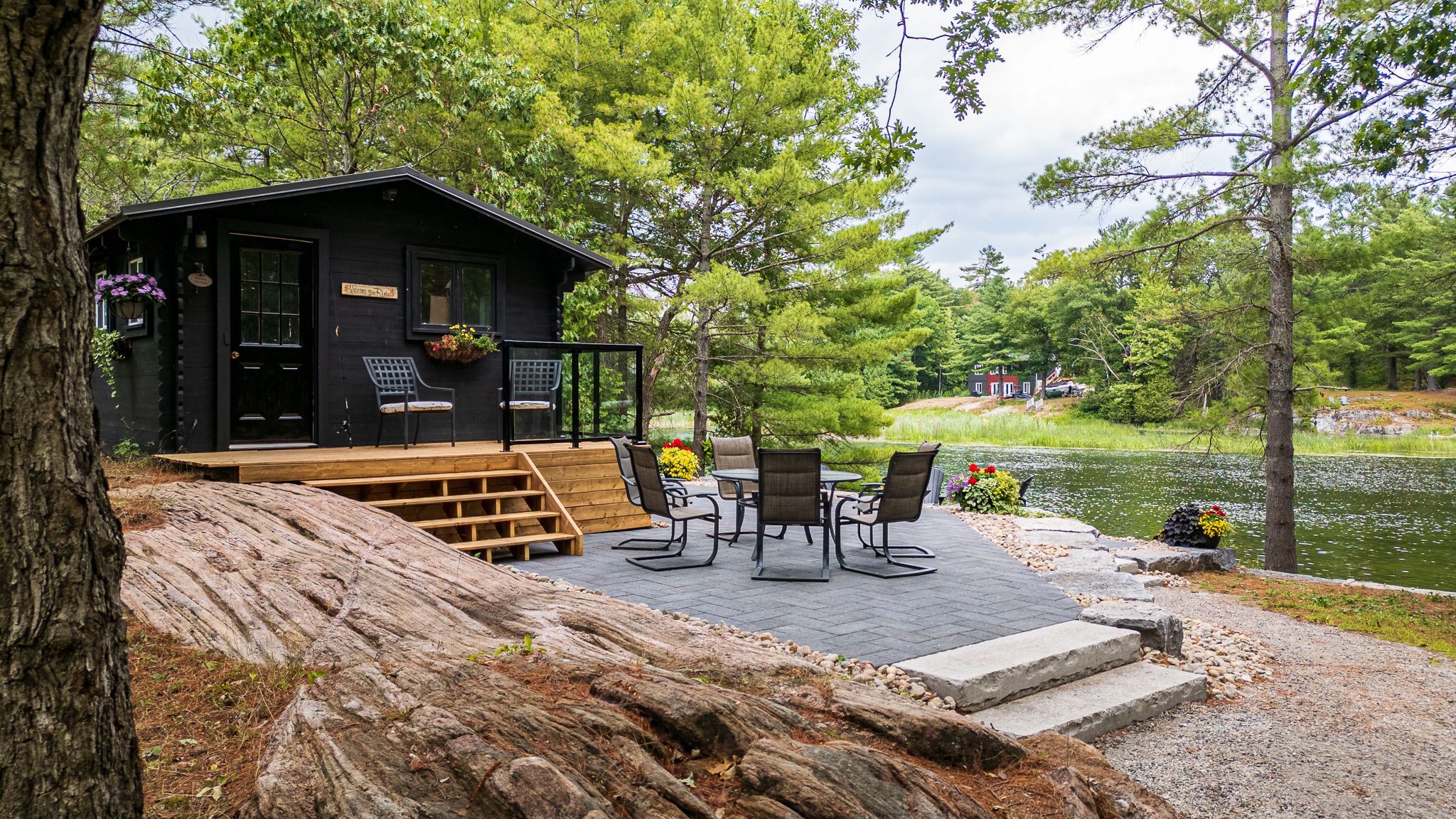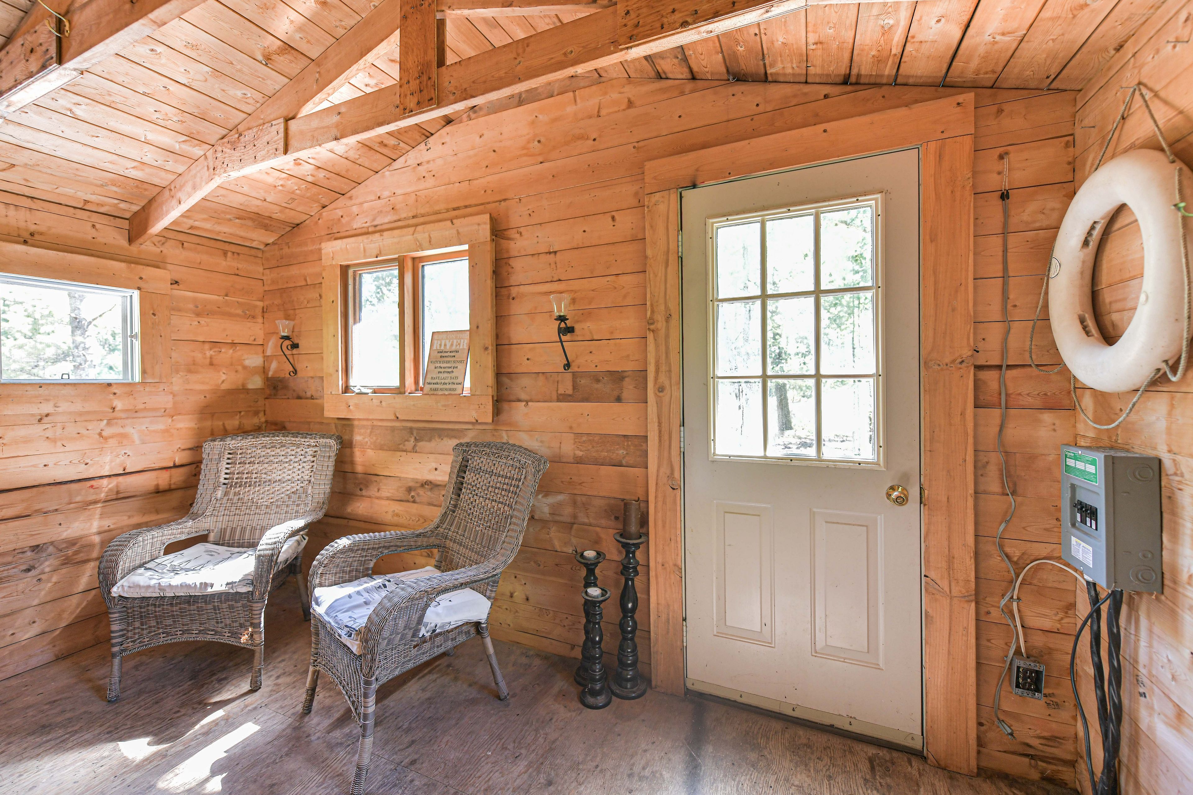 • Multiple outdoor areas including patios, fire pits, and a riverside bunkie.