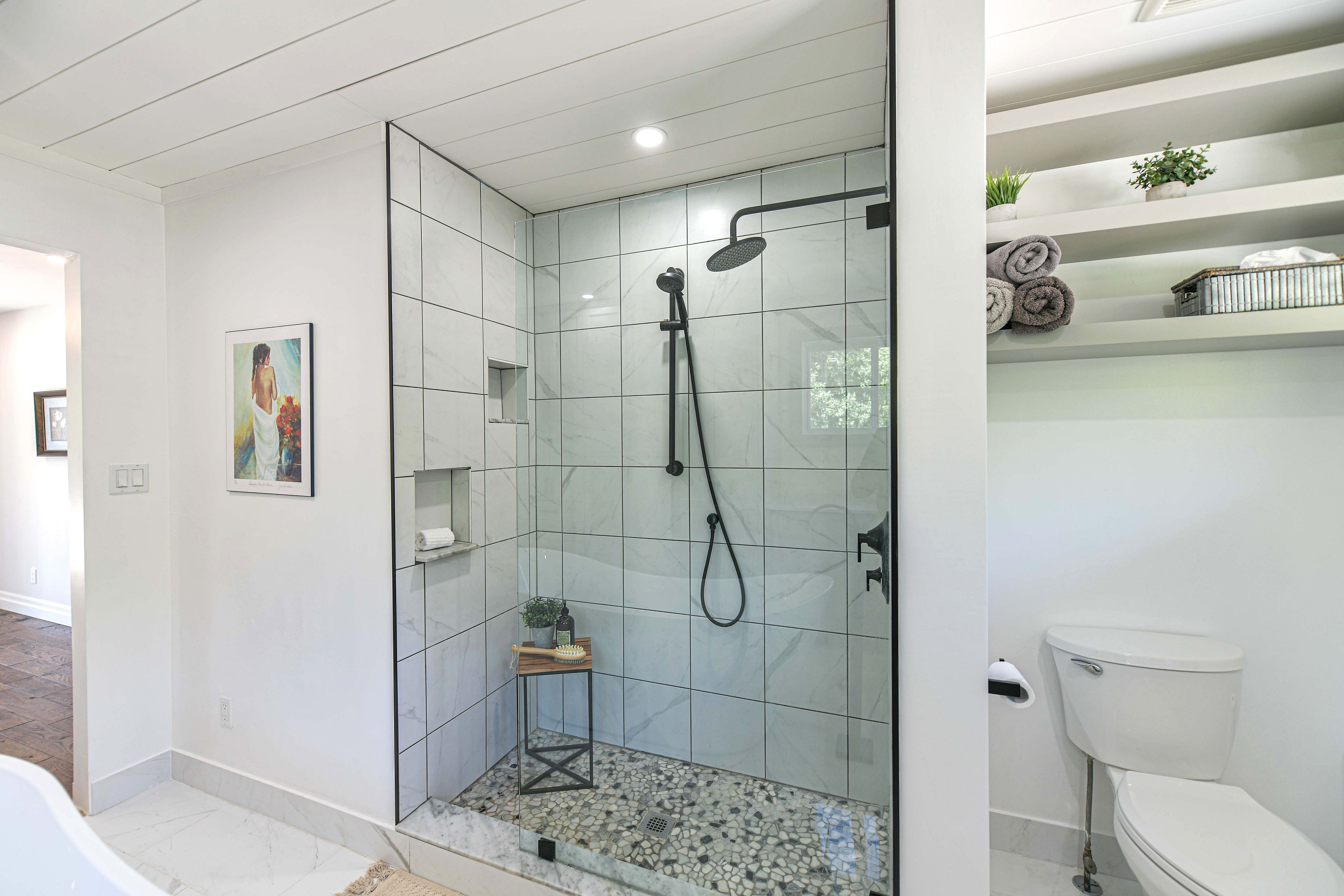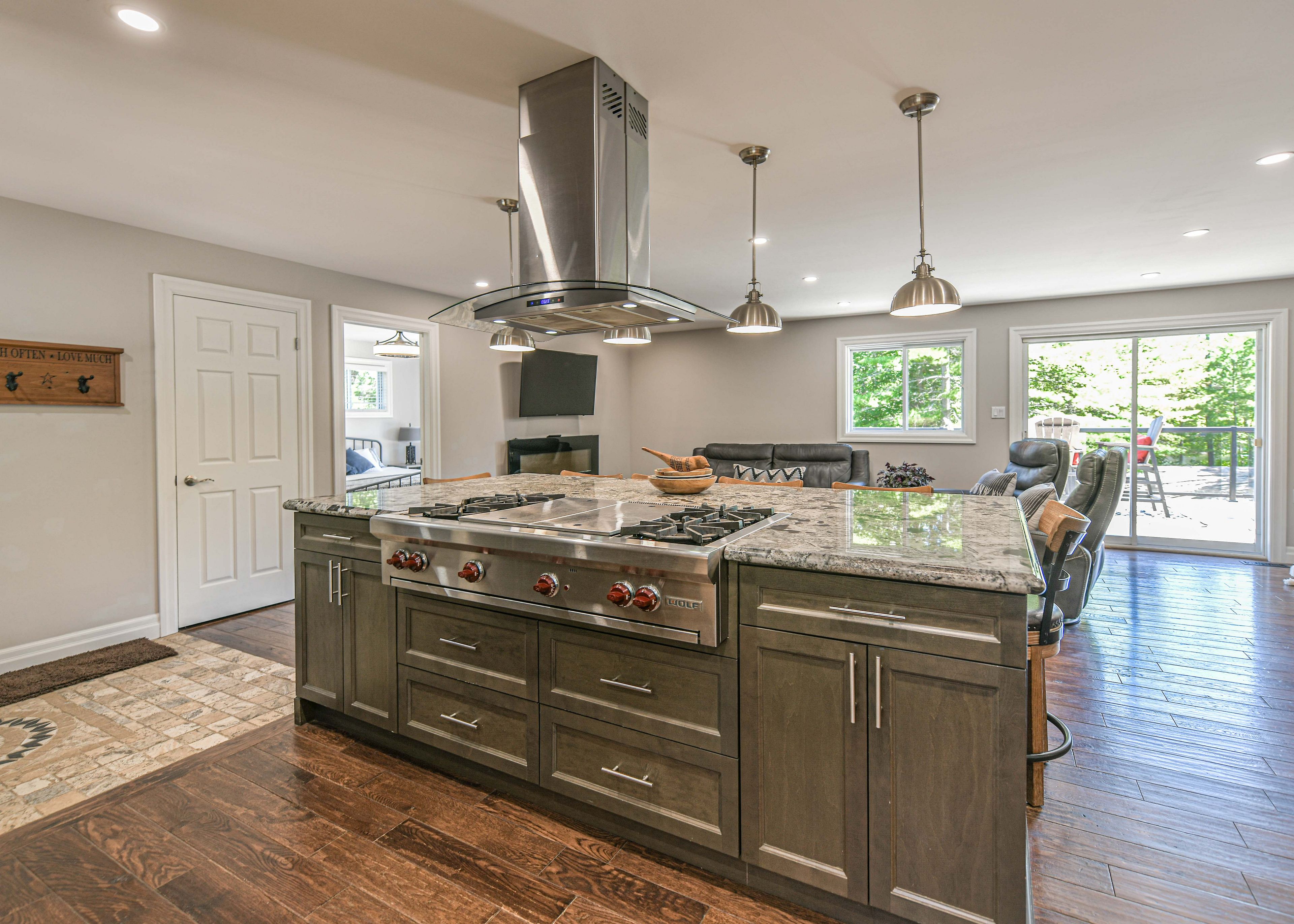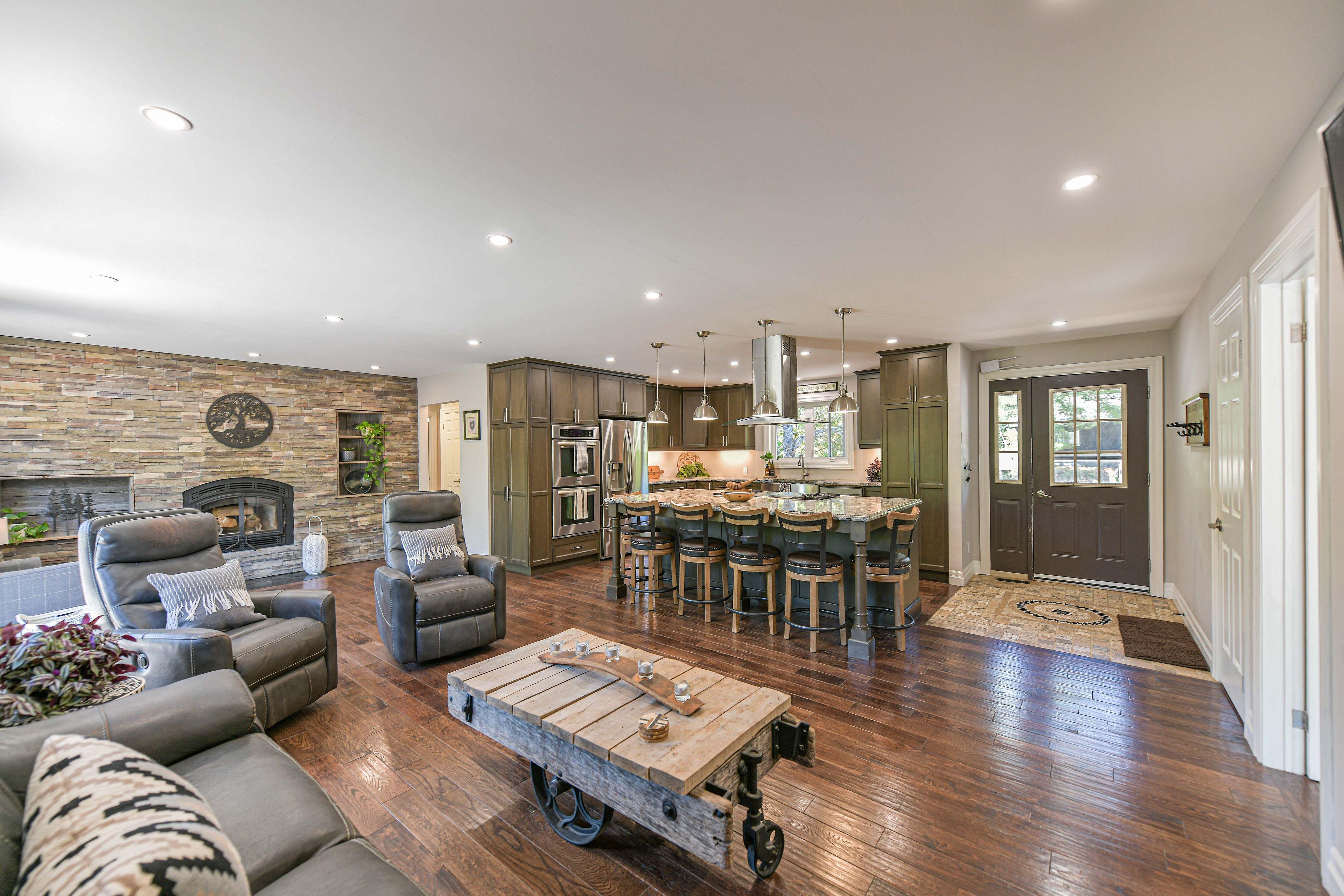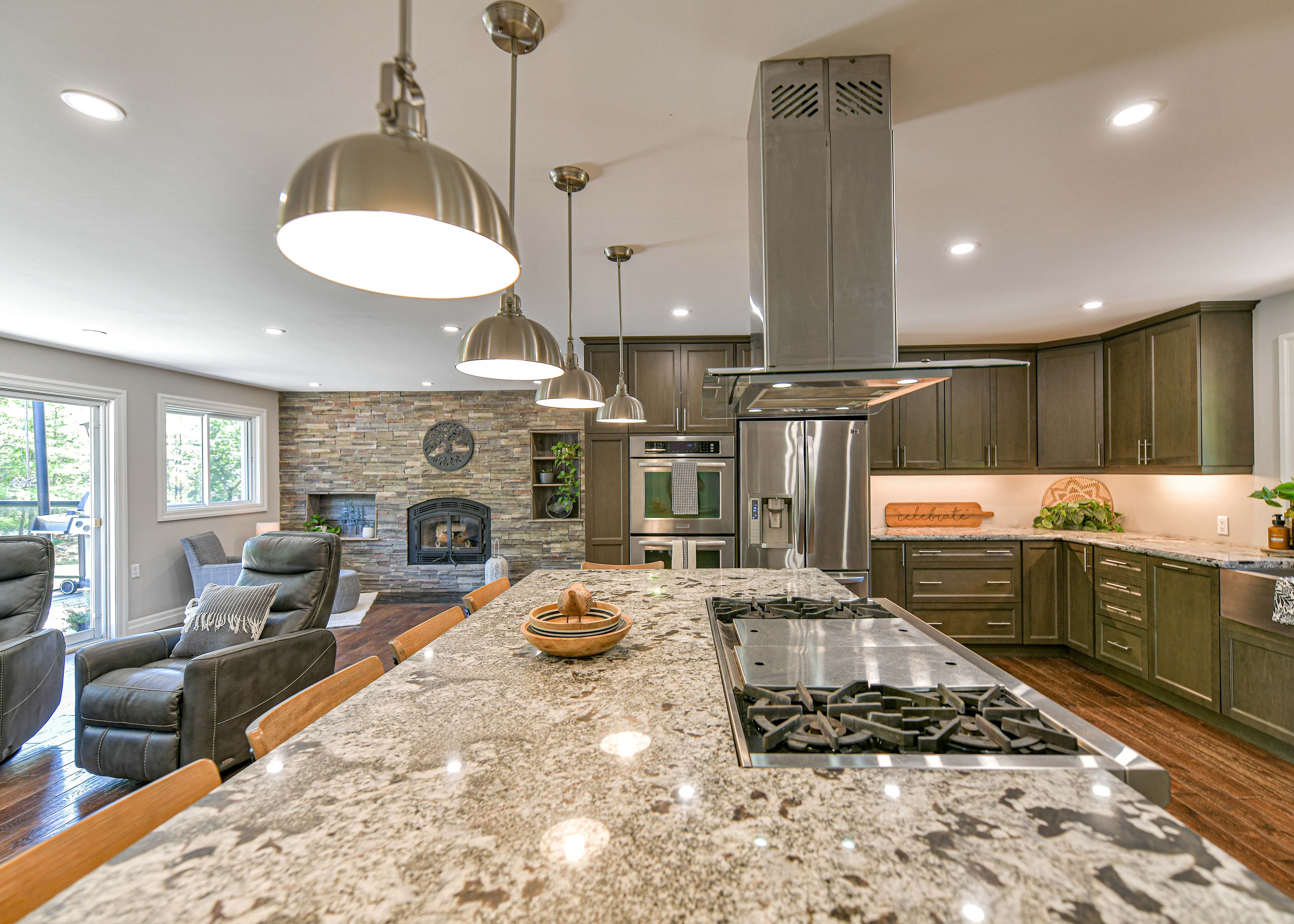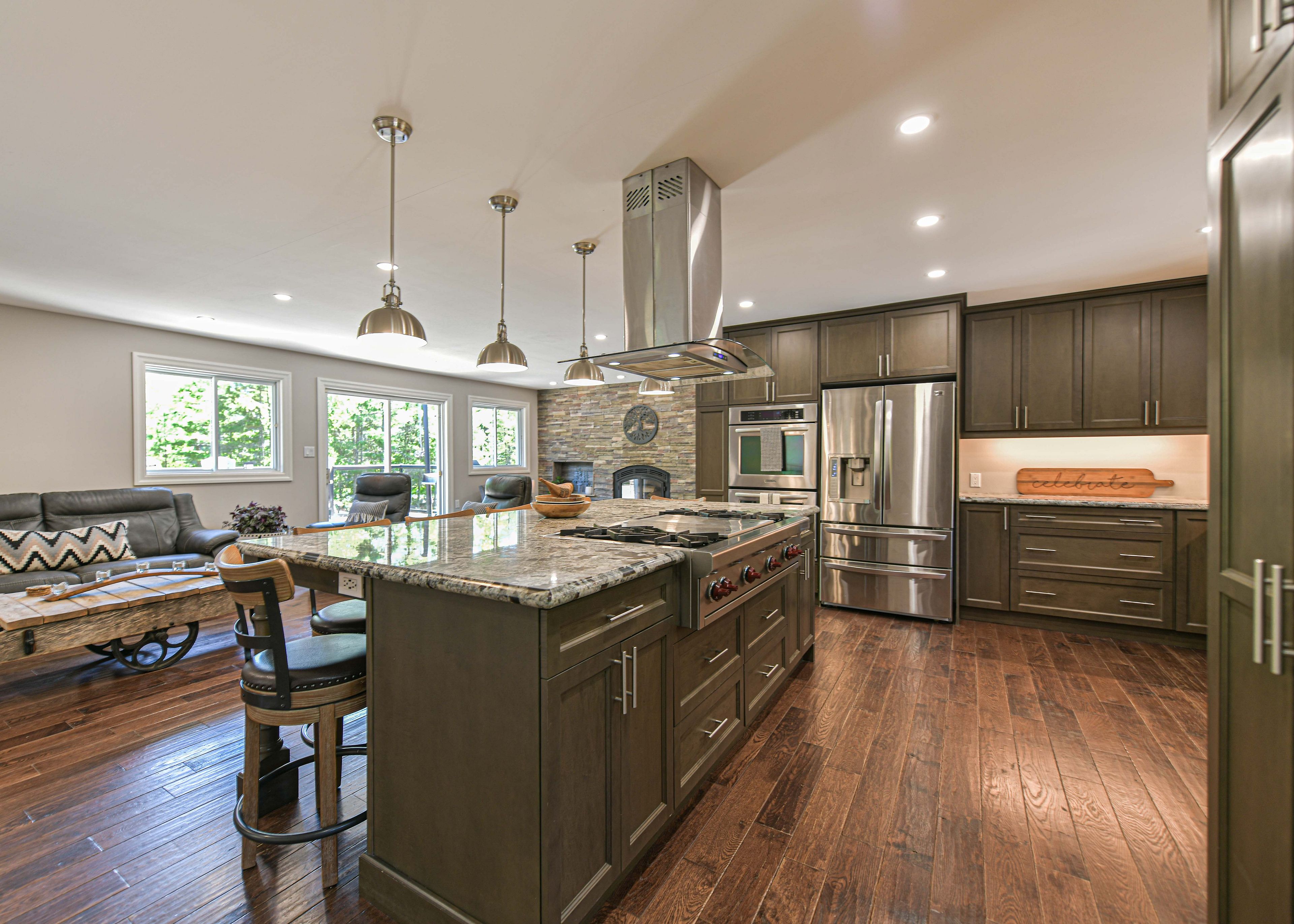 • Custom chef's kitchen adjacent to a cozy living space with a fireplace.