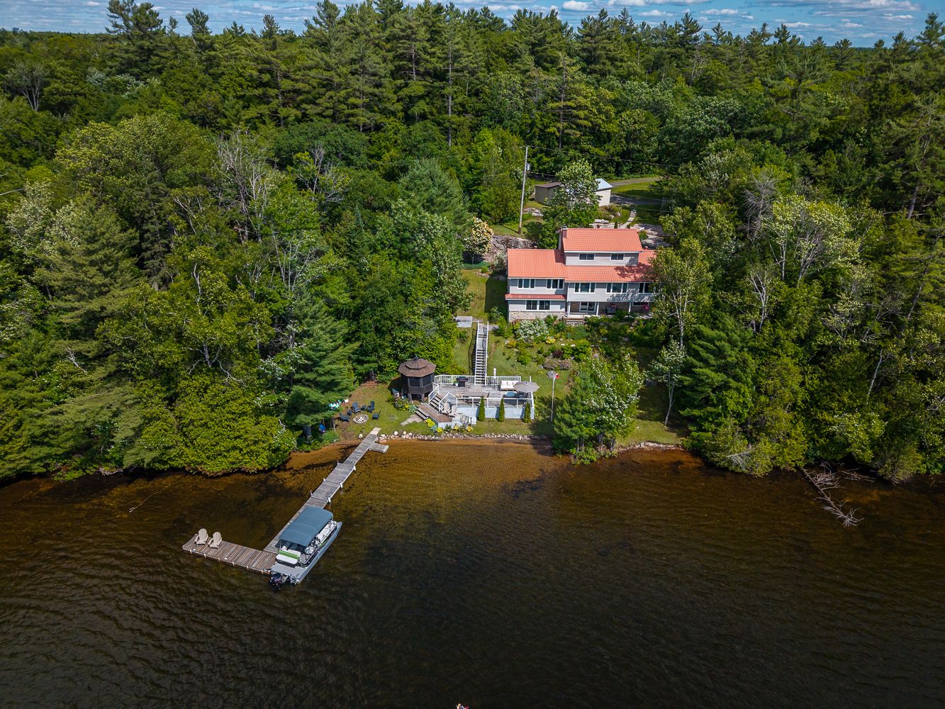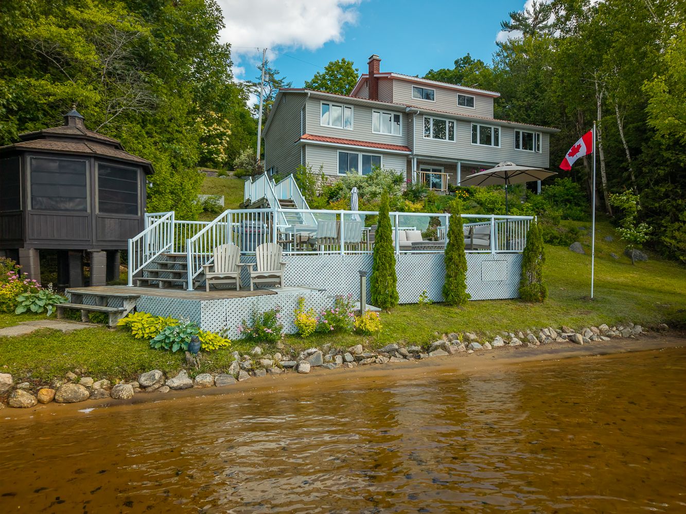 This exceptional year-round cottage or home offers 200 feet of west-facing shoreline with owned shore road allowance on the pristine waters of little whitefish lake. Part of a peaceful three-lake chain with boating access to big whitefish and clear lake, this property features stunning sunset views, a beautiful sandy beach stretching the entire waterfront, and deep water off the dock, perfect for swimming and boating. Complementing this, is a large lakeside deck with an attached enclosed gazebo. This well-built and lovingly maintained home offers over 3,800 square feet of finished living space with an updated kitchen, spacious living and dining areas, a cozy den, and a bright enclosed porch overlooking the lake. The main floor primary suite includes a large bedroom, sitting room, 4 piece ensuite, walk-in closet, and storage space with potential for a laundry or kitchenette, making it ideal for guests or multi-generational use. Upstairs you'll find three additional bedrooms, 2 bathrooms, and more gorgeous lake views. The full walkout basement is designed for entertaining, with a built-in bar, large family room with propane fireplace, fifth bedroom, 3-piece bath, laundry room, and a generous insulated storage room. Fully winterized with a deep drilled well, propane furnace and central air (both new in 2021), and easy year-round access via a paved, well-maintained road. Two garages (double and a single) with ample room for vehicles and/or watercraft. Located just 10 minutes from highway 400, this beautiful home is close to the charming village of rosseau, and a short drive to parry sound. Luxury certified.