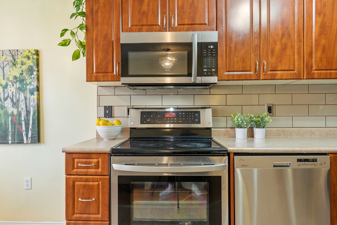 • Eat-in kitchen with stylish backsplash and stainless steel appliances.