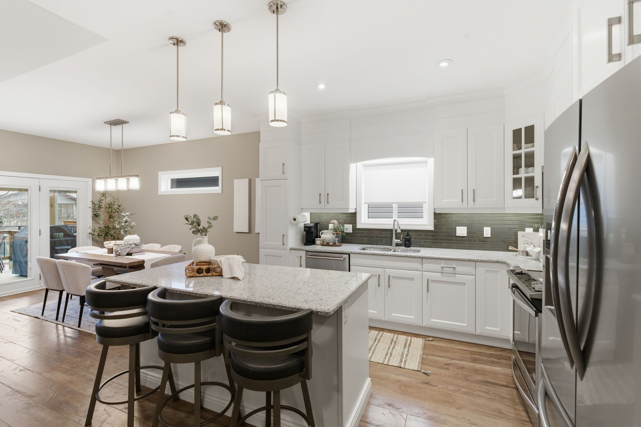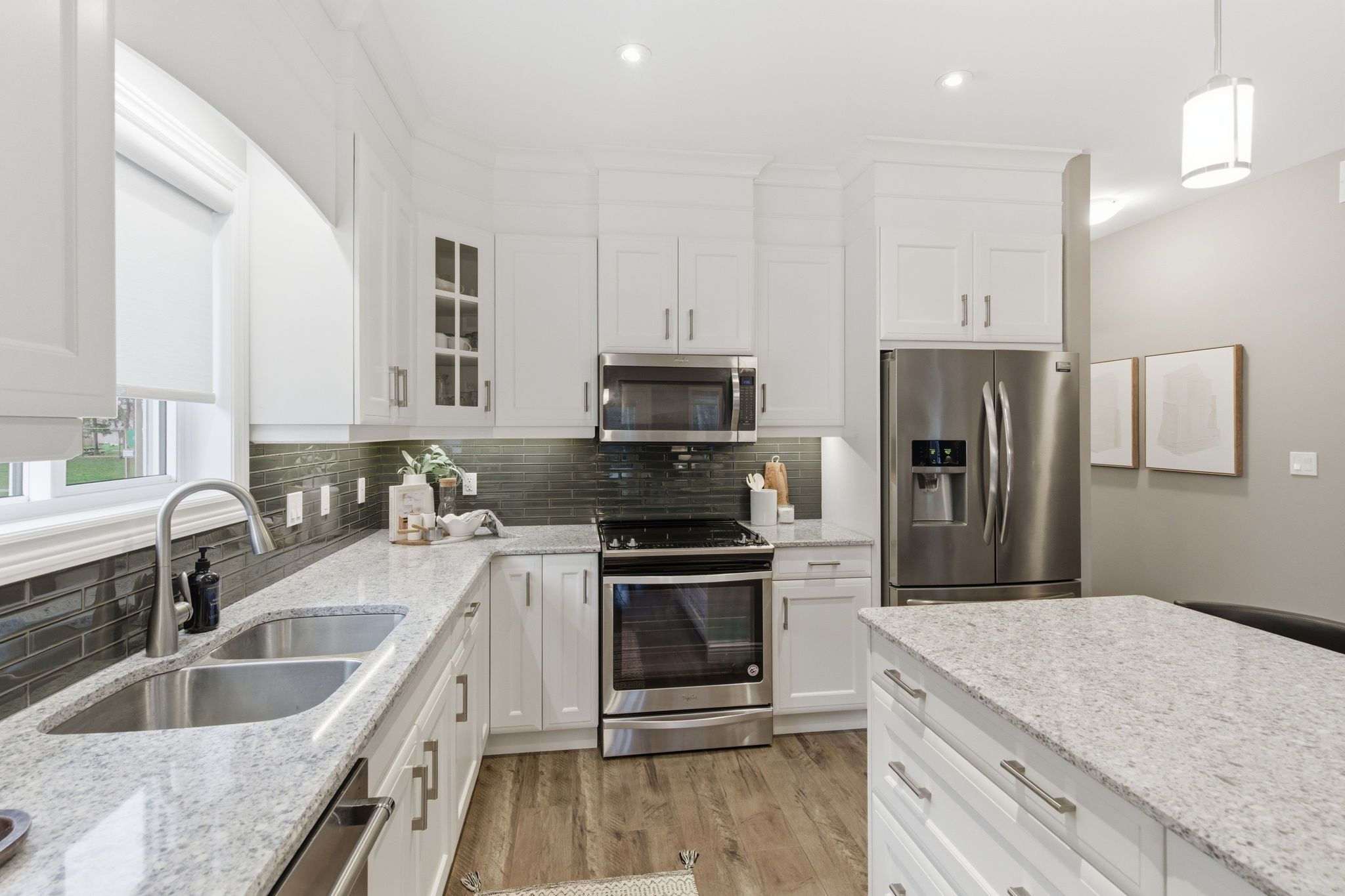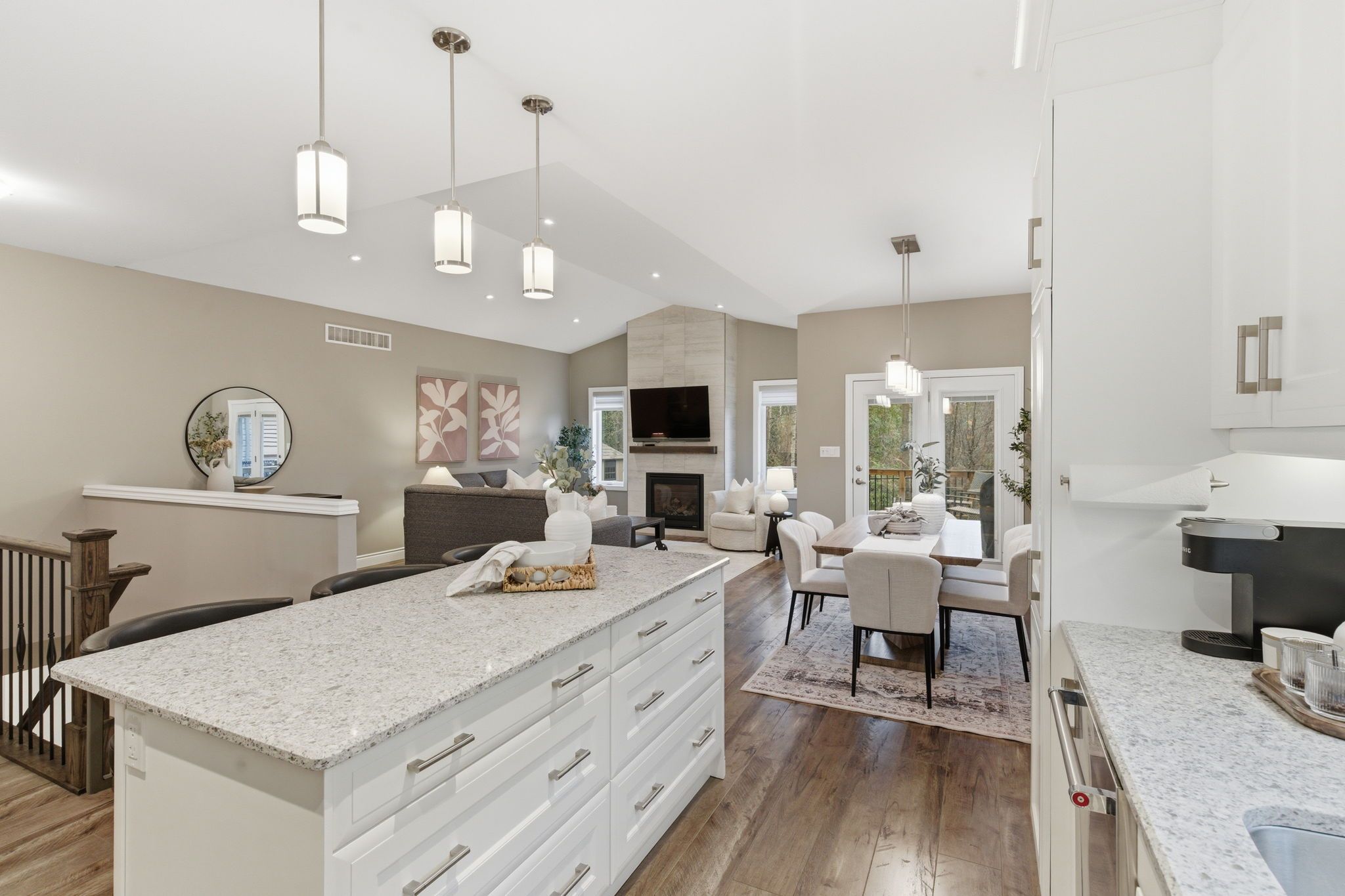 • Modern open concept kitchen with large island, quartz countertops, and stainless steel appliances.