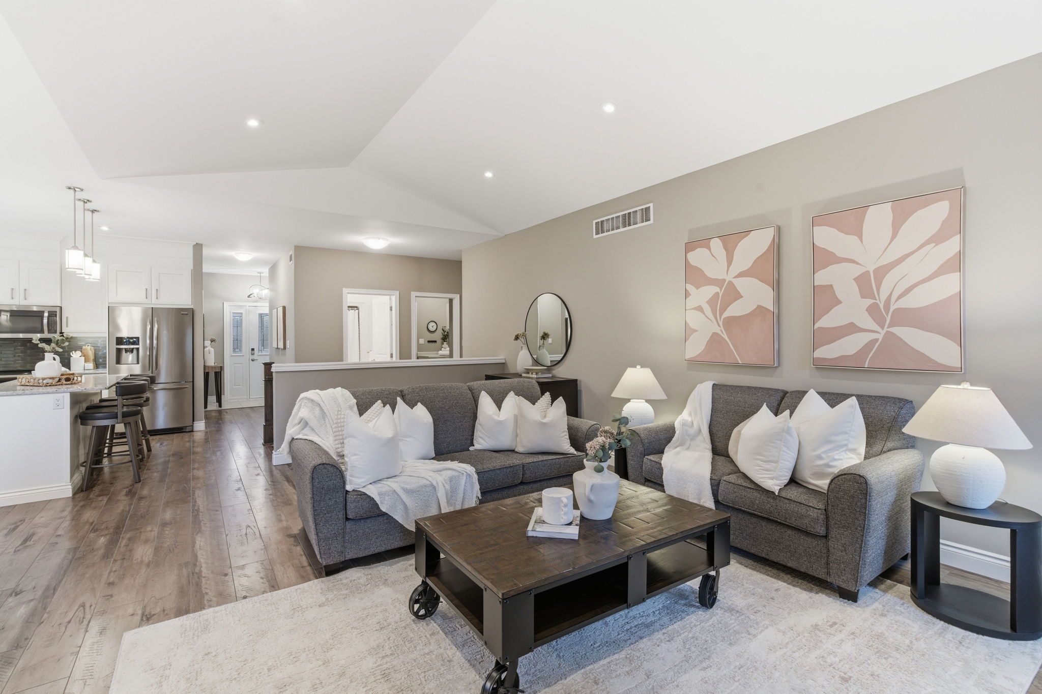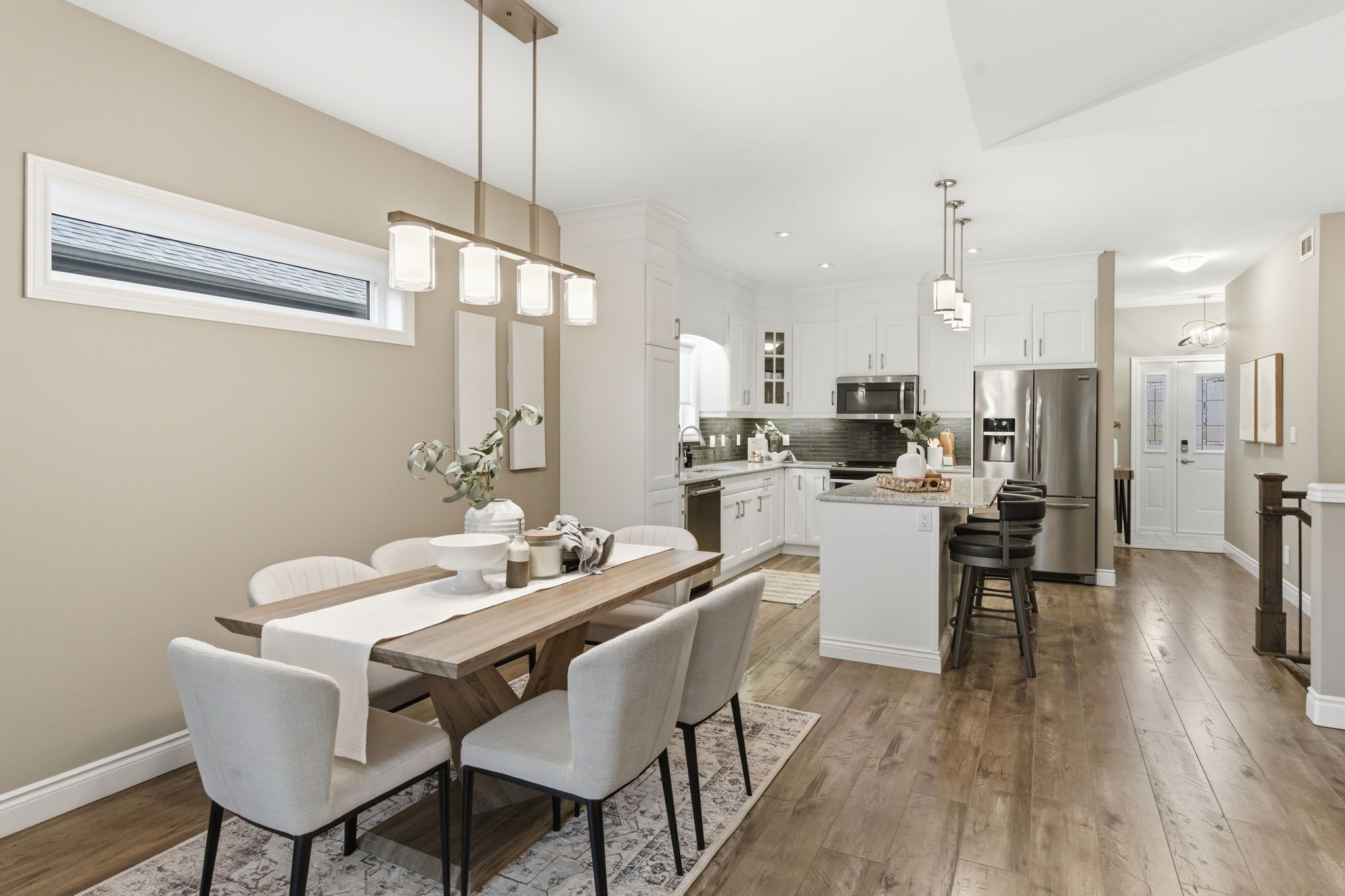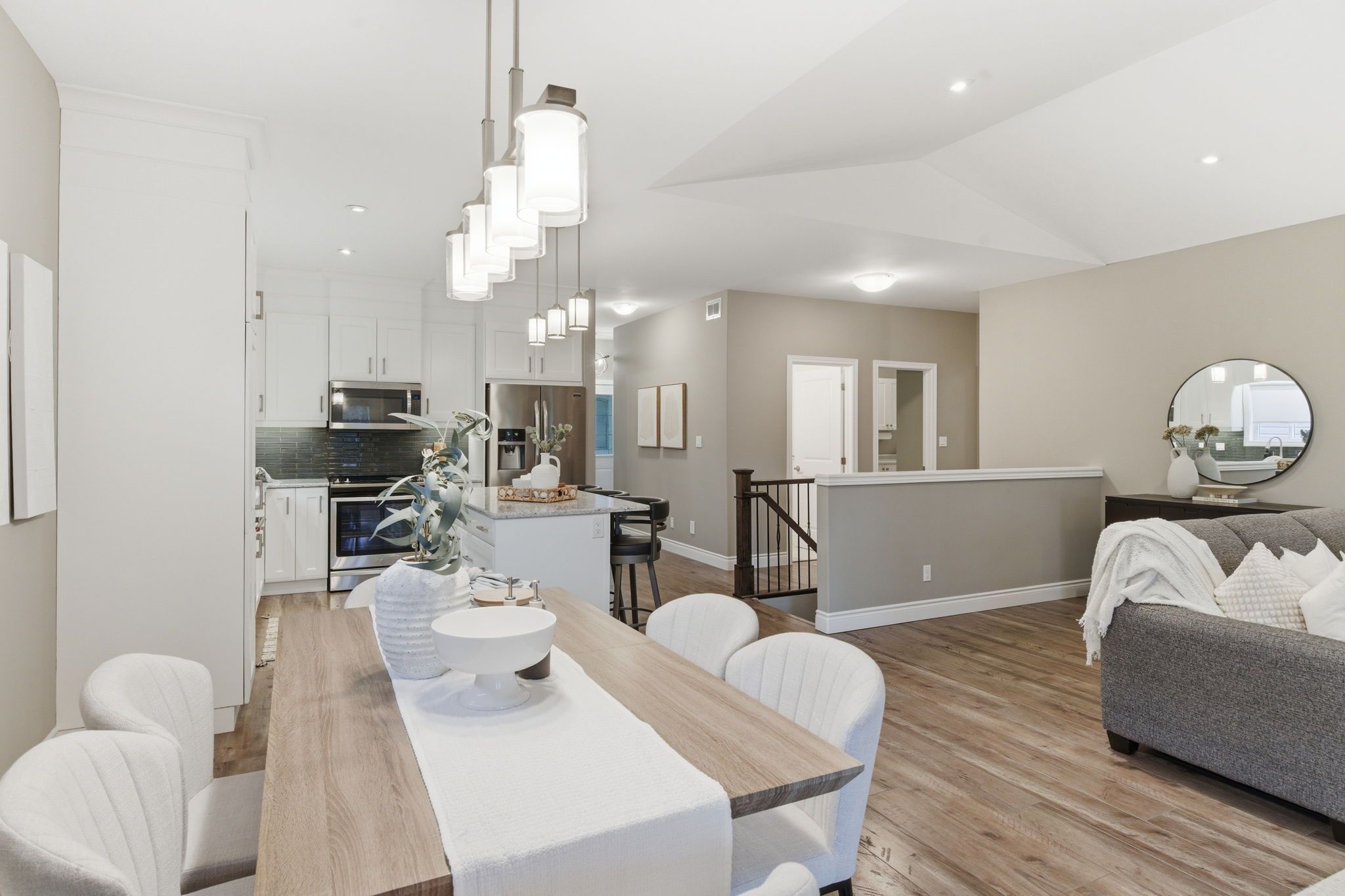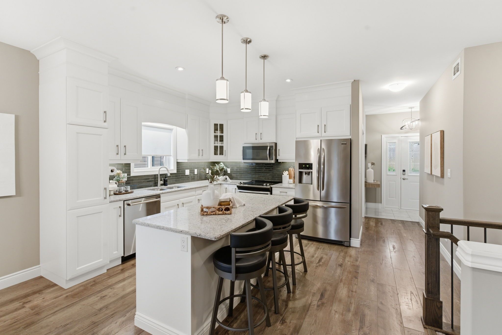 • Modern open concept kitchen with large island, quartz countertops, and stainless steel appliances.