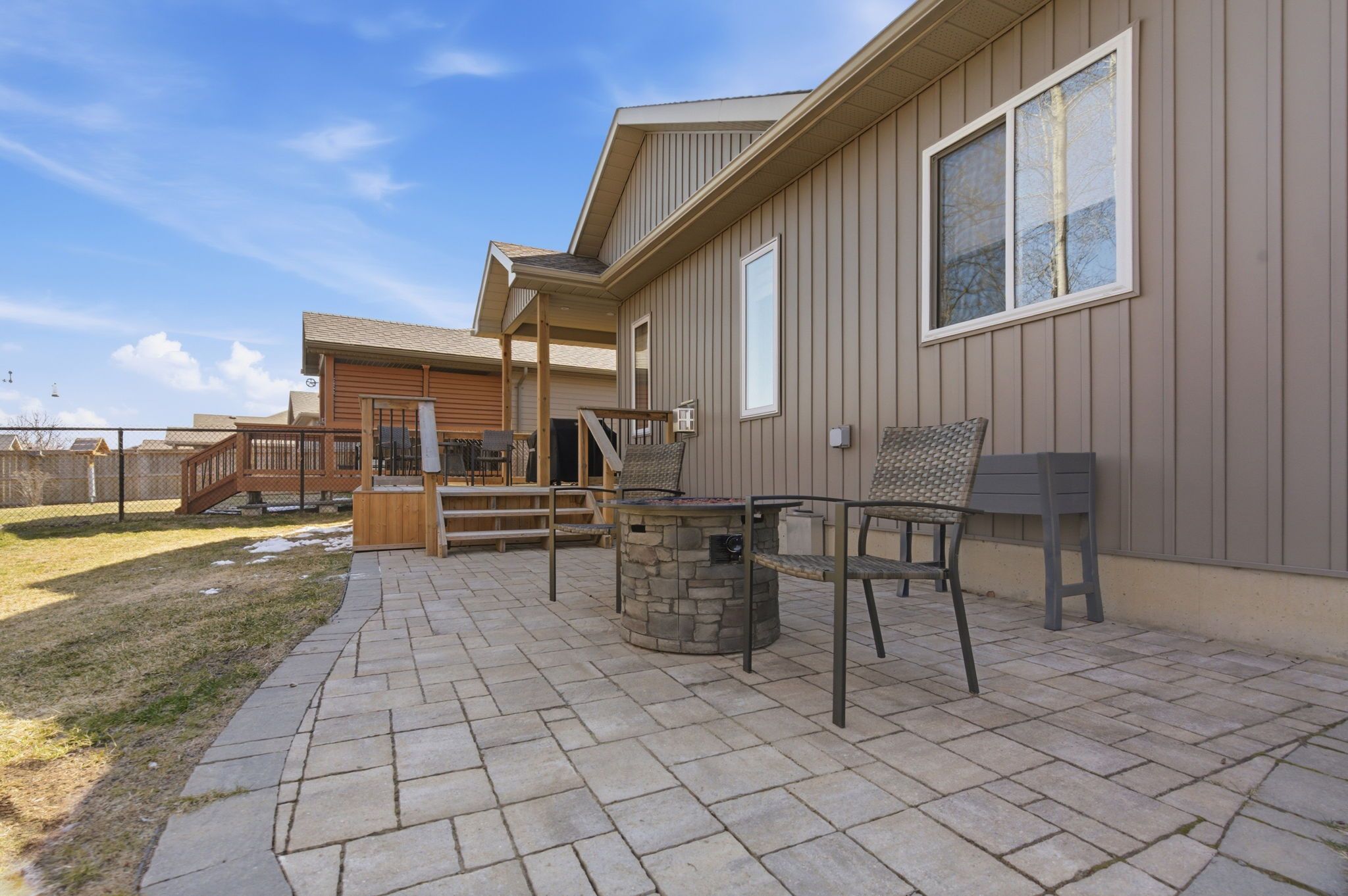 • Private backyard oasis with deck, surrounded by mature trees for relaxation.