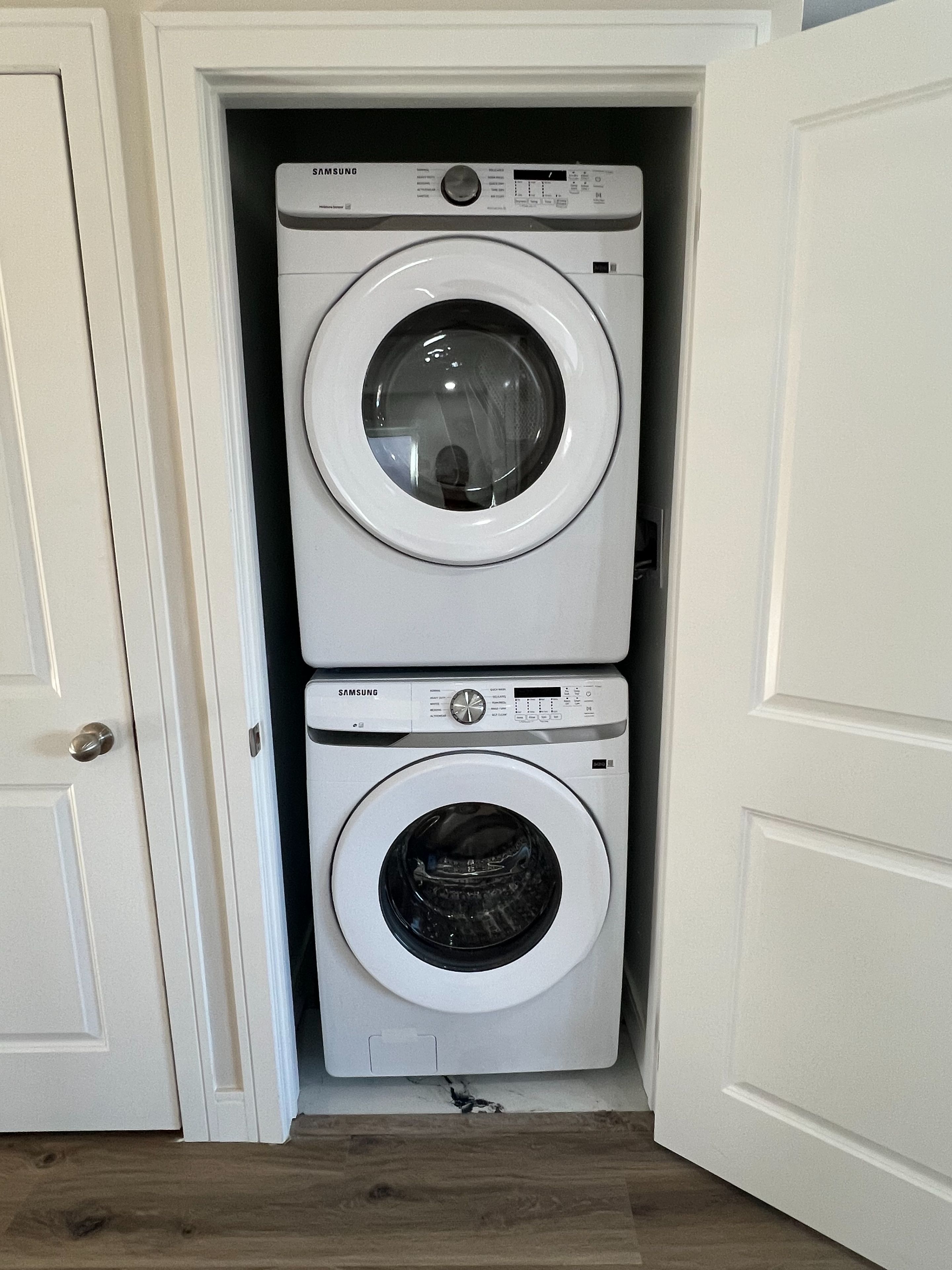 • Fully equipped kitchen with stainless appliances and quartz countertops.