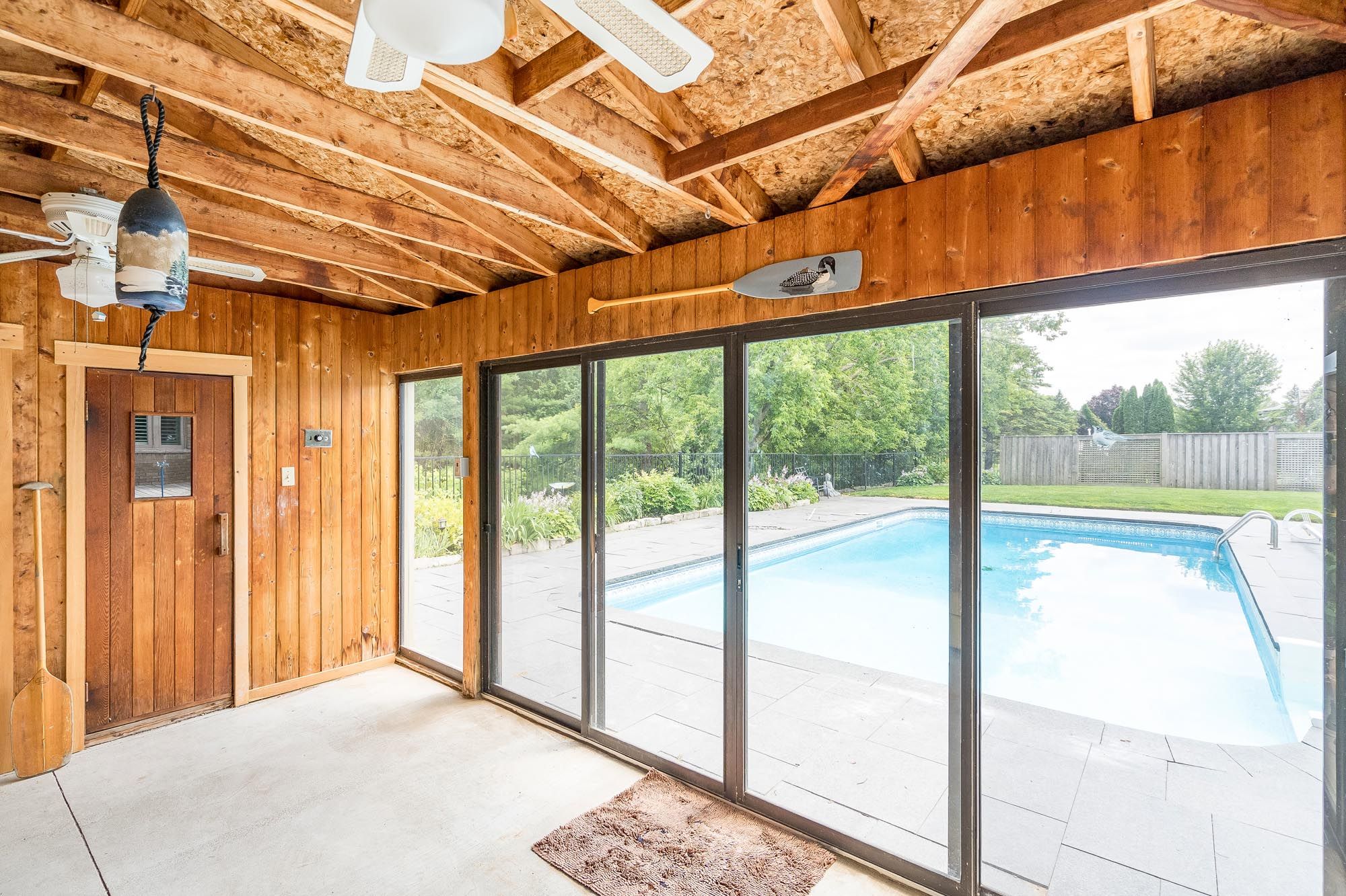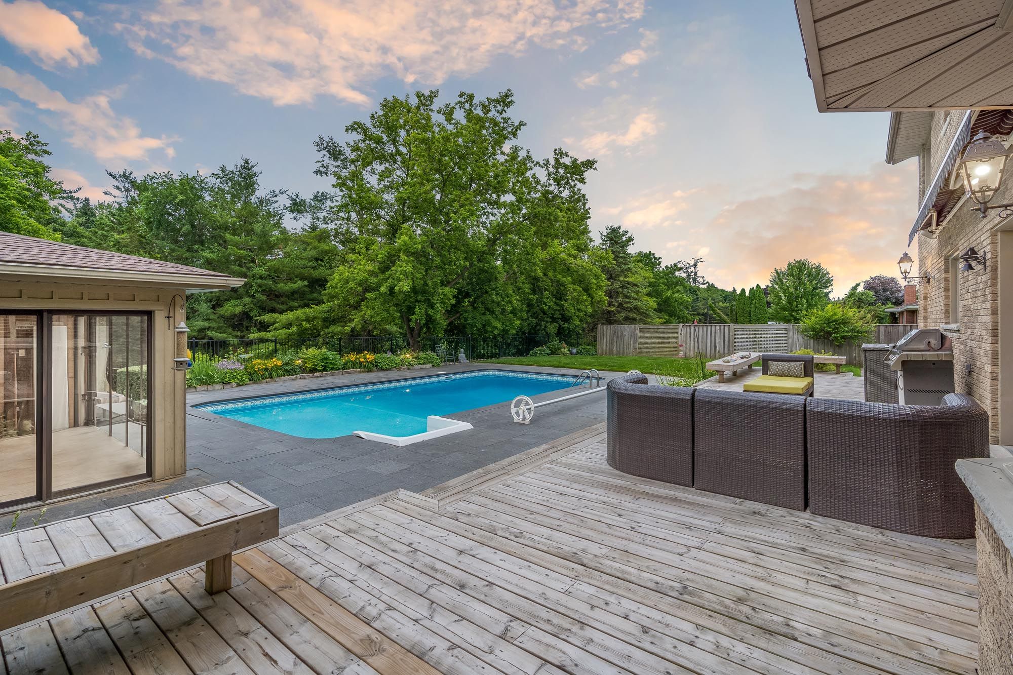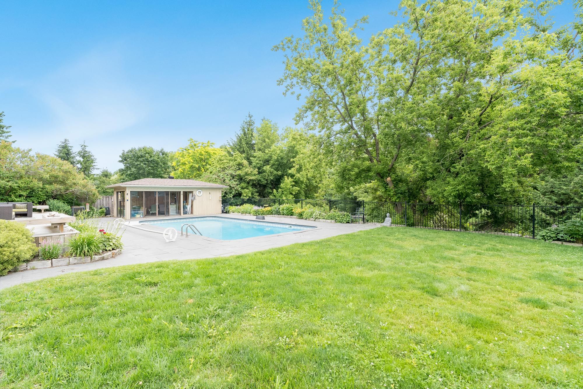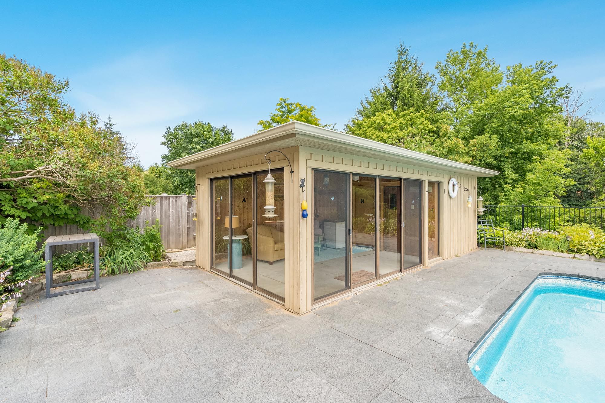 • Private backyard oasis with an inground saltwater pool and custom pool house.