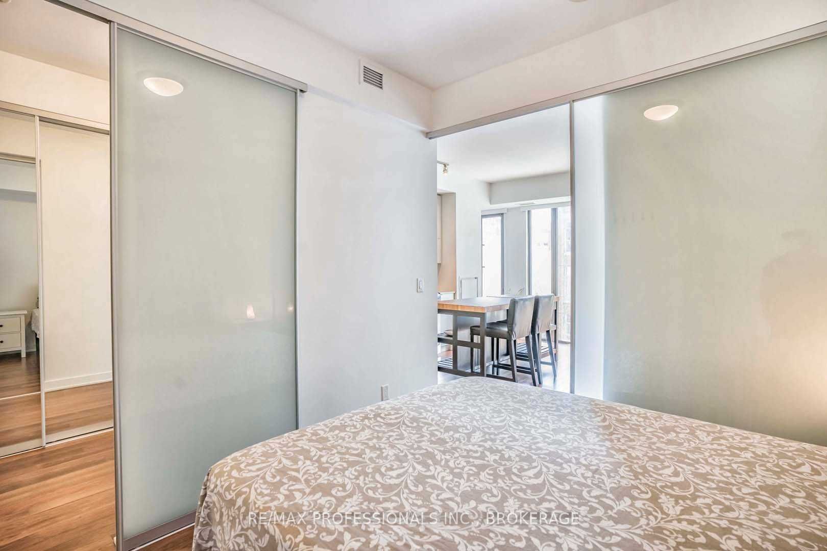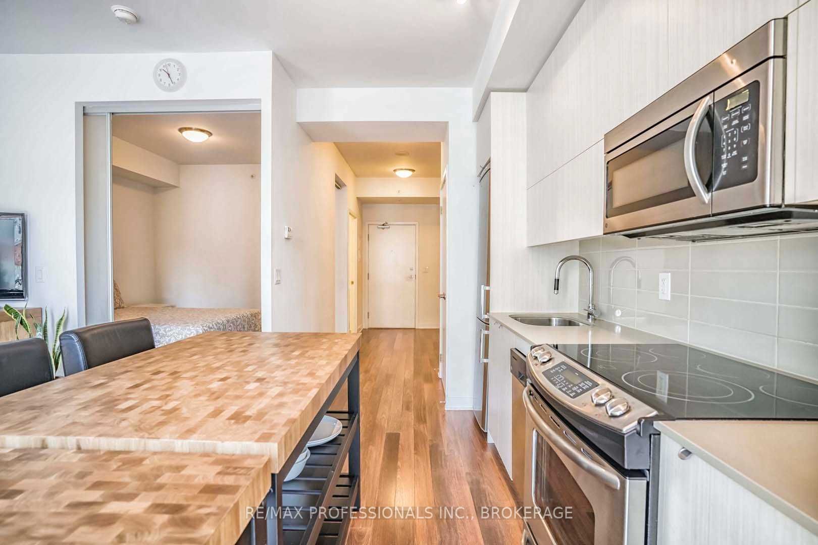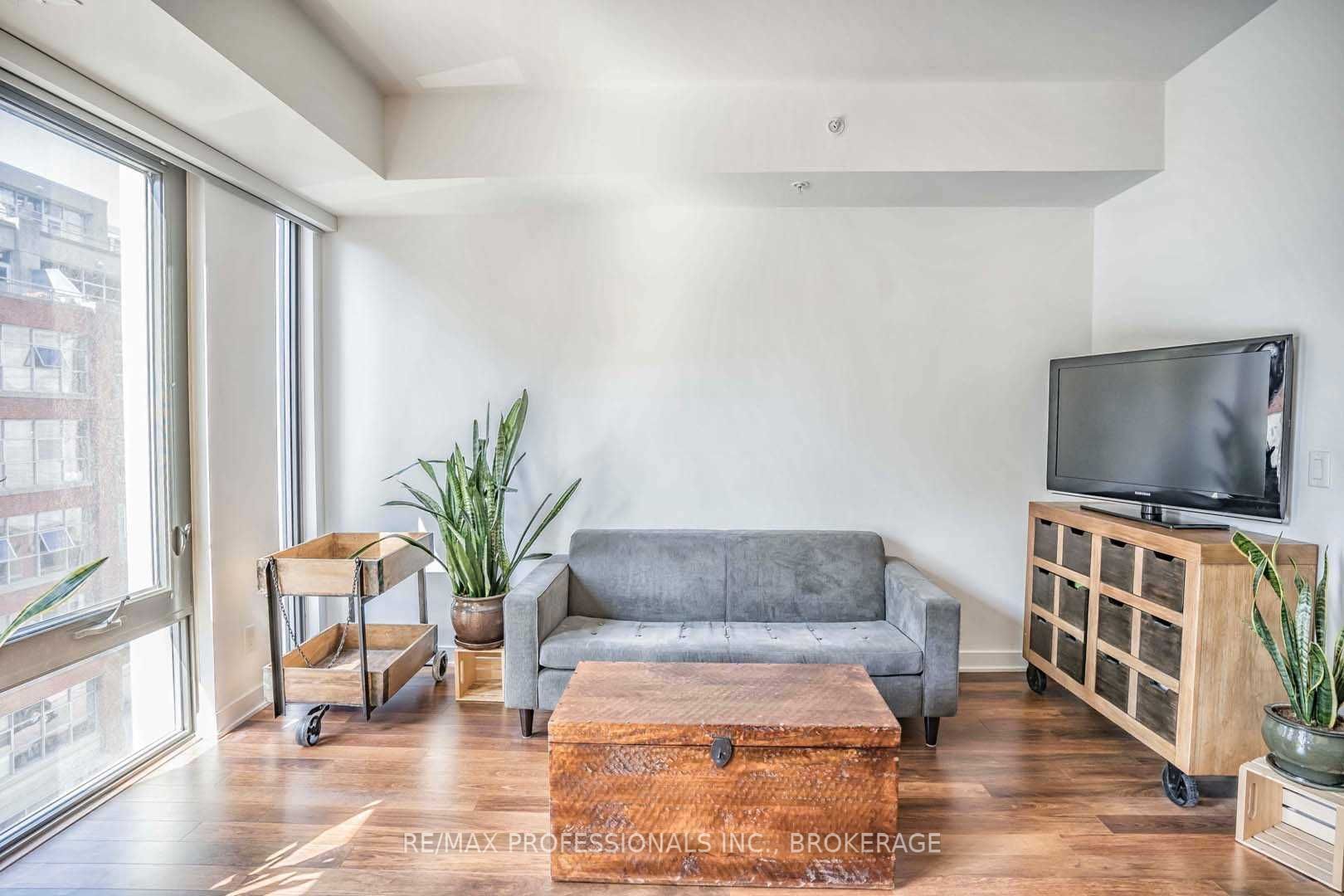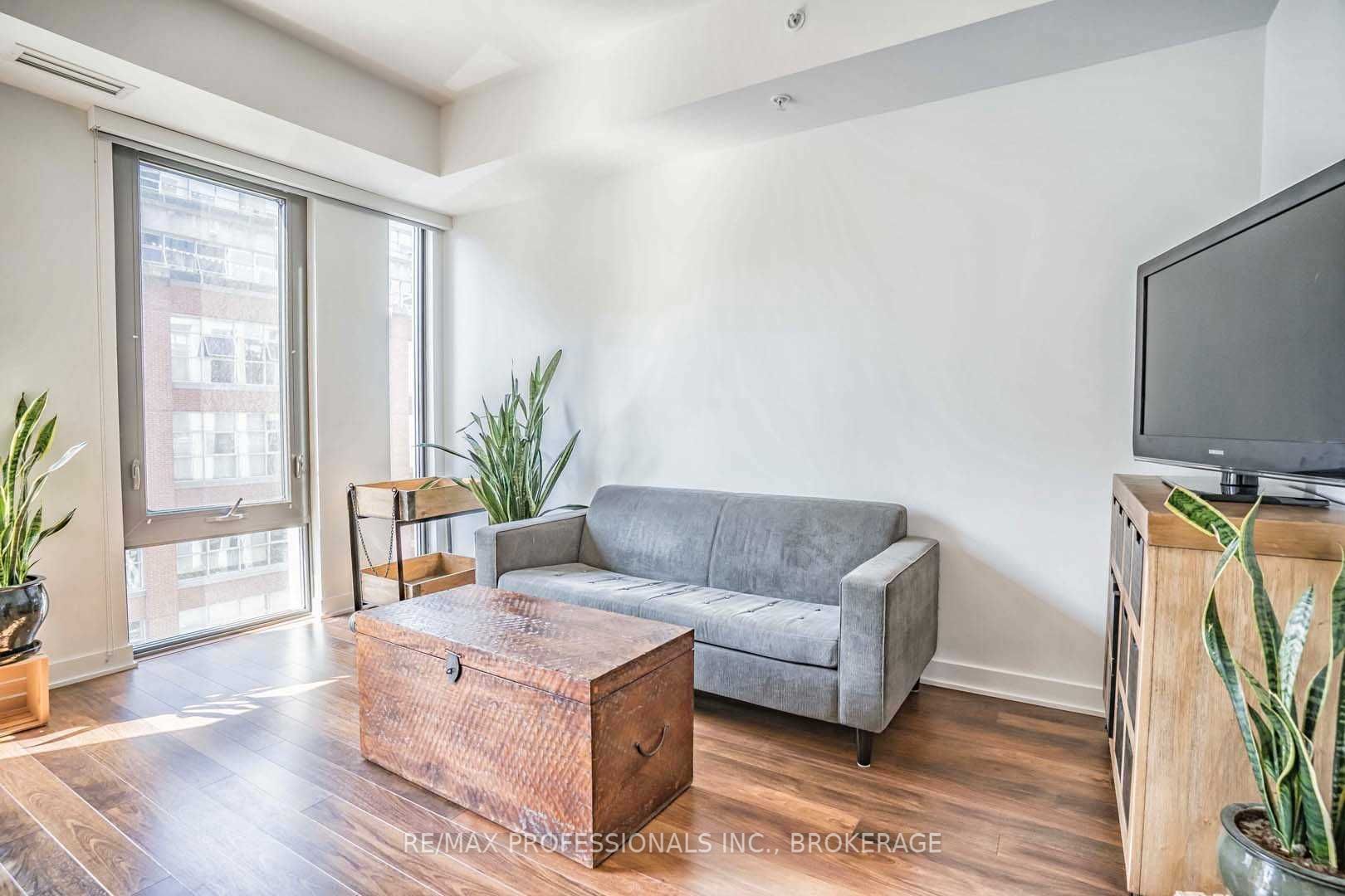 Welcome to thirty two camden lofts in the heart of toronto's fashion district, just steps to king st west, queen west, the entertainment district, and some of the city's best restaurants, cafés, shops, parks, and nightlife. Transit at your doorstep with multiple streetcar lines and easy access to the financial district. This bright south-facing 1 bedroom, 1 bathroom suite offers an efficient, functional layout designed to maximize every square foot. Featuring 9 ft ceilings, floor to ceiling windows, and a modern open concept design with excellent flow for both living and working from home. Spacious living area. Boutique, well-managed building known for its quiet atmosphere and upscale feel. Amenities include a gym, party / meeting room, outdoor terrace with bbq, and secure entry. Perfect for individuals seeking a stylish urban lifestyle in downtown toronto.