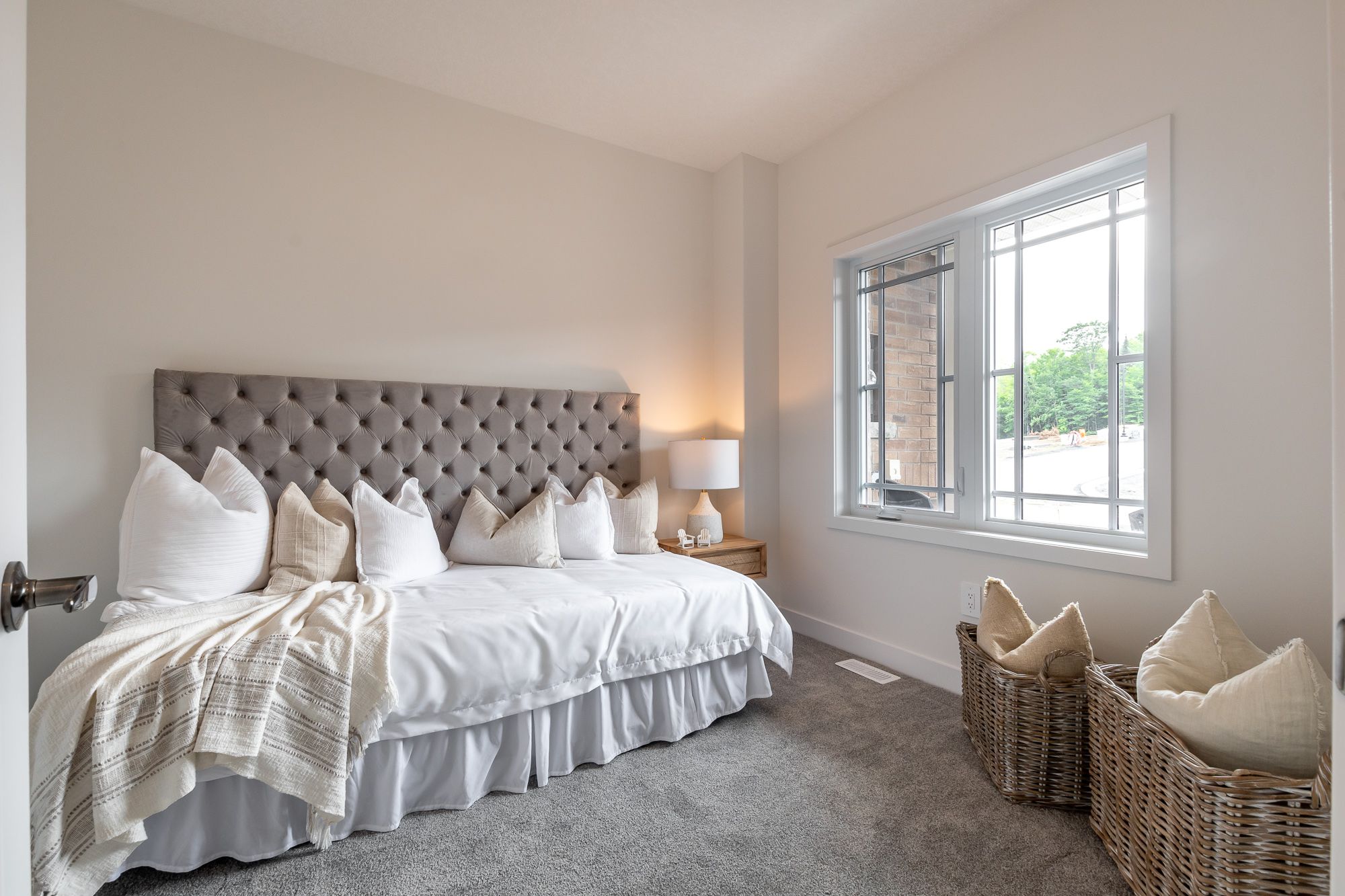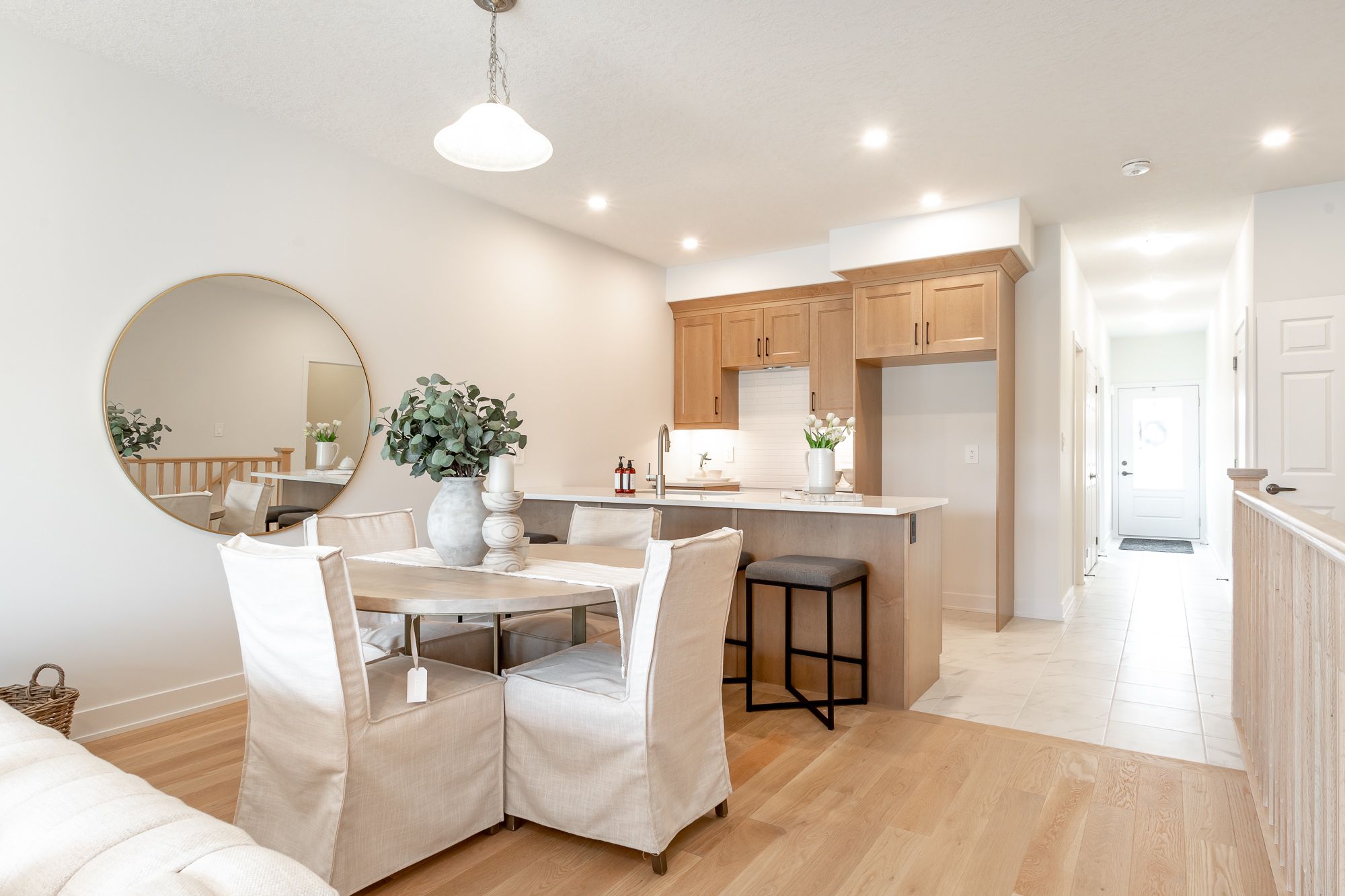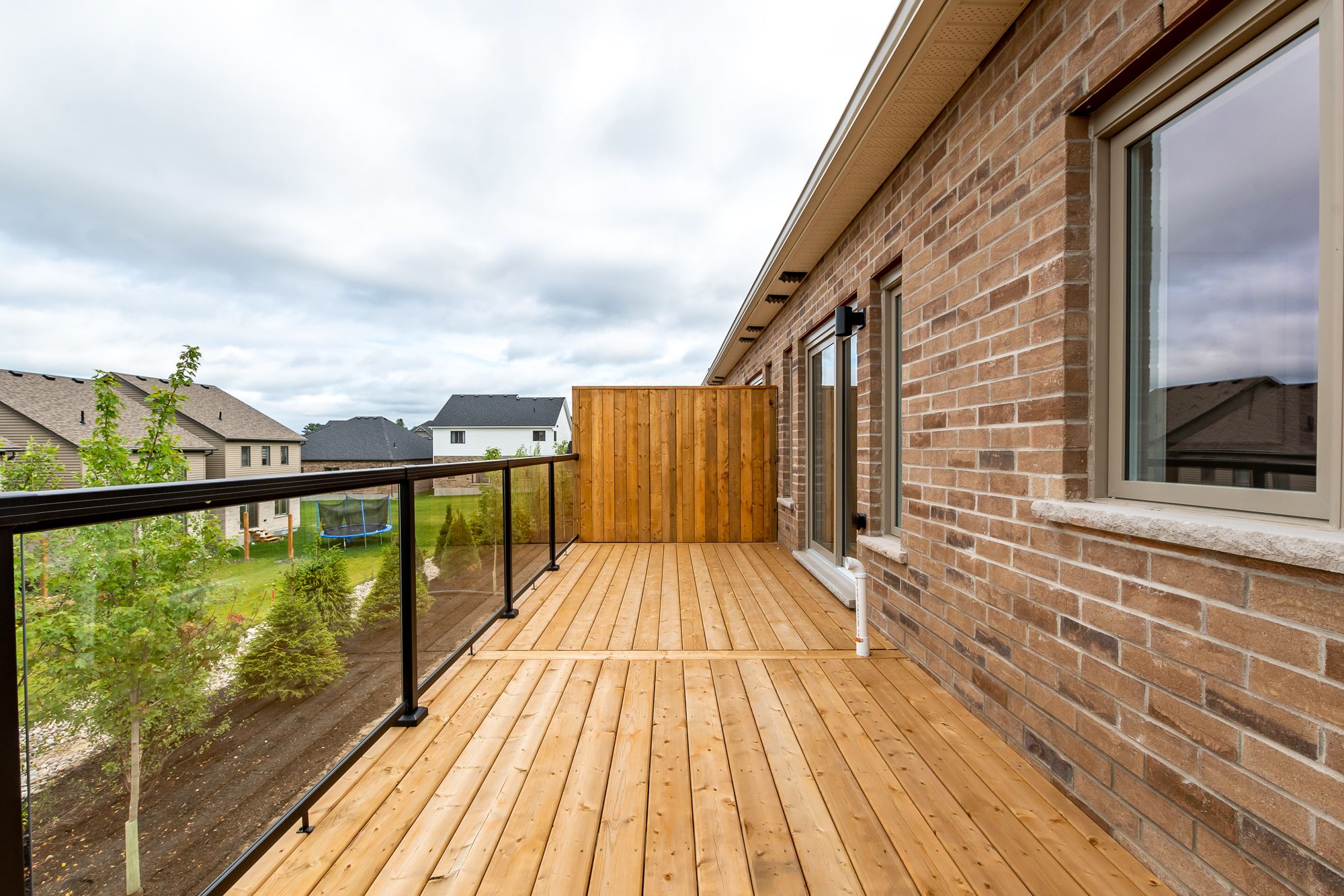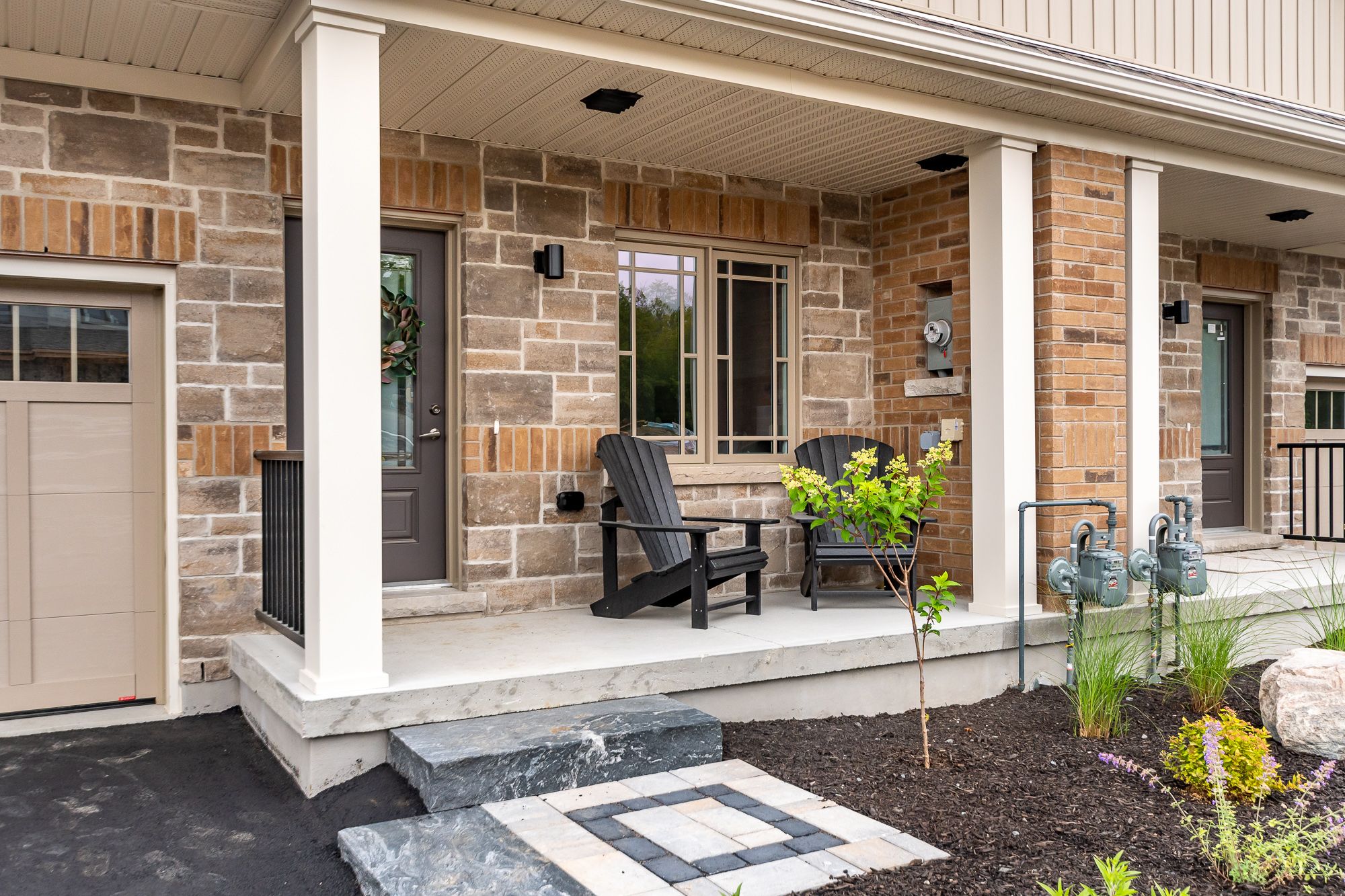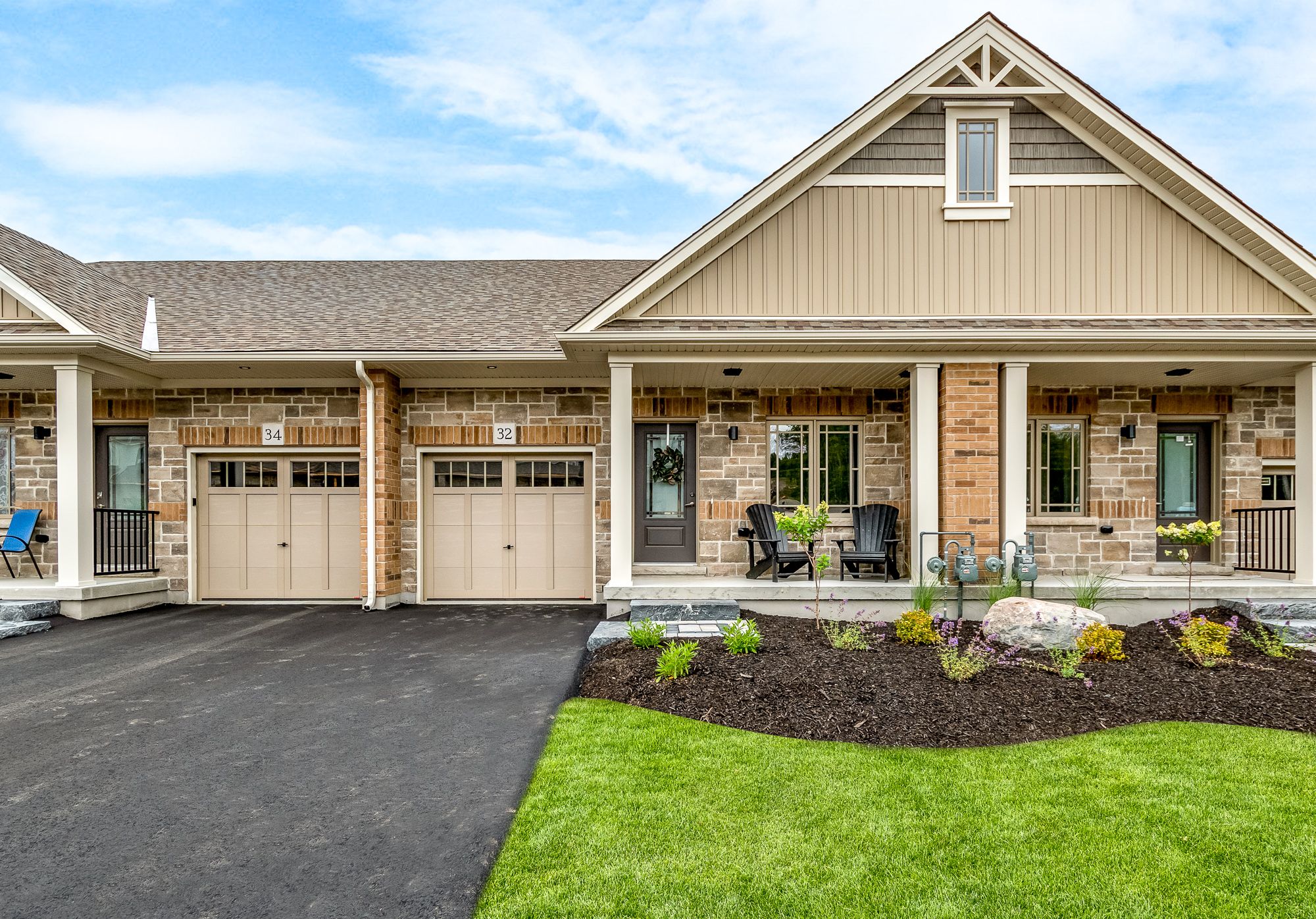 Welcome to the sought-after woodstream community, where devonleigh homes presents a new bungalow townhouse that perfectly blends comfort, style, and convenience, with no condo fees to worry about. Wrapped in a neutral exterior palette with a welcoming covered porch entry, this home offers immediate occupancy and a thoughtfully designed layout. Inside, the main floor opens to a bright and airy open-concept living, kitchen, and dining area, creating the perfect space for everyday living or entertaining. At the rear of the home, the primary suite provides a peaceful retreat with a 3-piece ensuite, while a second bedroom at the front of the home and a 4-piece guest bathroom accommodate family or visitors with ease. Enjoy the practicality of inside entry from the single car garage and a separate main-floor laundry room for added convenience. The living rooms sliding doors lead to a beautifully constructed deck with glass railings, ideal for relaxing or taking in the view. The lower level, with its unfinished walkout and 3-piece rough-in for a bathroom, offers endless possibilities for future living space. Thoughtfully upgraded throughout, this home includes builder-selected finishes such as a 60" ensuite shower with upgraded faucet system, stylish interior door hardware, flatstock trim, an enhanced kitchen layout with taller cabinetry, under-cabinet valence and lighting, elegant quartz countertops with tile backsplash, and upgraded cabinetry in both bathrooms. Hardwood flooring flows through the living and dining areas, complemented by upgraded railings and stain, and well-placed potlights for a polished, modern feel. With all these details already included in the price, this home offers a rare opportunity to move right in and enjoy a brand-new devonleigh build tailored for today's lifestyle.