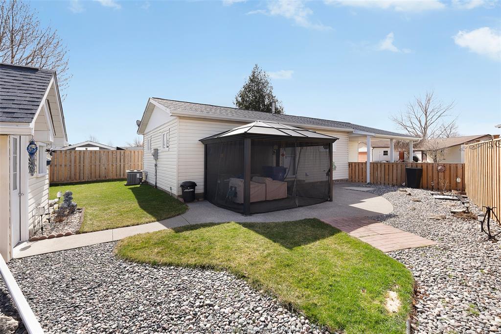 Welcome to 32 chestnut in hidden creek community in mcgregor (essex). Comfortable living in this well-maintained ranch style home in a quiet community. Spacious open layout of living room, dining and kitchen w/granite counters, 2 bedroom and 4pc bathroom is perfect for retirees or first time homebuyers. Private concrete driveway with carport, fully fenced low maintenance backyard with gazebo for entertaining and bbq'g and shed. Monthly association fee of $140 covers water, sewer, garbage collection, snow removal of common areas, plus access to the seasonal outdoor pool and clubhouse amenities. This is not a trailer- you own the home and the land. No leased land fees apply to this property! Centrally located just 15 min. From windsor, essex and amherstburg and all major shopping and big box stores. This home offers comfortable, affordable living with the convenience of being ready to move in!