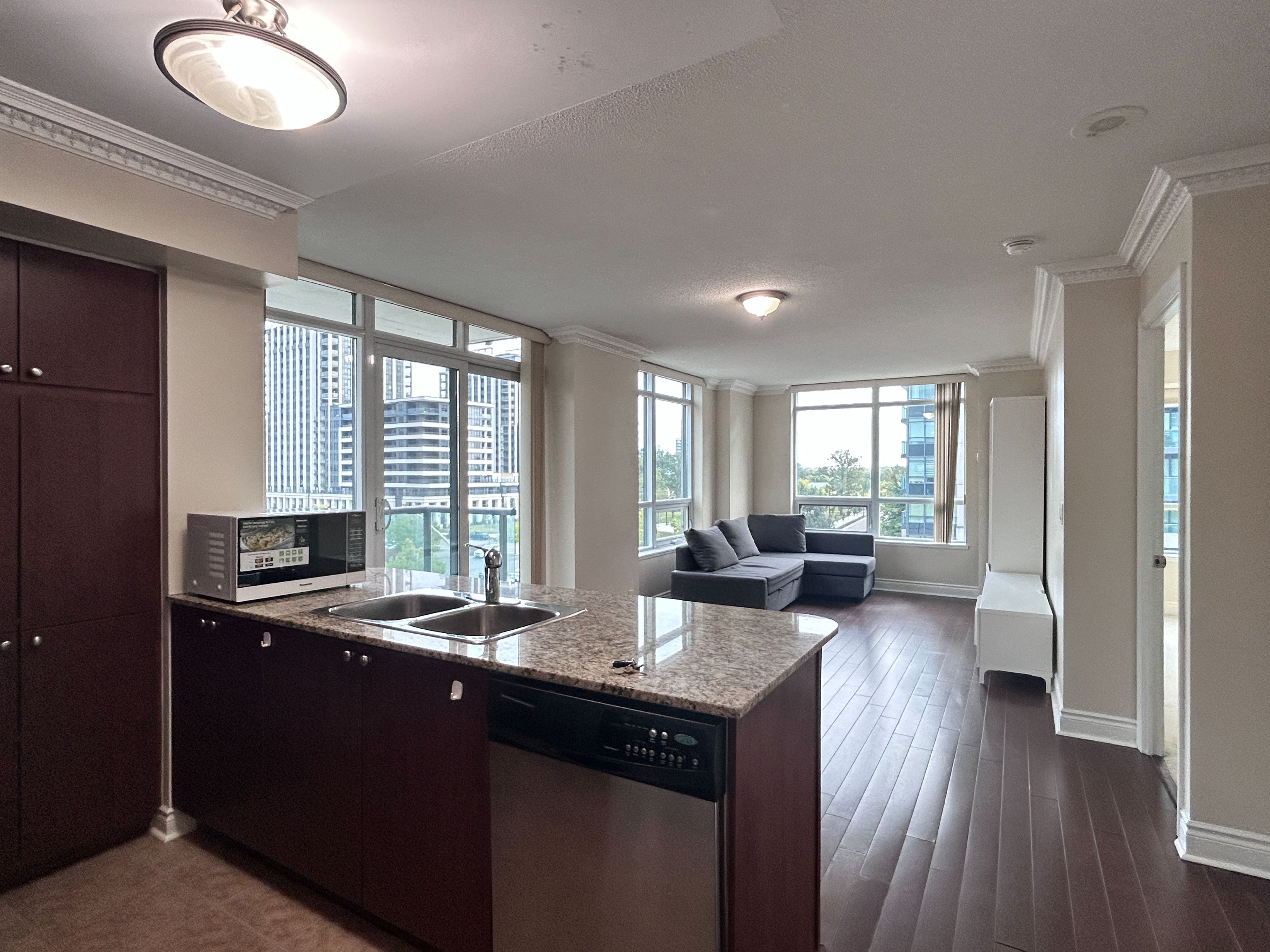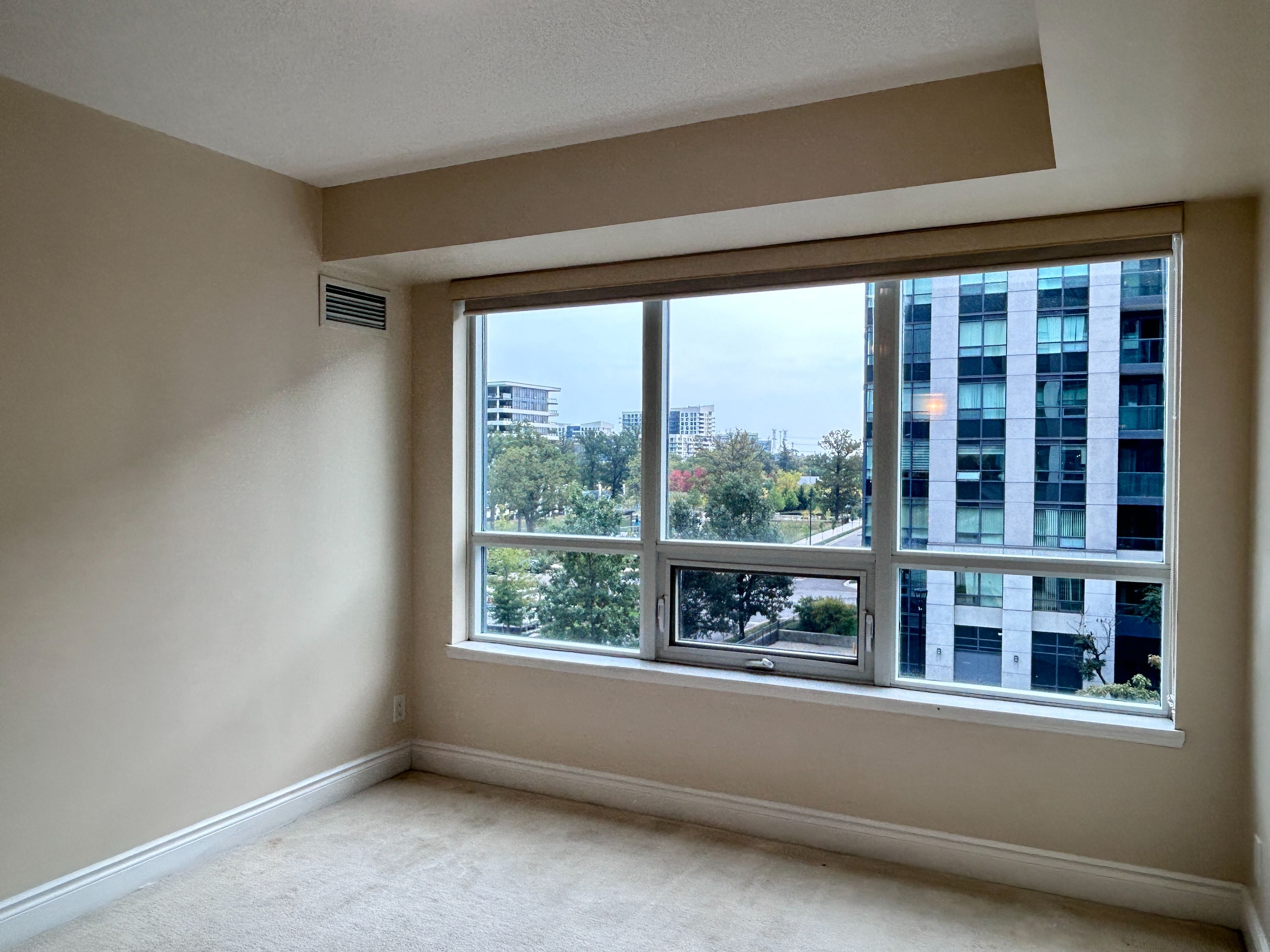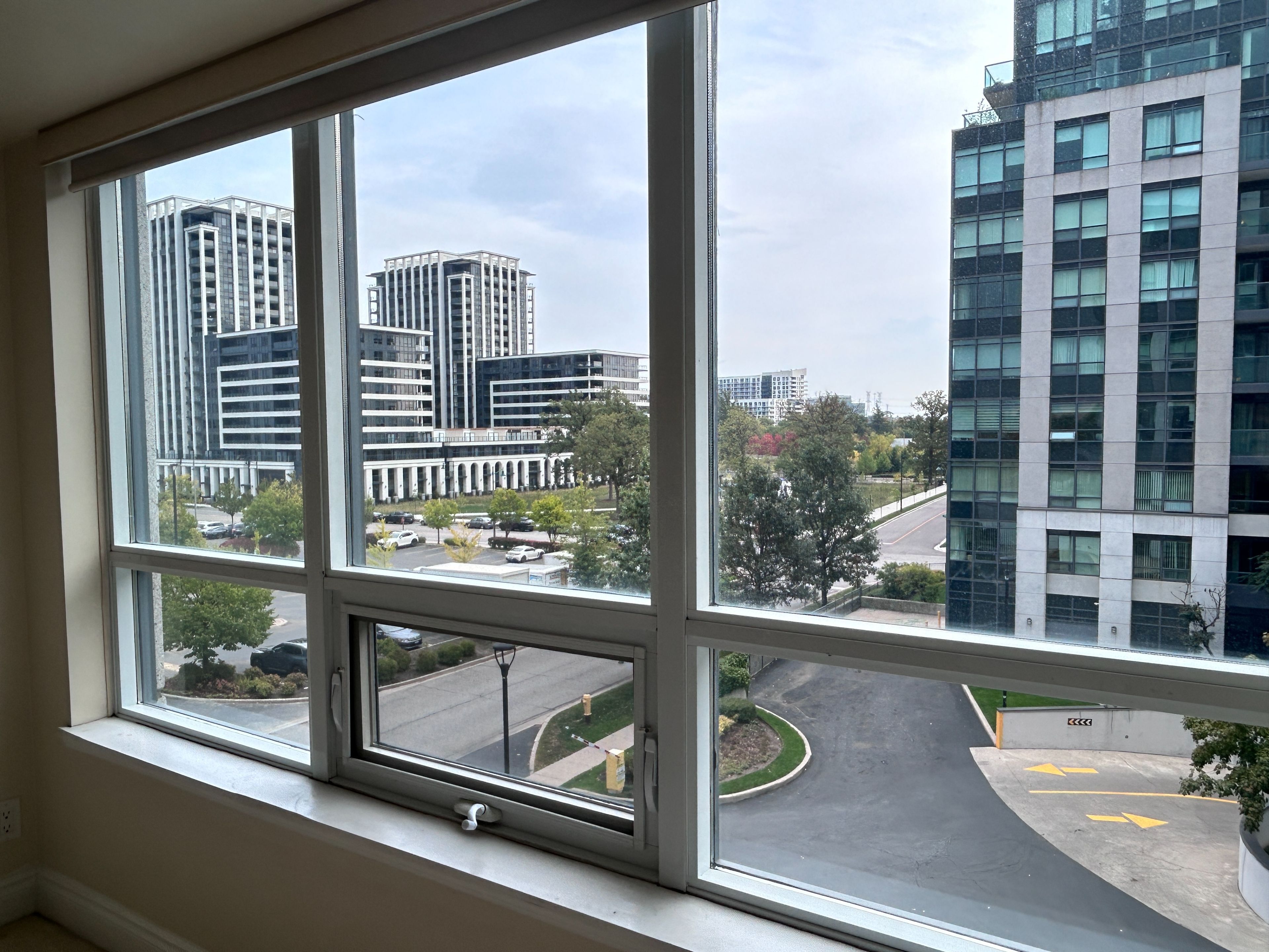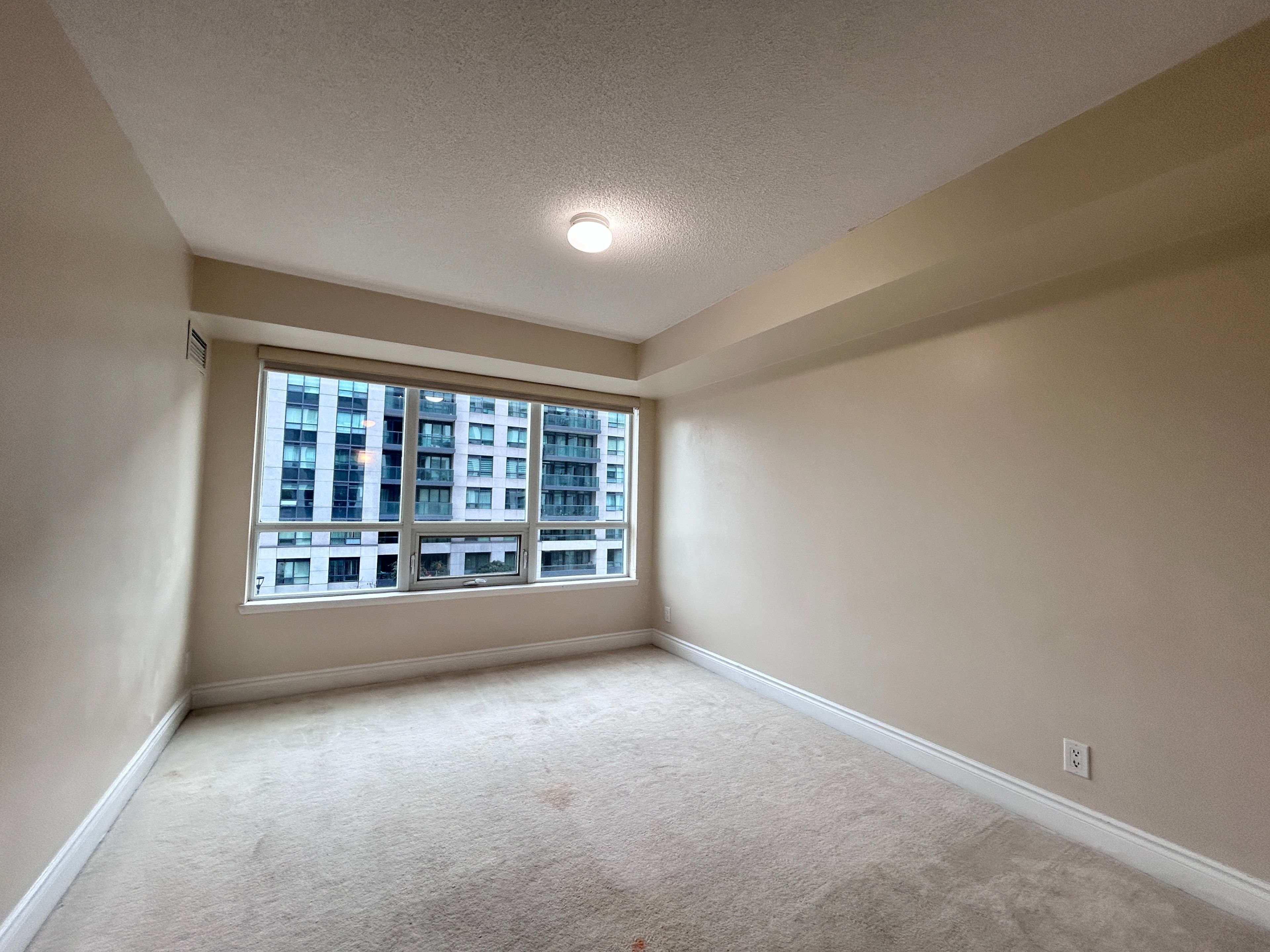 Bright and spacious modern corner unit with 2 split bedrooms, 2 full baths, approx 909 sq + balcony. One parking & one locker. Large windows in all rooms. Primary w/ 4pc ensuite. Located in the heart of the markham business centre. Convenient location. Steps to city hall, restaurant, office building, supermarket, hilton hotel, unionville high school, mins to hwy 404 &407. Tenant pays own hydro.