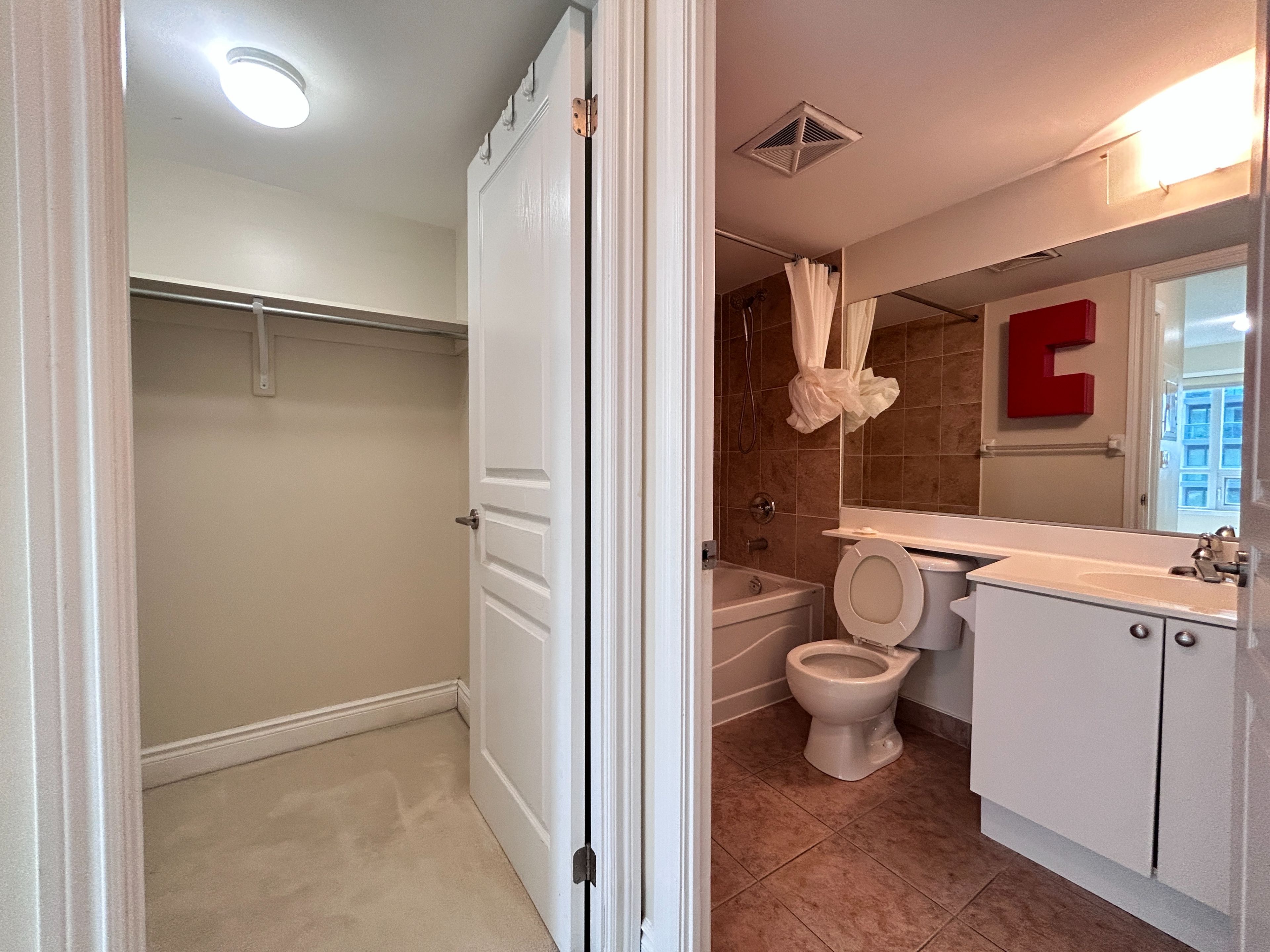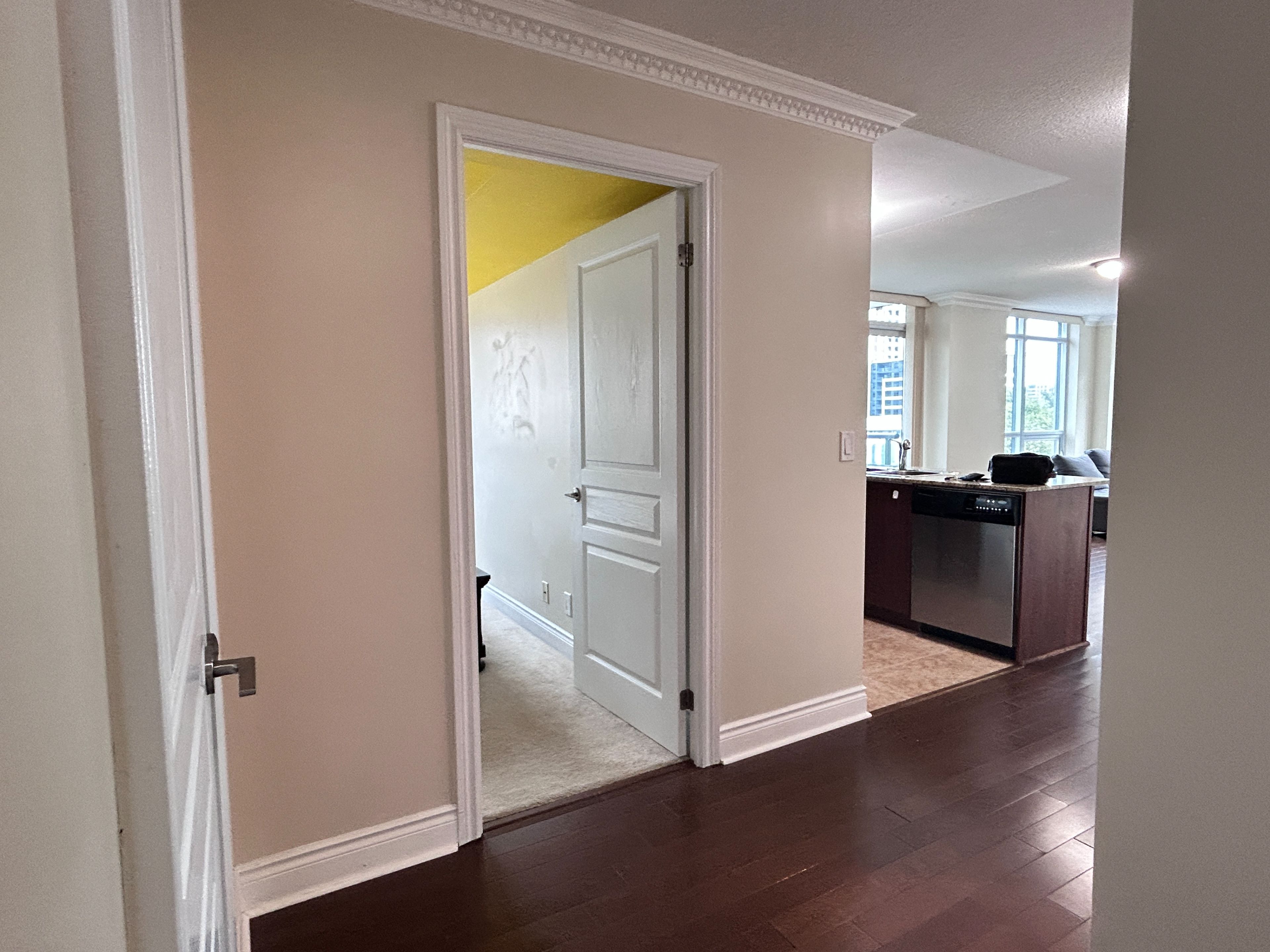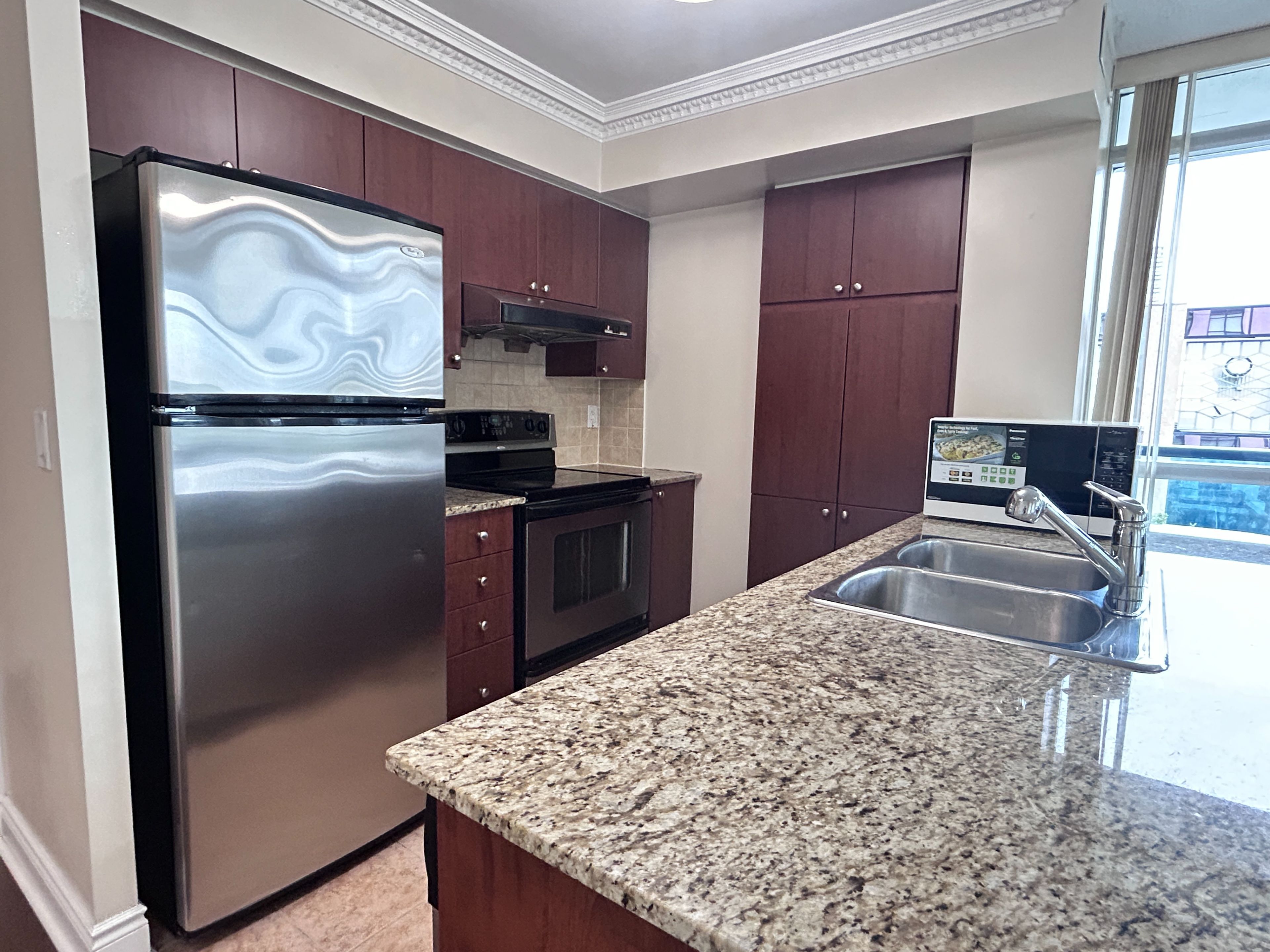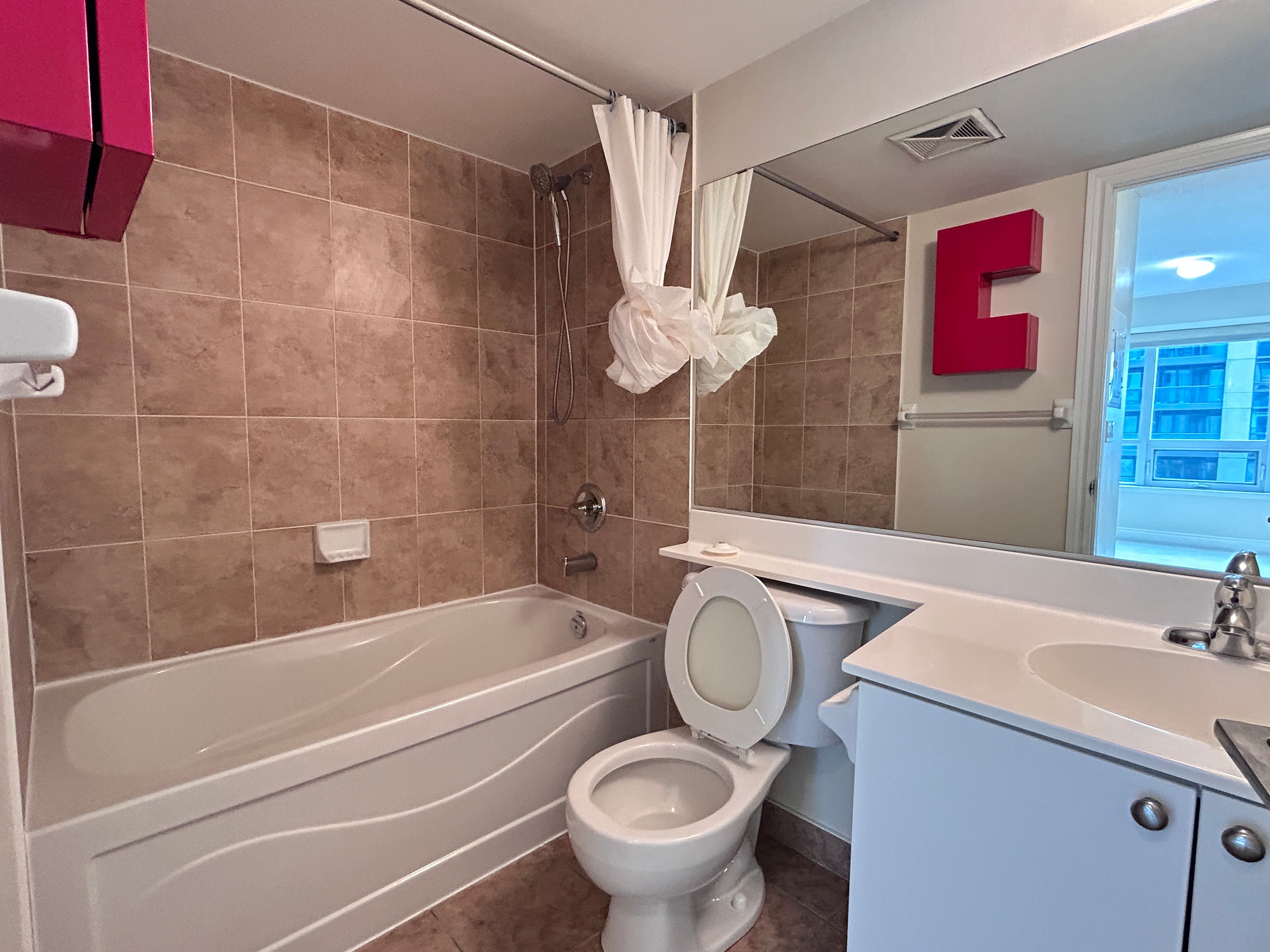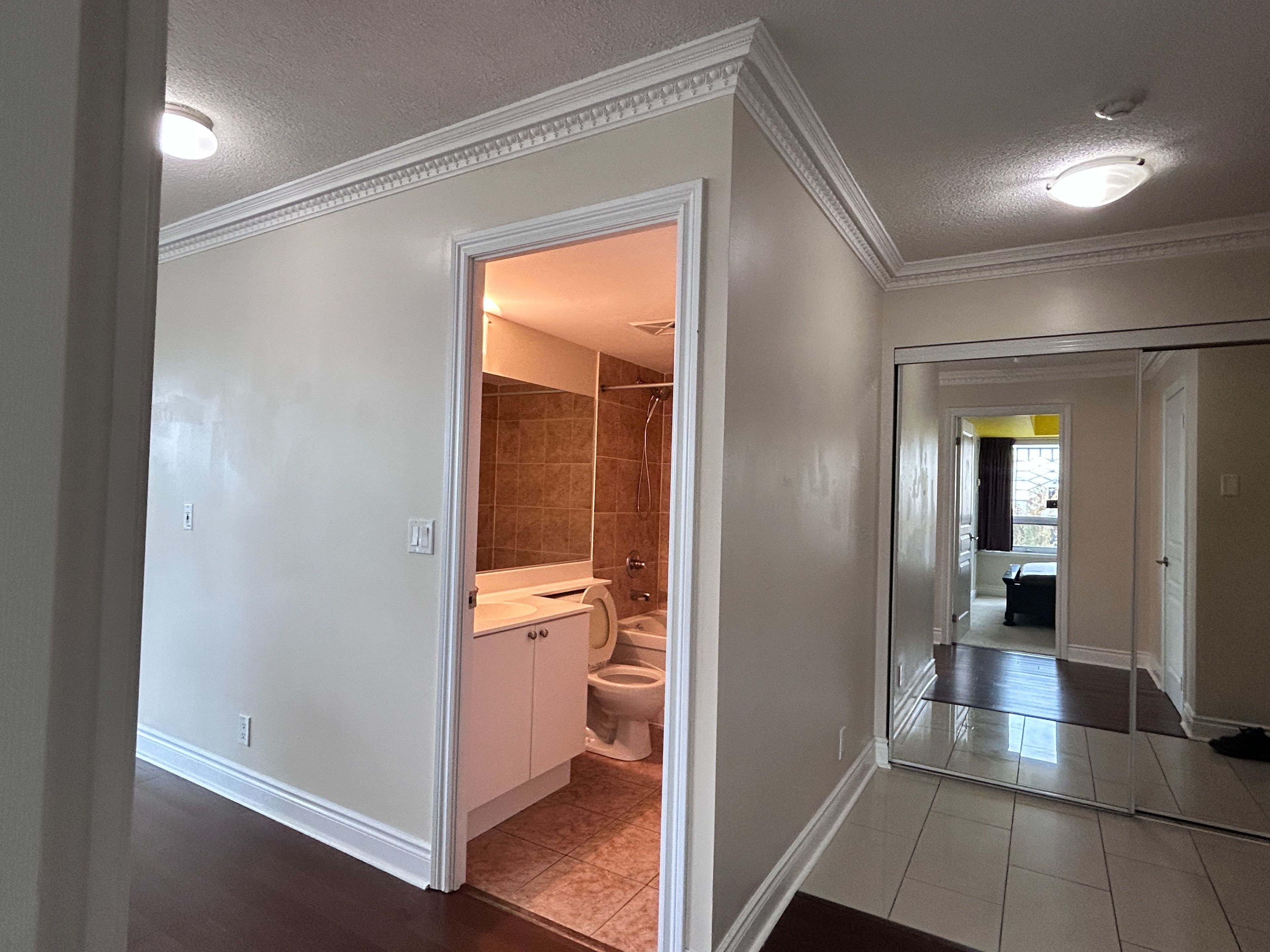 Bright and spacious modern corner unit with 2 split bedrooms, 2 full baths, approx 909 sq + balcony. One parking & one locker. Large windows in all rooms. Primary w/ 4pc ensuite. Located in the heart of the markham business centre. Convenient location. Steps to city hall, restaurant, office building, supermarket, hilton hotel, unionville high school, mins to hwy 404 &407. Tenant pays own hydro.