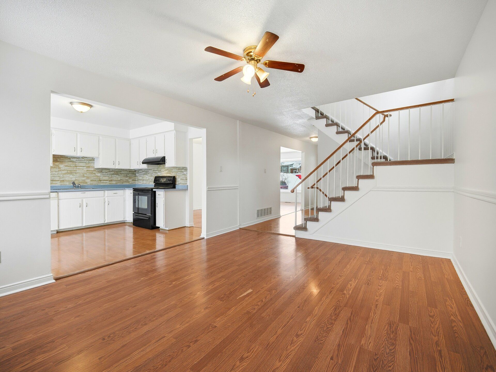 • Bright open-concept kitchen with French doors leading to a deck.