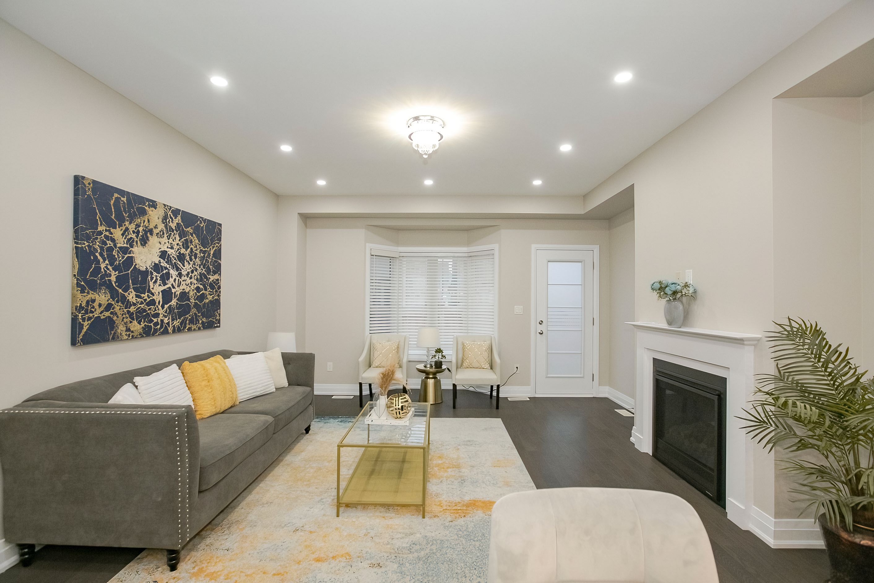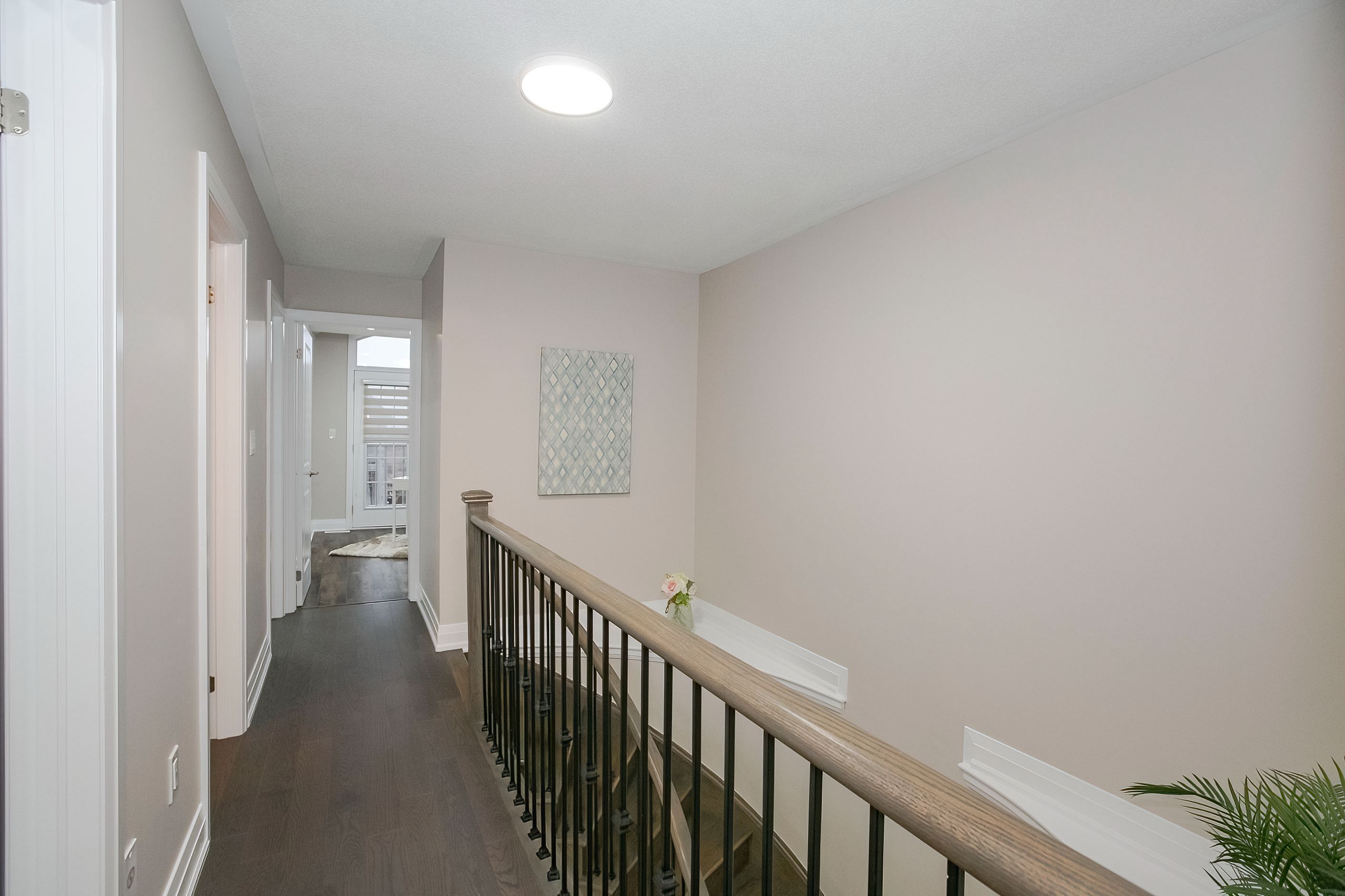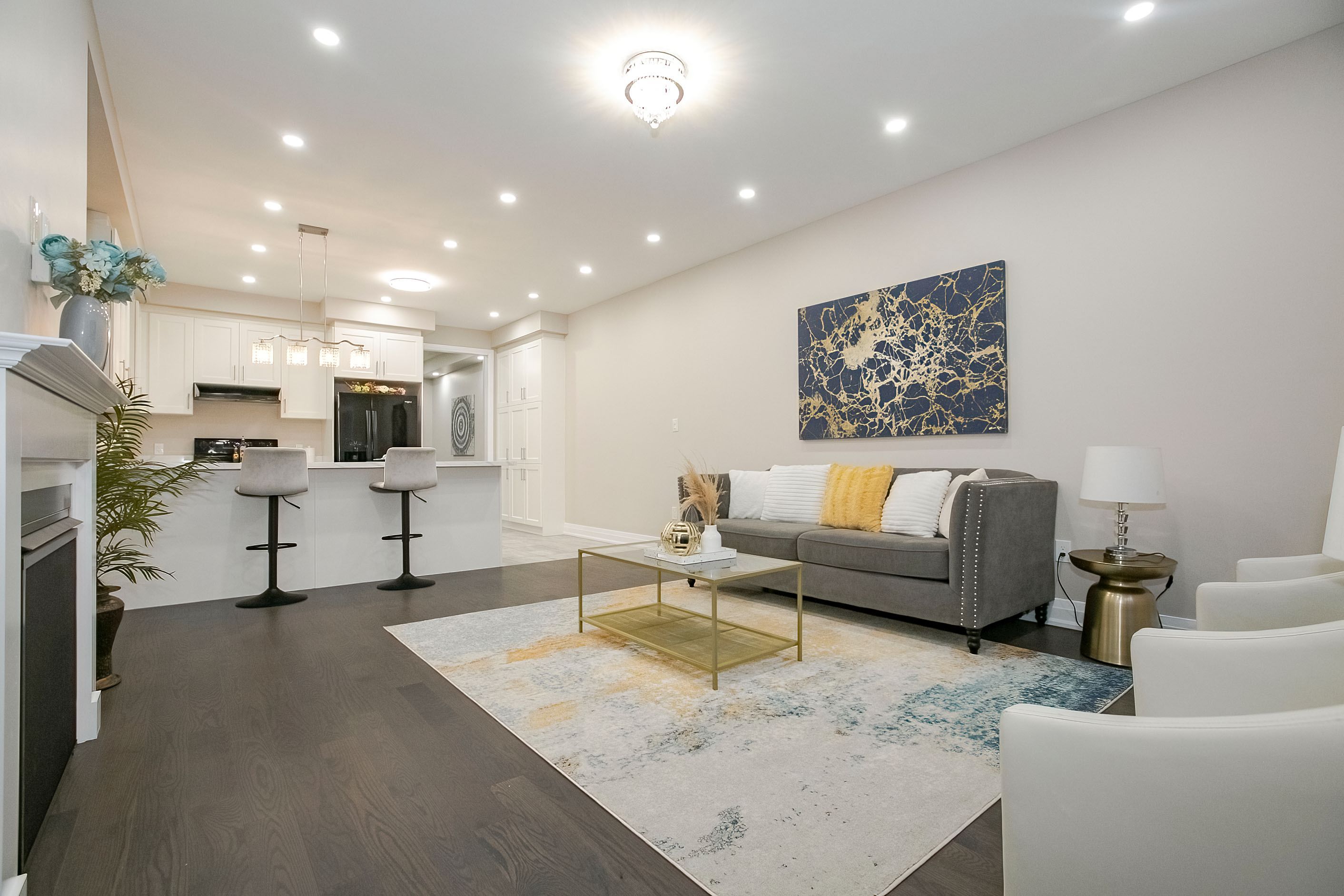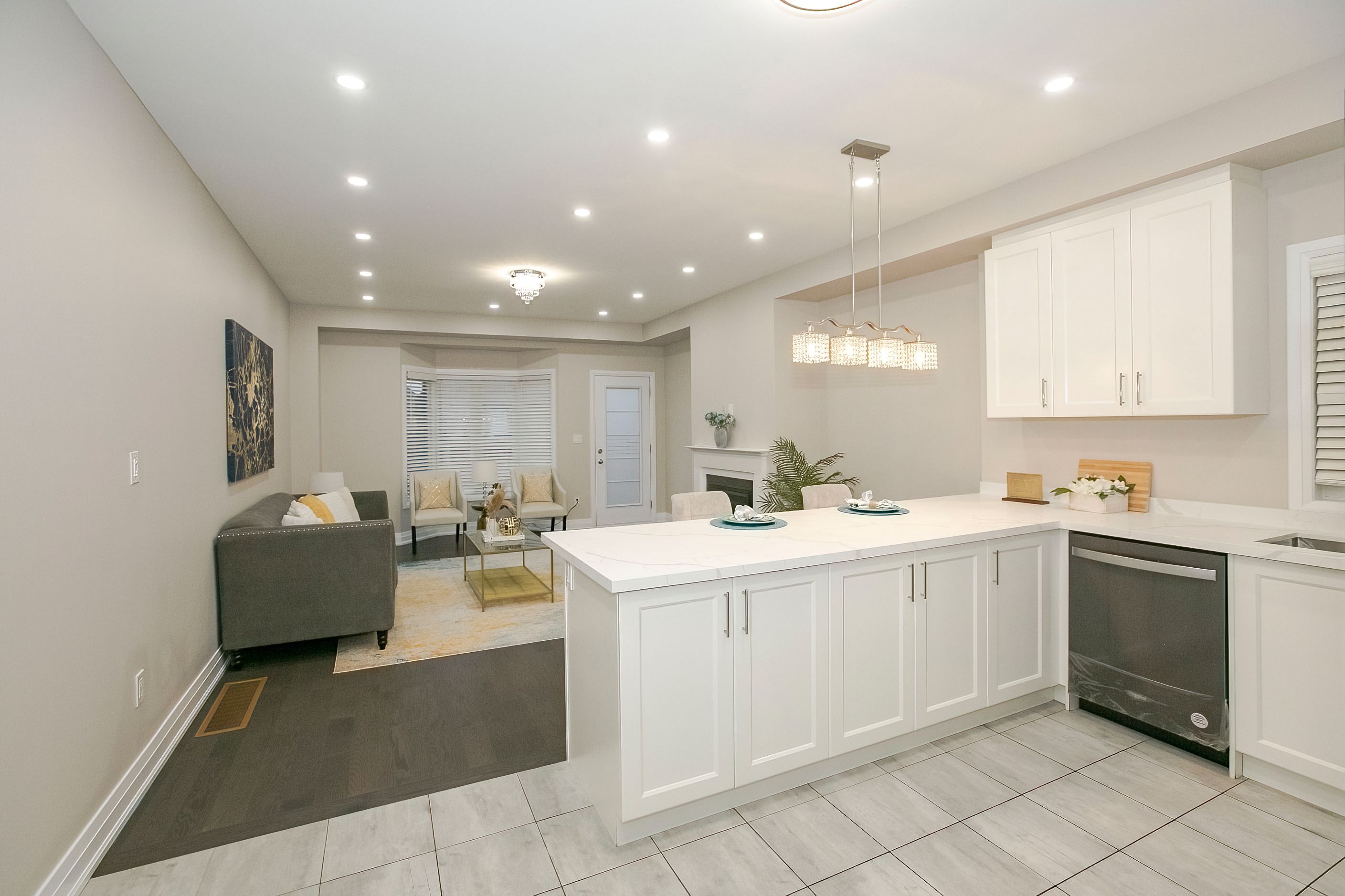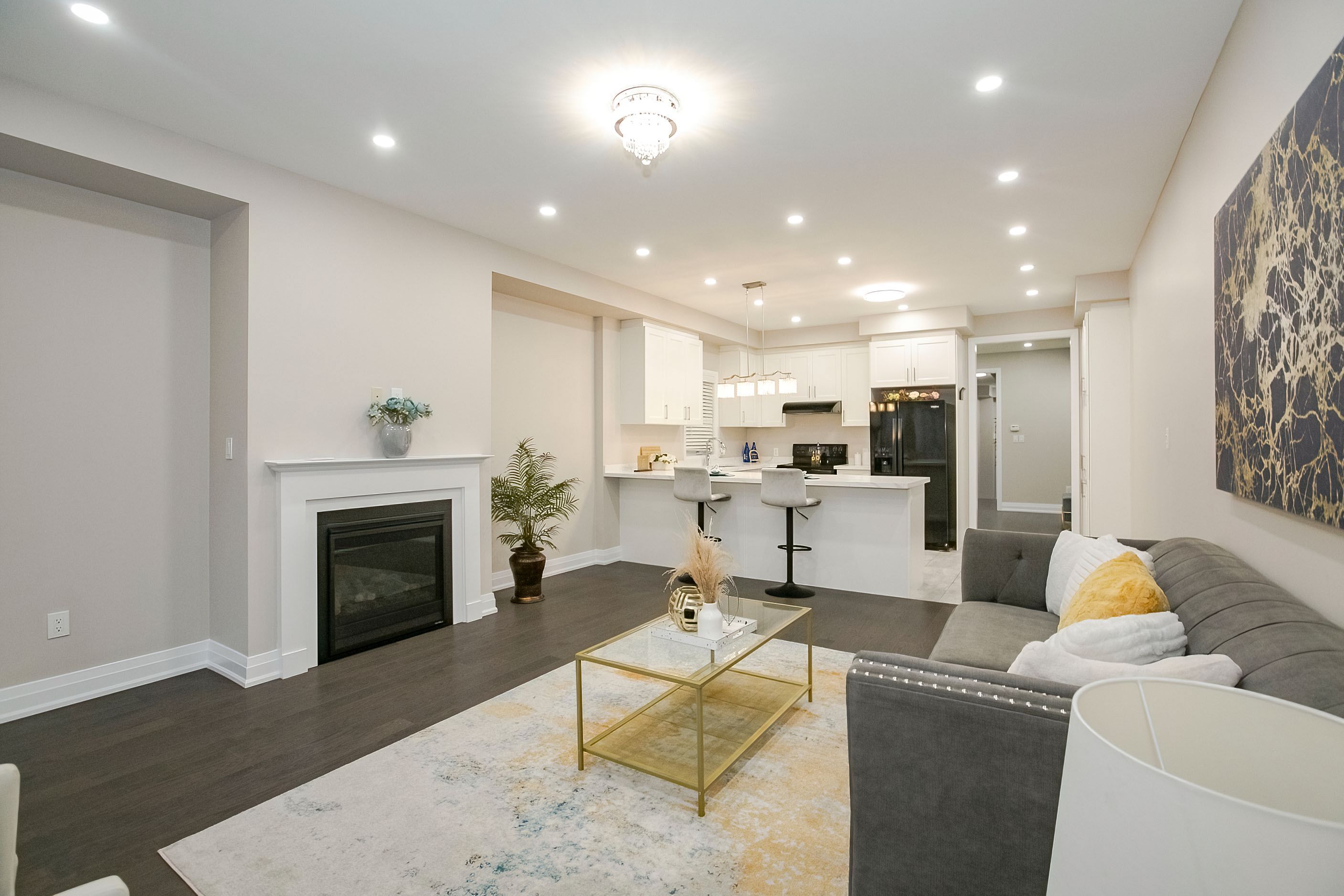 Welcome to this stunning 2-storey freehold townhouse by ashley oaks, offering approximately 2,300 sq. Ft. Of above-grade living space in one of bram west's most sought-after neighborhoods. This beautifully maintained, carpet-free home features soaring 9-foot ceilings on the main floor, enhanced with elegant pot lights that create a bright and modern ambiance throughout. Enjoy the versatility of separate living and family rooms, including a spacious family room with a cozy fireplace-perfect for both entertaining and everyday living. Elegant chandeliers in the living room, family room, and kitchen island add a touch of sophistication and luxury. The modern white high-gloss kitchen is a true showstopper, featuring upgraded quartz countertops, sleek black stainless steel appliances, and ample cabinetry for all your storage needs. Hardwood flooring enhances the main level, while the upper floor features durable laminate throughout. Upstairs, you'll find four generously sized bedrooms, all enhanced with pot lights, including a massive primary retreat with a private ensuite and his-and-hers walk-in closets. Quartz countertops continue in all washrooms, complemented by newly upgraded vanity lighting for a fresh, contemporary feel. The second bedroom also offers a walk-in closet, while the fourth bedroom features a walk-out to a private balcony. A convenient second-floor laundry room adds both functionality and extra storage. Flooded with natural light, this home offers a warm and inviting atmosphere from top to bottom. The fully fenced backyard provides privacy and space for outdoor enjoyment. Ideally located on a quiet street in a high-demand area, close to parks, public transit, and a large shopping plaza, with easy access to highways 401 & 407-perfect for commuters. A true move-in-ready gem loaded with upgrades-don't miss this incredible opportunity!